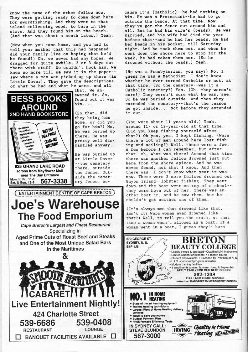 Published by Ronald Caplan on 1993/1/1 (223 reads)know the name of the other fellow now. They were getting ready to come down here for swordfishing. And they went to that island collecting wood, to burn in the stove. And they found him on the beach. (And that was about a month later.) Yeah. (Now when you came home, and you had to tell your mother that this had happened-- did your family live on hoping that he'd be found?) Oh, we never had any hopes. We dragged for quite awhile, 2 or 3 days out there with stuff. We couldn't hook him. We knew no more till we saw it in the paper-- saw where a man was picked up up there (in Little Dover). They gave the descriptions of what he had and what he wore, and all 'HBi''HH''Ha'HBM''iiH'H that. We an- 1swered it. So, J found out it was ??him.... BESS BOOKS AROUND 2ND HAND BOOKSTORE 825 GRAND LAKE ROAD across from Mayflower Mall near The Bay Entrance Mon. to Fri. 11-6 cc' OOOO Sat. & Sun. 12-4 OOi-OOOO (So then, did they bring him home, or did you go for him?) No, he was buried up there. He was pretty well dis? mantled anyway. He was buried up at Little Dover --the cemetery there, outside the fence. Out? side the cemet? ery fence, be- Joe's Warehouse The Food Emporium Cape Breton's Largest and Finest Restaurant Specializing in Aged Prime Cuts of Roast Beef and Steaks and One of tlie Most Unique Salad Bars in the Maritimes CABARET Live Entertainment Nightly! 424 Charlotte Street 539-6686 539-0408 RESTAURANT LOUNGE D BANQUET FACILITIES AVAILABLE D cause it's (Catholic)--he had nothing on him. He was a Protestant--he had to go outside the fence. At that time. Now they've got the fence out around him and all. But he had his wife's (beads). He was married, and his wife had died the year before that--and he had her beads. He had her beads in his pocket, till Saturday night. And he took them out, and when he went down the shore here to stop for the week, he had taken them out. (So he drowned without the beads.) Yeah. (He was a Presbyterian, you say?) No, I guess he was a Methodist. I don't know whether he ever turned Catholic or not, at that time. (So the cemetery--was it a Catholic cemetery?) Yes. (Oh, they weren't sure!) They weren't sure what he was, see. So he was buried outside. And then they extended the cemetery--that's the reason he got inside.... Not before they extended it out. (You were about 11 years old.) Yeah, around 11- or 12-year-old at that time. (Did you keep fishing yourself after that?) Oh yes, yes, I kept fishing. (Were there a lot of men around here lost fish? ing and sailing?) Well, there were a few. A few before I can remember, but after that--oh, what was there? Around that time there was another fellow drowned just out here from the shore apiece. And he was never found, not that I know. And then there was--I don't know what year it was now. There were 2 more fellows drowned out Guyon Island--lobster fishing. They went down and the boat went on top of a shoal-- they were hove out of her. There was an? other boat in, and he saw them, but he couldn't get neither one of them. (It's always men that drowned like that, isn't it? Were women ever drowned like that?) Well, to tell you the truth, at that time a woman wasn't allowed in a boat. If a woman went in a boat, I guess they'd burn 270 GEORGE ST. SYDNEY, N. S. B1P1J6 BRETON BEAUTY COLLEGE ' Locally owned & operated • Qualified MHI instructors Limited student enrollment • 8-month course Student aid available • Licensed by Province of N. S. ' U.i.C. sponsored program available ' Modem training facilities 3 enrollments a year: January, June, & September APPLY EARLY FOR OUR NEXT COURSE 562-1208 IIA 1 IN HOME llUtI HEATING • state of the art heating equipment • Trained heating technicians • Largest Fleet of Home Heating delivery vehicles • Ways to save you money • Budget Payment Plan • FREE Furnace Efficiency Tests IN SYDNEY CALL: STEVE BLUNDON I IRVING 567-3000 '''