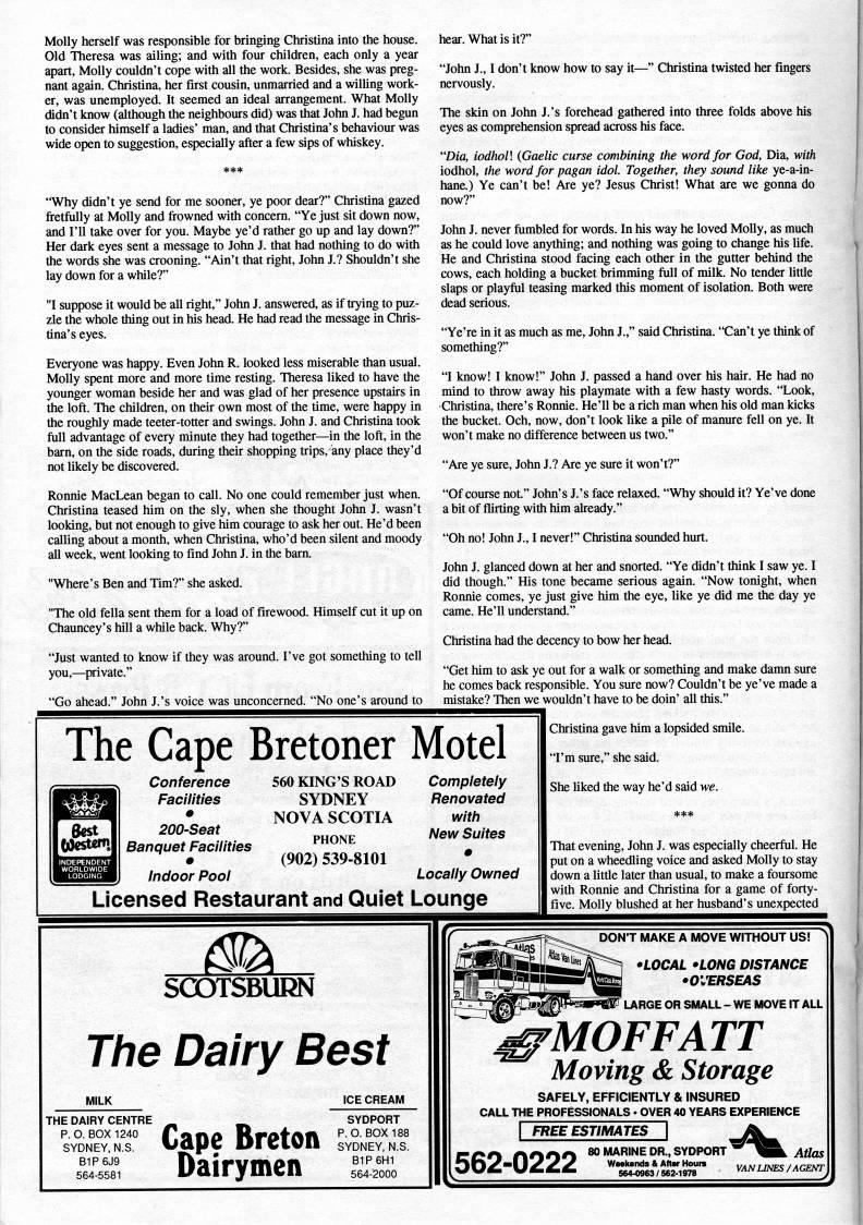 Molly herself was responsible for bringing Christina into the house. Old Theresa was ailing; and with four children, each only a year apart, Molly couldn't cope with all the work. Besides, she was preg? nant again. Christina, her first cousin, unmarried and a willing work? er, was unemployed. It seemed an ideal arrangement. What Molly didn't know (although the neighbours did) was that John J. had begun to consider himself a ladies' man, and that Christina's behaviour was wide open to suggestion, especially after a few sips of whiskey. "Why didn't ye send for me sooner, ye poor dear?" Christina gazed fretfully at Molly and frowned with concern. "Ye just sit down now, and I'll take over for you. Maybe ye'd rather go up and lay down?" Her dark eyes sent a message to John J. that had nothing to do with the words she was crooning. "Ain't that right, John J.? Shouldn't she lay down for a while?" "I suppose it would be all right," John J. answered, as if trying to puz? zle the whole thing out in his head. He had read the message in Chris? tina's eyes. Everyone was happy. Even John R. looked less miserable than usual. Molly spent more and more time resting. Theresa liked to have the younger woman beside her and was glad of her presence upstairs in the loft. The children, on their own most of the time, were happy in the roughly made teeter-totter and swings. John J. and Christina took fiiU advantage of every minute they had together • in the loft, in the barn, on the side roads, during their shopping frips, any place they'd not likely be discovered. Ronnie MacLean began to call. No one could remember just when. Christina teased him on the sly, when she thought John J. wasn't looking, but not enough to give him courage to ask her out. He'd been calling about a month, when Christina, who'd been silent and moody all week, went looking to find John J. in the barn. "Where's Ben and Tim?" she asked. "The old fella sent them for a load of firewood. Himself cut it up on Chauncey's hill a while back. Why?" "Just wanted to know if they was around. I've got something to tell you, • private." "Go ahead." John J.'s voice was unconcerned. "No one's around to hear. What is it?" "John J., I don't know how to say it • " Christina twisted her fingers nervously. The skin on John J.'s forehead gathered into three folds above his eyes as comprehension spread across his face. "Dia, iodhoV. (Gaelic curse combining the word for God, Dia, with iodhol, the word for pagan idol. Together, they sound lilce ye-a-in- hane.) Ye can't be! Are ye? Jesus Christ! What are we gonna do now?" John J. never ftimbled for words. In his way he loved Molly, as much as he could love anything; and nothing was going to change his life. He and Christina stood facing each other in the gutter behind the cows, each holding a bucket brimming full of milk. No tender little slaps or playful teasing marked this moment of isolation. Both were dead serious. "Ye're in it as much as me, John J.," said Christina. "Can't ye think of something?" "I know! I know!" John J. passed a hand over his hair. He had no mind to throw away his playmate with a few hasty words. "Look, Christina, there's Ronnie. He'll be a rich man when his old man kicks the bucket. Och, now, don't look like a pile of manure fell on ye. It won't make no difference between us two." "Are ye sure, John J.? Are ye sure it won't?" "Of course not." John's J.'s face relaxed. "Why should it? Ye've done a bit of flirting with him already." "Oh no! John J., I never!" Christina sounded hurt. John J. glanced down at her and snorted. "Ye didn't think I saw ye. I did though." His tone became serious again. "Now tonight, when Roimie comes, ye just give him the eye, like ye did me the day ye came. He'll understand." Christina had the decency to bow her head. "Get him to ask ye out for a walk or something and make damn sure he comes back responsible. You sure now? Couldn't be ye've made a mistake? Then we wouldn't have to be doin' all this." The Cape Bretoner Motel Conference Facilities • 200-Seat Banquet Facilities m Indoor Pool 560 KING'S ROAD SYDNEY NOVA SCOTIA PHONE (902) 539-8101 Completely Renovated with New Suites Locally Owned Licensed Restaurant and Quiet Lounge Christina gave him a lopsided smile. "I'm sure," she said. She liked the way he'd said we. That evening, John J. was especially cheerful. He put on a wheedling voice and asked Molly to stay down a little later dian usual, to make a foursome with Ronnie and Christina for a game of forty- five. Molly blushed at her husband's unexpected m. SCOTSBURN The Dairy Best MILK THE DAIRY CENTRE P.O. BOX 1240 SYDNEY. N.S. B1P6J9 564-5581 Cape Breton Dairymen ICE CREAM SYDPORT P.O. 80X188 SYDNEY, N.S. B1P6H1 564-2000 DON'T MAKE A MOVE WITHOUT US! ' • LOCAL • LONG DISTANCE • OVERSEAS LARGE OR SMALL - WE MOVE IT ALL 'MOFFATT Moving & Storage SAFELY, EFFICIENTLY & INSURED CALL THE PROFESSIONALS • OVER 40 YEARS EXPERIENCE FREE ESTIMATES 562-0222 80 MARINE DR., SYDPORT WMkands & Altar Hours 564-0963/562-1978 Adas VAN LINES/AGENT