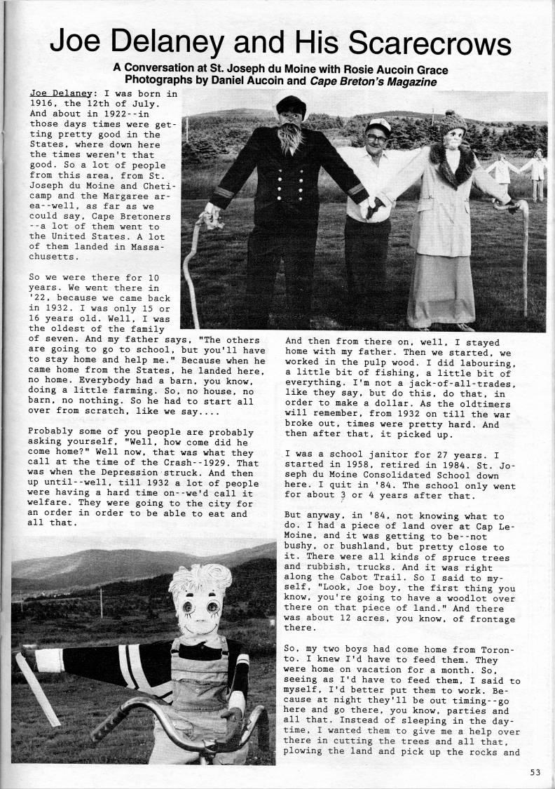 Published by Ronald Caplan on 1993/1/1 (980 reads)Joe Delaney and His Scarecrows A Conversation at St. Joseph du Moine with Rosie Aucoin Grace Photographs by Daniel Aucoin and Cape Breton's Magazine Joe Delaney: I was born in 1916. the 12th of July. And about in 1922--in those days times were get? ting pretty good in the States. where down here the times weren't that good. So a lot of people from this area, from St. Joseph du Moine and Cheti? camp and the Margaree ar? ea- -well, as far as we could say. Cape Bretoners --a lot of them went to the United States. A lot of them landed in Massa? chusetts . So we were there for 10 years. We went there in '22, because we came back in 1932. I was only 15 or 16 years old. Well, I was the oldest of the family of seven. And my father says, "The others are going to go to school, but you'll have to stay home and help me." Because when he came home from the States, he landed here, no home. Everybody had a barn, you know, doing a little farming. So, no house, no barn, no nothing. So he had to start all over from scratch, like we say.... Probably some of you people are probably asking yourself, "Well, how come did he come home?" Well now, that was what they call at the time of the Crash--1929. That was when the Depression struck. And then up until--well, till 1932 a lot of people were having a hard time on--we'd call it welfare. They were going to the city for an order in order to be able to eat and all that. And then from there on, well, I stayed home with my father. Then we started, we worked in the pulp wood. I did labouring, a little bit of fishing, a little bit of everything. I'm not a jack-of-all-trades, like they say, but do this, do that, in order to make a dollar. As the oldtimers will remember, from 1932 on till the war broke out, times were pretty hard. And then after that, it picked up. I was a school janitor for 27 years. I started in 1958, retired in 1984. St. Jo? seph du Moine Consolidated School down here. I quit in '84. The school only went for about 3 or 4 years after that. But anyway, in '84, not knowing what to do, I had a piece of land over at Cap Le- Moine, and it was getting to be--not bushy, or bushland, but pretty close to it. There were all kinds of spruce trees and rubbish, trucks. And it was right along the Cabot Trail. So I said to my? self, "Look, Joe boy, the first thing you know, you're going to have a woodlot over there on that piece of land." And there was about 12 acres, you know, of frontage there. So, my two boys had come home from Toron? to. I knew I'd have to feed them. They were home on vacation for a month. So, seeing as I'd have to feed them, I said to myself, I'd better put them to work. Be? cause at night they'll be out timing--go here and go there, you know, parties and all that. Instead of sleeping in the day? time, I wanted them to give me a help over there in cutting the trees and all that, plowing the land and pick up the rocks and