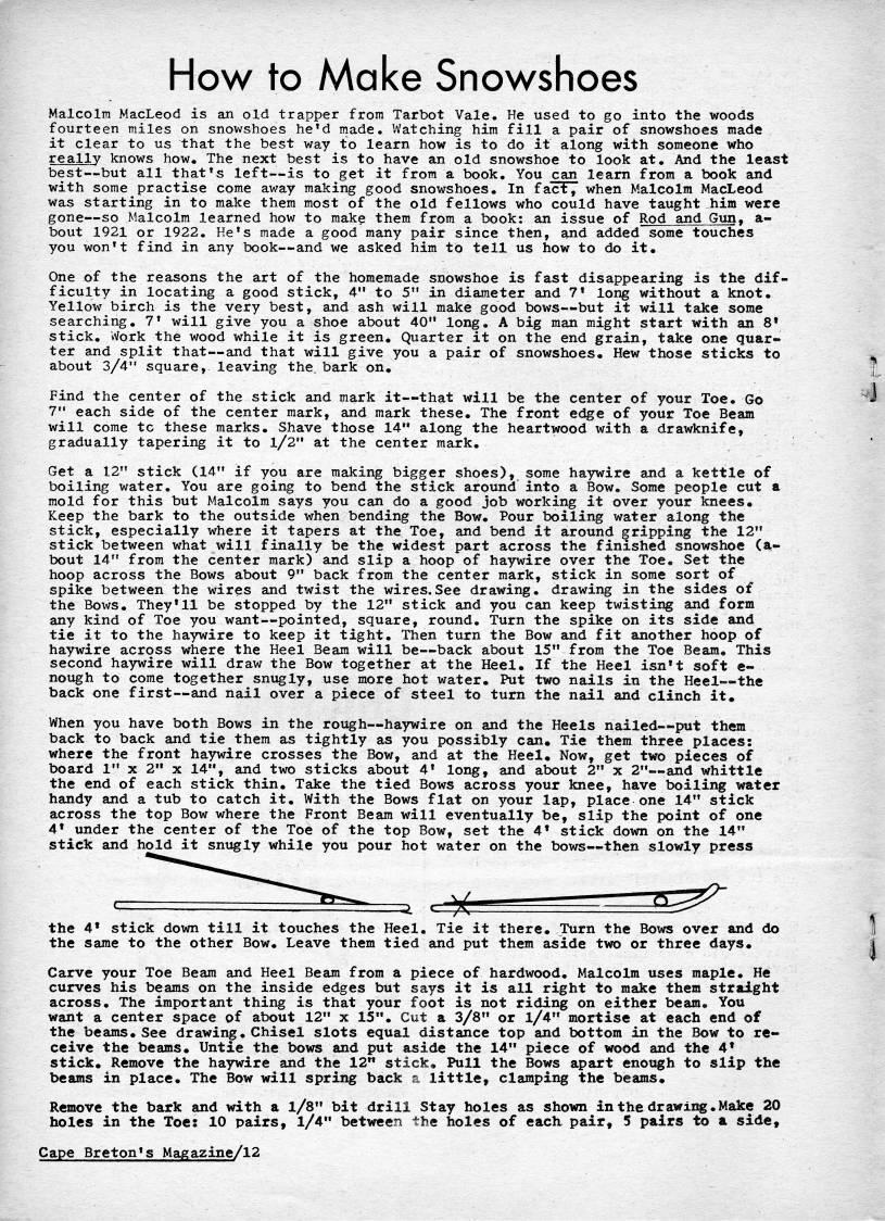 Published by Ronald Caplan on 1973/1/1 (9167 reads)How to Make Snowshoes Malcolm MacLeod is an old trapper from Tarbot Vale. He used to go into the woods fourteen miles on snowshoes he'd made. Watching him fill a pair of snowshoes made it clear to us that the best way to learn how is to do it along with someone who really knows how. The next best is to have an old snowshoe to look at. And the least best • but all that's left • is to get it from a book. You can learn from a book and with some practise come away making good snowshoes. In fact, when Malcolm MacLeod was starting in to make them most of the old fellows who could have taught him were gone • so Malcolm learned how to make them from a book: an issue of Rod and Gun, a- bout 1921 or 1922. He's made a good many pair since then, and added some touches you won't find in any book • and we asked him to tell us how to do it. One of the reasons the art of the homemade snowshoe is fast disappearing is the dif? ficulty in locating a good stick, 4" to 5" in diameter and 7' long without a knot. Yellow birch is the very best, and ash will make good bows • but it will take some searching. 7' will give you a shoe about 40" long. A big man might start with an 8' stick. Work the wood while it is green. Quarter it on the end grain, take one quar? ter and split that • and that will give you a pair of snowshoes. Hew those sticks to about 3/4" square, leaving the. bark on. Find the center of the stick and mark it • that will be the center of your Toe. Go 7" each side of the center mark, and mark these. The front edge of your Toe Beam will come tc these marks. Shave those 14" along the heartwood with a drawknife, gradually tapering it to l/2" at the center mark. Get a 12" stick (14" if you are making bigger shoes), some haywire and a kettle of boiling water. You are going to bend the stick aronnd into a Bow. Some people cut a mold for this but Malcolm says you can do a good job working it over your knees. Keep the bark to the outside when bending the Bow. Pour boiling water along the stick, especially where it tapers at the Toe, and bend it around gripping the 12" stick between what will finally be the widest part across the finished snowshoe (a- bout 14" from the center mark) and slip a hoop of haywire over the Toe. Set the hoop across the Bows about 9" back from the center mark, stick in some sort of spike between the wires and twist the wires.See drawing, drawing in the sides of the Bows. They'll be stopped by the 12" stick and you can keep twisting and form any kind of Toe you want • pointed, square, round. Turn the spike on its side and tie it to the haywire to keep it tight. Then turn the Bow and fit another hoop of haywire across where the Heel Beam will be • back about 15" from the Toe Beam. This second haywire will draw the Bow together at the Heel. If the Heel isn't soft e- nough to come together snugly, use more hot water. Put two nails in the Heel • the back one first • and nail over a piece of steel to turn the nail and clinch it. When you have both Bows in the rough • haywire on and the Heels nailed • put them back to back and tie them as tightly as you possibly can. Tie them three places: where the front haywire crosses the Bow, and at the Heel. Now, get two pieces of board 1" x 2" x 14", and two sticks about 4' long, and about 2" x 2" • and whittle the end of each stick thin. Take the tied Bows across your knee, have boiling water handy and a tub to catch it. With the Bows flat on your lap, place one 14" stick across the top Bow where the Front Beam will eventually be, slip the point of one 4?? under the center of the Toe of the top Bow, set the 4?? stick down on the 14" stick and hold it snugly while you pour hot water on the bows • then slowly press the 4' stick down till it touches the Heel. Tie it there. Turn the Bows over and do the same to the other Bow. Leave them tied and put them aside two or three days. Carve your Toe Beam and Heel Beam from a piece of hardwood. Malcolm uses maple. He curves his beams on the inside edges but says it is all right to make them straight across. The important thing is that your foot is not riding on either beam. You want a center space of about 12" x 15". Cut a 3/8" or 1/4" mortise at each end of the beams. See drawing. Chisel slots equal distance top and bottom in the Bow to re? ceive the beams. Untie the bows and put aside the 14" piece of wood and the 4' stick. Remove the haywire and the 12" stick. Pull the Bows apart enough to slip the beams in place. The Bow will spring back a little, clamping the beams. Remove the bark and with a l/8" bit drill Stay holes as shown in the drawing.Make 20 holes in the Toe: 10 pairs, 1/4" between the holes of each pair, 5 pairs to a side. Cape Breton's Magazine/12