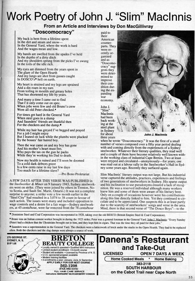 Work Poetry of John J. "Slim" Maclnnis From an Article and Interviews by Don MacGillivray "Doscomocracy" My back is bent from a lifetime spent In the dirt and steam and snow • In the General Yard, where the work is hard And the wages mean and low. My hands are swelled from the spades I've held In the depths of a dirty ditch And my shoulders sprung from the picks I've swung In the toils of the idle rich. My eyes are dimmed from the years spent in The glare of the Open Hearth And my lungs are shot from gasses caught In DOSCO's' hell on earth. My heart is strained and my legs are sprained And a din roars in my ears From toiling in moulds and greasy holes That has shortened my life by years. And many a time I came out to find That I'd only come out on spec. When jobs were few and old Bruno's crew Were all old Peter checked.* For times get hard in the General Yard When steel goes in a slump And Saunders' friends are thankful then For the checkers and the dump.* While my hair has greyed I've begged and prayed For a job I might enjoy But I leaned on luck while the plumbs were plucked By the bosses' fair haired boy. Then the war came on and my boy has gone And his mother's heart must fret. Who pays the tax on the gun he packs While they're working his Dad to death. Now my health is ruined and I'll soon be doomed To a cold dark debtors grave Is a few cents raise in my last few days Too much for a lifetime slave? • Pro Bono Proletariat A FEW DAYS AFTER THIS VERSE WAS PUBLISHED in the Steelworker & Miner on 9 January 1943, Sydney steel work? ers went on strike. (They were joined by others in Trenton, No? va Scotia, and Sault Ste. Marie, Ontario.) It was not a complete surprise to anyone; a strike vote a few month earlier in the "Steel City" had resulted in a 3,074 to 38 count in favour of such action. The issues were many and included opposition to wage controls and a desire for a fair wage • Sydney steelwork- ers, at 45 cents/hour, were far removed from the 78 cents/hour paid to their John J. Maclnnis cracy sug? gests they were deter? mined to improve their con? dition dur? ing the ex? panding war economy. John J. "Slim" Maclnnis had been back work? ing at the steel plant in Sydney for about three years when he wrote "Doscomocracy." It was the first of a small number of verses composed over a fifty year period dealing with and coming directiy from the experiences of a Sydney steelworker. Whatever their literary qualities, they read well and a couple of them have become relatively well known with? in the working class of industrial Cape Breton. Two at least were retyped and circulated • anonymously • for years; one was read out at a labour rally in the Steelworker's Hall in Syd? ney some years ago. Recently they surfaced again. Slim Maclnnis' literary output was not large. But his industrial verse captured the attitudes, practices, experiences and feelings of two generations of steelworkers in Sydney. His sparse output and his inclination to use pseudonyms ensured a lack of recog? nition. He was a reserved individual although many workers knew him and some of them were aware of his literary bent. Only on a couple of occasions however were his contributions along this line directiy linked to him. Yet they continued to cir? culate and to be appreciated. One suspects this is at least partly due to the scarcity of steelworkers' songs and verse in the area. Mind, there is that second verse of "The Dosco Boys" • to the ' Dominion Steel and Coal Corporation was incorporated in 1928, taking over the old BESCO (British Empire Steel & Coal Corporation). Bruno was an Italian cement worker brought in during the 1923 strike; Peter was a general foreman in the General Yard. John J. Maclnnis: "Every Sunday (Peter) had a chicken that the Ukrainians brought out to him, and they kept him in cigars. That was the time they all paid for their jobs." Saunders was a superintendent in the General Yard. The checkers were a latticework of brick under the stacks in the Open Hearth. They had to be replaced often. Both the checkers and the slag dumps were always a source of work. 270 GEORGE ST. SYDNEY, N. S. B1P1J6 BRETON BEAUTY COLLEGE Locally owned & operated • Qualified MHI instructors ' Limited student enrollment • 8-month course ' Student aid available • Licensed by Province of N. S. ' U.I.C. sponsored program available ?? Modem training facilities ' 3 enrollments a year January, June, & September APPLY EARLY FOR OUR NEXT COURSE 562-1208 (FAX 562-4104) RJLL HAIR CARE SERVICE Instructors: MARGARET McVICAR/GERRY CONDON Danena's Restaurant and Take-Out LICENSED OPEN 7 DAYS A WEEK ( Home Cooked Meals * Home Baking ) 383-2118 SOUTH HARBOUR on the Cabot Trail near Cape North