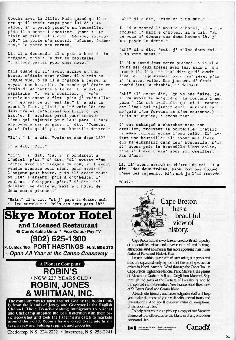 Couche avec la fille. Mais quand qu'il a cru qu'il 6tait temps pour lui d' s'en aller. i' a pass6 prend'e sa bouteille. p'is il a mont' 1'escalier. Quand il ar- rivit en haut, il a dit: "C'zame. rouvre- toU," la porte s'a rouvri, "c'zame, farme- toS." la porte s'a farm'e. Lk. il a descendu. il a pris k bord d' la fr'gade. p'is il a dit au capitaine. "J'allons partir pour chez nous." Mais quand qu'il' avont arrivd un bon boute. c'6tait tout calme, il a pris sa longue-vue, p'is il a r'gard' k terre. i' voyait une bataille. Du monde qu' 6tait en frais d' se batt'e k terre. I' a dit au capitaine. "J' va's mouiller, j' va's mett' e un canot ci flot, p'is j' va's aller voir qu'est-ce qu' est 1'." I' a mis un canot k flot, p'is i' a 't4 voir 1': ses deux frdres qu''taient en frais d' se batt'e. I' avaient parti pour trouver l'eau qui rajeunit pour leu' p4re. I 's'a approch' k ras un gars, i' dit, "Comment ga s' fait qu'i' y a une bataille icitte?" "Bi'n," i' a dit, "vois-tu ces deux-1'?" I' a dit, "Oui." "Bi'n," i' dit. "ga, i' r'bondirent k l'h6tel. p'is," i' dit. "il' aviont v'nu icitte avec un' fr'gade du roS, i' 1'avont vendue presque pour rien, pour avoir d' 1'argent pour boire, p'is il' avont toute bu lau'-z-argent, p'is k c't'heure, i' voulont s'6chapper, p'is," i' dit, "i' doivent une dette au mait'e d'hotel de deux cents piasses." "Mais," il a dit. j' les aurais-t-i' 'si j' pays la dette, moS. bi'n ces deux gars-li?" Skye Motor Hotel and Licensed Restaurant 48 Comfortable Units * Free Colour Pay-TV (902)625-1300 P.O.Box 190 PORT HASTINGS n.s.boe2to ~ Open All Year at the Canso Causeway ~ A Pioneer Company ROBIN'S • NOW 227 YEARS OLD • ROBIN, JONES & WHITMAN, INC. The company was founded around 1766 by the Robin fami? ly from the islands of Jersey and Guernsey in the English Channel. These French-speaking immigrants to Arichat and Cheticamp supplied the local fishermen with their ba? sic necessities and took the fishermen's catch to markets around the world. Robin's have evolved to include furni? ture, hardware, bulding supplies, and groceries. Cheticamp, N.S. 224-2022 • Invemess, N.S. 258-2241 "Ah!" il a dit. "rien d' plus s
