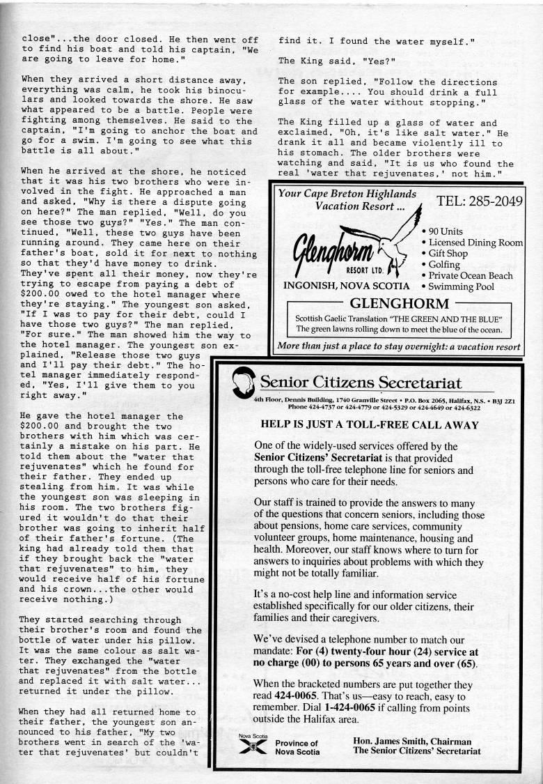 close"...the door closed. He then went off to find his boat and told his captain, "We are going to leave for home." When they arrived a short distance away, everything was calm, he took his binocu? lars and looked towards the shore. He saw what appeared to be a battle. People were fighting among themselves. He said to the captain, "I'm going to anchor the boat and go for a swim. I'm going to see what this battle is all about." When he arrived at the shore, he noticed that it was his two brothers who were in? volved in the fight. He approached a man and asked. "Why is there a dispute going on here?" The man replied, "Well, do you see those two guys?" "Yes." The man con? tinued, "Well, these two guys have been running around. They came here on their father's boat, sold it for next to nothing so that they'd have money to drink. They've spent all their money, now they're trying to escape from paying a debt of $200.00 owed to the hotel manager where they're staying." The youngest son asked, "If I was to pay for their debt, could I have those two guys?" The man replied, "For sure." The man showed him the way to the hotel manager. The youngest son ex? plained, "Release those two guys and I'll pay their debt." The ho? tel manager immediately respond? ed, "Yes, I'll give them to you right away." find it. I found the water myself." The King said, "Yes?" The son replied, "Follow the directions for example.... You should drink a full glass of the water without stopping." The King filled up a glass of water and exclaimed, "Oh. it's like salt water." He drank it all and became violently ill to his stomach. The older brothers were watching and said, "It is us who found the real 'water that rejuvenates,' not him." He gave the hotel manager the $200.00 and brought the two brothers with him which was cer? tainly a mistake on his part. He told them about the "water that rejuvenates" which he found for their father. They ended up stealing from him. It was while the youngest son was sleeping in his room. The two brothers fig? ured it wouldn't do that their brother was going to inherit half of their father's fortune. (The king had already told them that if they brought back the "water that rejuvenates" to him, they would receive half of his fortune and his crown...the other would receive nothing.) They started searching through their brother's room and found the bottle of water under his pillow. It was the same colour as salt wa? ter. They exchanged the "water that rejuvenates" from the bottle and replaced it with salt water... returned it under the pillow. When they had all returned home to their father, the youngest son an? nounced to his father, "My two brothers went in search of the 'wa? ter that rejuvenates' but couldn't Your Cape Breton Highlands Vacation Resort. Ckfrni RESORT LTD. INGONISH, NOVA SCOTIA TEL: 285-2049 • 90 Units • Licensed Dining Room • Gift Shop • Golfing • Private Ocean Beach • Swimming Pool GLENGHORM Scottish Gaelic Translation "THE GREEN AND THE BLUE" The green lawns rolling down to meet the blue of the ocean. More than just a place to stay overnight: a vacation resort 0 Senior Citizens Secretariat HELP IS JUST A TOLL-FREE CALL AWAY One of the widely-used services offered by the Senior Citizens' Secretariat is that provided through the toll-free telephone line for seniors and persons who care for their needs. Our staff is trained to provide the answers to many of the questions that concem seniors, including those about pensions, home care services, community volunteer groups, home maintenance, housing and health. Moreover, our staff knows where to turn for answers to inquiries about problems with which they might not be totally familiar. It's a no-cost help line and information service established specifically for our older citizens, their famihes and their caregivers. We've devised a telephone number to match our mandate: For (4) twenty-four hour (24) service at no charge (00) to persons 65 years and over (65). When the bracketed numbers are put together they read 424-0065. That's us • easy to reach, easy to remember. Dial 1-424-0065 if calling from points outside the Hahfax area. Province of Nova Scotia Hon. James Smith, Chairman The Senior Citizens' Secretariat