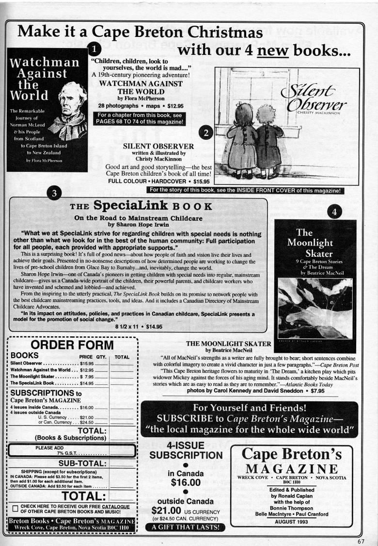 Make it a Cape Breton Christmas ' with our 4 new books... watchman Aeainst tlie World "Children, children, look to yourselves, the world is mad...." A 19th-century pioneering adventure! WATCHMAN AGAINST THE WORLD by Flora McPherson 28 photographs • maps • $12.95 For a chapter from this book, see PAGES 68 TO 74 of this magazine! e ' SILENT OBSERVER written & iUustrated by Christy MacKinnon Good art and good storytelling • the best Cape Breton children's book of all time! FULL COLOUR • HARDCOVER • $15.95 For the story of this book, see the INSIDE FRONT COVER of this magazir THE SpeciaLink book On the Road to Mainstream Childcare by Sharon Hope Irwin ""What we at SpeciaUnk strive for regarding children with special needs Is nothing other than what we look for in the best of the human community: Full participation for ali people, each provided with appropriate supports." Tliis is a surprising book! Ifs full of good news • about how people of faith and vision live their lives and achieve their goals. Presented in no-nonsense descriptions of how determined people are working lo change the lives of {ffc-school children fitan Glace Bay to Bumaby...and, inevitably, change the world. Sharcm Hope Irwin • oik of Canada's pioneers in getting children with special needs into regular, mainstream childcare • gives us a C'ada-wide portrait of the children, their powerfiil parents, and childcare woriters who have invented and schemed and lobbied • and achieved. From the inspiring to die utterly practical, TTte SpeciaUnk Book builds on its pncanise to networit pec'le with the best childcare mainstreaming practices, tools, and ideas. And it includes a Canadian Directory of Mamstreara Childcare Advocates. "In t& impact on attitudes, policies, and practices In Canadian childcare, SpeciaUnk presents a model for the promotion of social change." 81/2x11 $14.95 O The' Moonlight Skater -J ''' ORDER FORM BOOKS PRICE QTY. Silent Observer $15.95 Watchman Against the World... $12.95 The Moonlight Skater $ 7.95 The SpeciaLink Book $14.95 SUBSCRIPTIONS to Cape Breton's MAGAZINE 4 issues inside Canada $16.00 - 4 Issues outside Canada U.S. Currency $21.00_ or Can. Currency ... $24.50 _ TOTAL: (Books & Subscriptions) PLEASE ADD SUB-TOTAL: SHIPPING (except for subscriptions) IN CANADA: Please add S3.S0 for the first 2 items, then add $1.00 for each additional item. OUTSIDE CANADA: Add $3.50 for each item TOTAL: I CHECK HERE TO RECEIVE OUR FREE CATALOGUE J OF OTHER CAPE BRETON BOOKS AND MUSIC! Breton Books • Cape Breton's magazini Wreck Cove, Cape Breton, Nova Scotia BOC IHO THE MOONLIGHT SKATER by Beatrice MacNeil "All of MacNeil's strengths as a writer are fully brought to bear; short sentences combine with colorful imagery to aeate a vivid character in just a few paragraphs." • Cape Breton Post "This Cape Breton heritage flowers to maturity in 'The Dream,' a kitchen play which pits widower Mickey against the forces of his aging mmd. It stands comfortably beside MacNeil's stories which are as easy to read as they are to remember." • Atlantic Books Today photos by Carol Kennedy and David Sneddon • $7.95 For Yourself and Friends! SUBSCRIBE to Cape Breton's Magazine • "the local magazine for the whole wide world' 4-ISSUE SUBSCRIPTION • in Canada $16.00 • outside Canada $21.00 us CURRENCY (or $24.50 CAN. CURRENCY) Cape Breton's MAGAZINE WRECK COVE - NOVA SCOTIA Edited & Published by Ronald Caplan with the help of Bonnie Thompson Belle Maclntyre • Paul Cranford AUGUST 1993 67