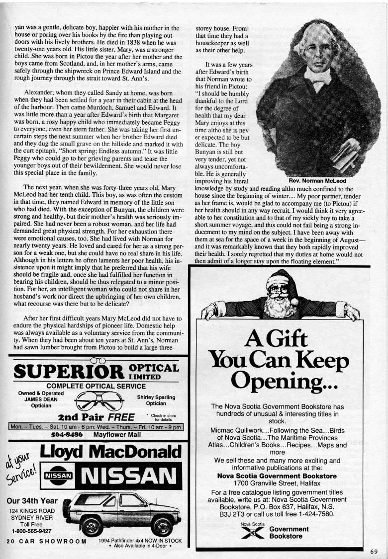 yan was a gentle, delicate boy, happier with his mother in the house or poring over his books by the fire than playing out? doors with his lively brothers. He died in 1838 when he was twenty-one years old. His little sister, Mary, was a stronger child. She was bom in Pictou the year after her mother and the boys came from Scotland, and, in her mother's arms, came safely through the shipwreck on Prince Edward Island and the rough joumey through the strait toward St. Ann's. Alexander, whom they called Sandy at home, was bom when they had been settled for a year in their cabin at the head of the harbour. Then came Murdoch, Samuel and Edward. It was little more than a year after Edward's birth that Margaret was bom, a rosy happy child who immediately became Peggy to everyone, even her stem father. She was taking her first un? certain steps the next summer when her brother Edward died and they dug die small grave on the hillside and marked it with the curt epitaph, "Short spring; Endless autumn." It was little Peggy who could go to her grieving parents and tease the younger boys out of their bewilderment. She would never lose this special place in the family. The next year, when, she was forty-three years old, Mary McLeod had her tenth child. This boy, as was often the custom in that time, they named Edward in memory of the little son who had died. With the exception of Bunyan, the children were strong and healthy, but their mother's health was seriously im? paired. She had never been a robust woman, and her life had demanded great physical strength. For her exhaustion there were emotional causes, too. She had lived with Norman for nearly twenty years. He loved and cared for her as a strong per? son for a weak one, but she could have no real share in his life. Although in his letters he often laments her poor health, his in? sistence upon it might imply that he preferred that his wife should be fragile and, once she had fulfilled her function in bearing his children, should be thus relegated to a minor posi? tion. For her, an intelligent woman who could not share in her husband's work nor direct the upbringing of her own children, what recourse was tiiere but to be delicate? After her first difficult years Mary McLeod did not have to endure the physical hardships of pioneer life. Domestic help was always available as a voluntary service from the communi? ty. When they had been about ten years at St. Ann's, Norman had sawn lumber brought from Pictou to build a large three- -CO- SUPERIOR '"'"'' LIMITED COMPLETE OPTICAL SERVICE Owned & Operated /' S_/' v _.. , _ fr Y ' Shirley Sparling Optician JAMES DEAN Optician 2sid Pair FREE ?? Check in store I MOti. - Tues. - Sat. 10 am - 6 pm; Wed. - Thufs. - Frt. 10 aw - 9 pm I 564-8486 Mayflower Mall Lloyd MacDonald NISSAN cnmazii Our 34th Year 124 KINGS ROAD SYDNEY RIVER Toll Free 1-800-565-9427 20 CAR SHOWROOM 1994 Pathfinder 4x4 NOW IN STOCK • Also Available in 4-Door • Storey house. From that time they had a housekeeper as well as their other help. It was a few years after Edward's birth diat Norman wrote to his friend in Pictou: "I should be humbly thankful to the Lord for the degree of health that my dear Mary enjoys at this time altho she is no - er expected to be but delicate. The boy Bunyan is still but very tender, yet not always uncomforta? ble. He is generally improving his literal Rev. Norman McLeod knowledge by study and reading altho much confined to the house since die beginning of winter.... My poor partner, tender as her frame is, would be glad to accompany me (to Pictou) if her health should in any way recmit. I would think it very agree? able to her constitution and to that of my sickly boy to take a short summer voyage, and this could not fail being a strong in? ducement to my mind on the subject. I have been away with them at sea for the space of a week in the beginning of August • and it was remarkably known that they both rapidly improved their health. I sorely regretted that my duties at home would not then admit of a longer stay upon the floating element." AGift Ifou Can Keep Opening... The Nova Scotia Government Bookstore has hundreds of unusual & interesting titles in stock. Micmac Quillwork...Following the Sea...Birds of Nova Scotia...The Maritime Provinces Atlas...Children's Books...Recipes...Maps and more We sell these and many more exciting and informative publications at the: Nova Scotia Govemment Bookstore 1700 Granville Street, Halifax For a free catalogue listing government titles available, write us at: Nova Scotia Government Bookstore, P.O. Box 637, Halifax, N.S. B3J 2T3 or call us toll free 1-424-7580. Nova Scotia Government Bookstore