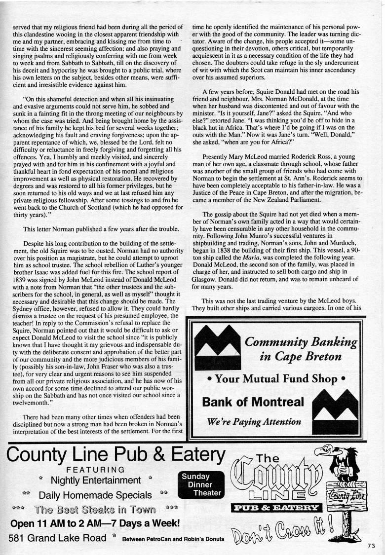 served that my religious friend had been during all the period of this clandestine wooing in the closest apparent friendship with me and my partner, embracing and kissing me from time to time with the sincerest seeming affection; and also praying and singing psalms and religiously conferring with me from week to week and from Sabbath to Sabbath, till on the discovery of his deceit and hypocrisy he was brought to a public trial, where his own letters on the subject, besides other means, were suffi? cient and irresistible evidence against him. "On this shameful detection and when aU his insinuating and evasive arguments could not serve him, he sobbed and sunk in a fainting fit in the throng meeting of our neighbours by whom the case was tried. And being brought home by the assis? tance of his family he kept his bed for several weeks together; acknowledging his fault and craving forgiveness; upon the ap? parent repentance of which, we, blessed be the Lord, felt no difficulty or reluctance in freely forgiving and forgetting all his offences. Yea, I humbly and meekly visited, and sincerely prayed with and for him in his confmement with a joyful and thankful heart in fond expectation of his moral and religious improvement as well as physical restoration. He recovered by degrees and was restored to all his former privileges, but he soon retumed to his old ways and we at last refused him any private religious fellowship. After some tossings to and fro he went back to the Church of Scotland (which he had opposed for thirty years)." This letter Norman published a few years after the trouble. Despite his long contribution to the building of the settle? ment, the old Squire was to be ousted. Norman had no authority over his position as magistrate, but he could attempt to uproot him as school trustee. The school rebellion of Luther's younger brother Isaac was added fuel for this fire. The school report of 1839 was signed by John McLeod instead of Donald McLeod with a note from Norman that "the other trustees and the sub? scribers for the school, in general, as well as myself thought it necessary and desirable that this change should be made. The Sydney office, however, refused to allow it. They could hardly dismiss a trustee on the request of his presumed employee, the teacher! In reply to the Commission's refusal to replace the Squire, Norman pointed out that it would be difficult to ask or expect Donald McLeod to visit the school since "it is publicly known that I have thought it my grievous and indispensable du? ty with the deliberate consent and approbation of the better part of our community and the more judicious members of his fami? ly (possibly his son-in-law, John Fraser who was also a trus? tee), for very clear and urgent reasons to see him suspended from all our private religious association, and he has now of his own accord for some time declined to attend our public wor? ship on the Sabbath and has not once visited our school since a twelvemonth." There had been many other times when offenders had been disciplined but now a strong man had been broken in Norman's interpretation of the best interests of the settlement. For the first time he openly identified the maintenance of his personal pow? er with the good of the community. The leader was tuming dic? tator. Aware of the change, his people accepted it • some un? questioning in their devotion, others critical, but temporarily acquiescent in it as a necessary condition of the life they had chosen. The doubters could take refuge in the sly undercurrent of wit with which the Scot can maintain his inner ascendancy over his assumed superiors. A few years before. Squire Donald had met on the road his friend and neighbour, Mrs. Norman McDonald, at the time when her husband was discontented and out of favour with the minister. "Is it yourself, Jane?" asked the Squire. "And who else?" retorted Jane. "I was thinking you'd be off to hide in a black hut in Africa. That's where I'd be going if I was on the outs with the Man." Now it was Jane's tum. "Well, Donald," she asked, "when are you for Africa?" Presently Mary McLeod married Roderick Ross, a young man of her own age, a classmate through school, whose father was another of the small group of friends who had come with Norman to begin the settlement at St. Ann's. Roderick seems to have been completely acceptable to his father-in-law. He was a Justice of the Peace in Cape Breton, and after the migration, be? came a member of the New Zealand Parliament. The gossip about the Squire had not yet died when a mem? ber of Norman's own family acted in a way that would certain? ly have been censurable in any other household in the commu? nity. Following John Munro's successful ventures in shipbuilding and trading, Norman's sons, John and Murdoch, began in 1838 the building of their first ship. This vessel, a 90- ton ship called the Maria, was completed the following year. Donald McLeod, the second son of the family, was placed in charge of her, and instructed to sell both cargo and ship in Glasgow. Donald did not retum, and was to remain unheard of for many years. This was not the last trading venture by the McLeod boys. They built other ships and carried various cargoes. In one of his tt Community Banking in Cape Breton • Your Mutual Fund Shop • Bank of Montreal We're Paying Attention tt County Line Pub & Eatery FEATURING Sunday Dinner Theater ' Nightly Entertainment * '"' Daily Homemade Specials **' lh% BettI Stteate m Imsu '""' Open 11 AM to 2 AM • 7 Days a Week! 581 Grand Lake Road ' Between PetroCanand Robins Oonuts