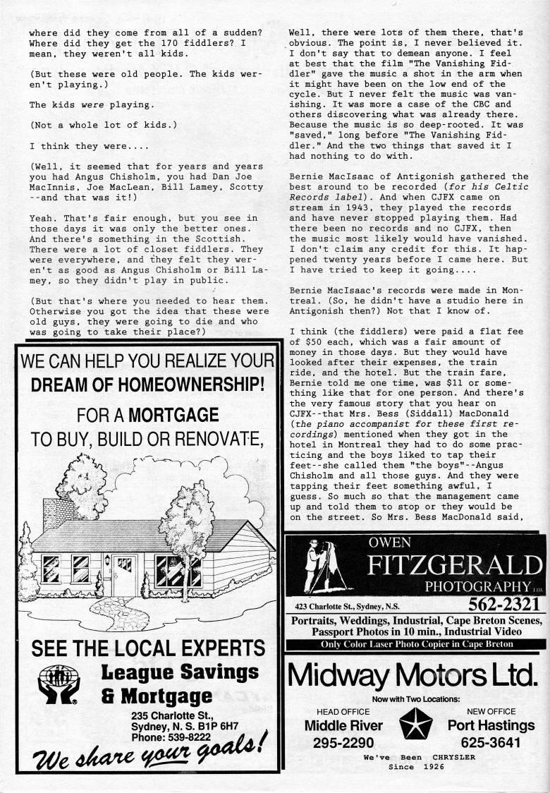 where did they come from all of a sudden? Where did they get the 170 fiddlers? I mean, they weren't all kids. (But these were old people. The kids wer? en 't playing.) The kids were playing. (Not a whole lot of kids.) I think they were.... (Well, it seemed that for years and years you had Angus Chisholm, you had Dan Joe Maclnnis, Joe MacLean, Bill Lamey, Scotty --and that was it!) Yeah. That's fair enough, but you see in those days it was only the better ones. And there's something in the Scottish. There were a lot of closet fiddlers. They were everywhere, and they felt they wer? en't as good as Angus Chisholm or Bill La? mey, so they didn't play in public. (But that's where you needed to hear them. Otherwise you got the idea that these were old guys, they were going to die and who was going to take their place?) WE CAN HELP YOU REALIZE YOUR DREAM OF HOMEOWNERSHIP! FOR A MORTGAGE TO BUY, BUILD OR RENOVATE, SEE THE LOCAL EXPERTS League Savings 8 Mortgage 235 Charlotte St., Sydney,N.S. BIP6H7 Phone: 539-8222 t . f Well, there were lots of them there, that's obvious. The point is, I never believed it. I don't say that to demean anyone. I feel at best that the film "The Vanishing Fid? dler" gave the music a shot in the arm when it might have been on the low end of the cycle. But I never felt the music was van? ishing. It was more a case of the CBC and others discovering what was already there. Because the music is so deep-rooted. It was "saved," long before "The Vanishing Fid? dler." And the two things that saved it I had nothing to do with. Bernie Maclsaac of Antigonish gathered the best around to be recorded (for his Celtic Records label). And when CJFX came on stream in 1943, they played the records and have never stopped playing them. Had there been no records and no CJFX, then the music most likely would have vanished. I don't claim any credit for this. It hap? pened twenty years before I came here. But I have tried to keep it going.... Bernie MacIsaac's records were made in Mon? treal. (So, he didn't have a studio here in Antigonish then?) Not that I know of. I think (the fiddlers) were paid a flat fee of $50 each, which was a fair amount of money in those days. But they would have looked after their expenses, the train ride, and the hotel. But the train fare, Bernie told me one time, was $11 or some? thing like that for one person. And there's the very famous story that you hear on CJFX--that Mrs. Bess (Siddall) MacDonald (the piano accompanist for these first re? cordings) mentioned when they got in the hotel in Montreal they had to do some prac? ticing and the boys liked to tap their feet--she called them "the boys"--Angus Chisholm and all those guys. And they were tapping their feet something awful, I guess. So much so that the management came up and told them to stop or they would be on the street. So Mrs. Bess MacDonald said. OWEN i/jy 423 Charlotte St., Sydney, N.S. PHOTOGRAPHY, 562-2321 Portraits, Weddings, Industrial, Cape Breton Scenes, Passport Photos in 10 min.. Industrial Video Only Color Laser Photo Copier in Cape Breton Midway Motors Ltd. Now with Two Locations: HEAD OFFICE 'W. NEW OFFICE Middle River wg Port Hastings 295-2290 '"' 625-3641 We've Been CHRYSLER Since 1926