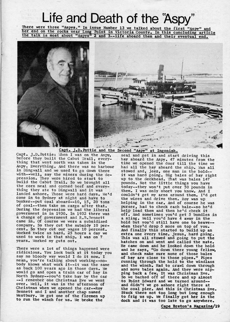 Published by Ronald Caplan on 1976/8/1 (390 reads)Life and Death of the "Aspy" There were three "Aspys." In issue Nuraber 13 we talked about the first "Aspy" and her end on the rocks near Long Point in Victoria County. In this concluding article the talk is most about "Aspys" 2 and 3 • life aboard them and their eventual end7 Capt. J.D.Pottie and the Second "Aspy" at Ingonish Capt, J,D.Pottie: IVhen I was on the Aspy, before they built the Cabot Trail, every? thing that went north was taken in the Aspy. Everything. And there was no harbour in Dingwall and we used to go down there with--well, say the miners during the de? pression. They were hired to start to build the Cabot Trail. So we brought all the corn meal and corned beef and every? thing they ate to Dingwall and it was landed ashore. Those were hard days. We'd come in to Sydney at night and have to bunker • put coal aboard • 10, 15, 20 tons of coal • then take on cargo after that. During the depression we had the liberal government in in 1930. In 1932 there xvas a change of government and R.B.Bennett carae in. Of course we were a subsidized company. So they cut the subsidy 10 per? cent. So they cut our wages 10 percent. Worked twice as hard. 25 hours a day we used to work in that ship. I was on 7 years. Worked my guts out. There were a lot of things happened were ridiculous. You look back at it today you say no bloody way would I do it now. I mean, you*re talking about working • no? body knows what work it • it was the same as back 100 years ago in those days. We would go and open a train car of hay in North Sydney • you'd take hay by the car • I remember one Christmas Eve we went over. iVell, it was in the afternoon of Christmas when we opened the car • Roy Bennett and I and another chap naraed Westbury. We got one of the fireraen up to run the winch for us. We broke the seal and get in and start driving this hay aboard the Aspy. 47 minutes from the time xve opened the door till the time we had all the hay aboard the ship. Was all stowed and, jeez, one man in the hold • it was hard going. Big bales of hay right up to the deckhead. That was bales 147 pounds. Not the little things you have today--they won??t put over 50 pounds in thera. I was only short you know. And I couldn't get my arms around them. I'd get the wires and drive thera, Roy was up helping in the car. And of course he was purser, had to check each bale • so he'd help load thera and then he'd check it off. And sometimes you'd get 5 bundles in a sling. Well you*d have 4 away in the hold but you'd still have one to heave- when they'd drop 5 more on top of you. And finally this started to build up an extra one every time. Jesus, hard going. This was all stowed and going to put the hatches on and went and called the mate. He carae down and he looked down the hold and he says, "Go down there youi' fellow, and check raake sure none of those bales of hay are close to those pipes." Pipes running through the hold to the windlass and the winch. Had to crawl down through and move bales again. And they were nip? ping back a few. It was Christmas Eve. So we backed off of there and up almost to Point Edward and we turned around • and didn*t we go ashore right there at the coal pier. And this is Christmas Eve. Stuck there not too long but long enough to frig us up. We finally got her in the dock and it was too late to go anywhere. Cape Breton's Magazine/19