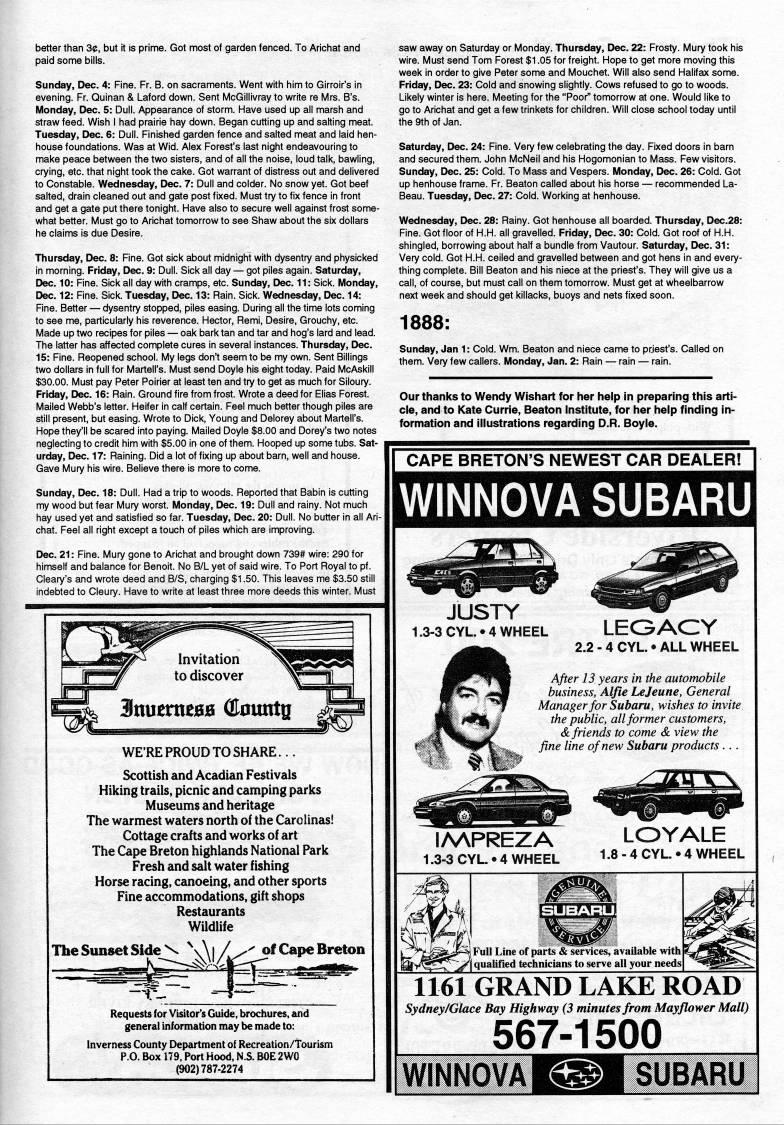 better than 30, but it is prime. Got most of garden fenced. To Arichat and paid some bills. Sunday, Dec. 4: Fine. Fr. B. on sacraments. Went with him to Girroir's in evening. Fr. Quinan & Laford down. Sent McGillivray to write re Mrs. B's. Monday, Dec. 5: Dull. Appearance of storm. Have used up all marsh and straw feed. Wish 1 had prairie hay down. Began cutting up and salting meat. Tuesday, Dec. 6: Dull. Finished garden fence and salted meat and laid hen? house foundations. Was at Wid. Alex Forest's last night endeavouring to make peace between the two sisters, and of all the noise, loud talk, bawling, crying, etc. that night took the cake. Got warrant of distress out and delivered to Constable. Wednesday, Dec. 7: Dull and colder. No snow yet. Got beef salted, drain cleaned out and gate post fixed. Must try to fix fence in front and get a gate put there tonight. Have also to secure well against frost some? what better. Must go to Arichat tomorrow to see Shaw about the six dollars he claims is due Desire. Thursday, Dec. 8: Fine. Got sick about midnight with dysentry and physicked in morning. Friday, Dec. 9: Dull. Sick all day • got piles again. Saturday, Dec. 10: Fine. Sick all day with cramps, etc. Sunday, Dec. 11: Sick. Monday, Dec. 12: Fine. Sick Tuesday, Dec. 13: Rain. Sick. Wednesday, Dec. 14: Fine. Better • dysentry stopped, piles easing. During all the time lots coming to see me, particularly his reverence. Hector, Remi, Desire, Grouchy, etc. Made up two recipes for piles • oak bark tan and tar and hog's lard and lead. The latter has affected complete cures in several instances. Thursday, Dec. 15: Fine. Reopened school. My legs don't seem to be my own. Sent Billings two dollars in full for Martell's. Must send Doyle his eight today. Paid McAskill $30.00. Must pay Peter Poirier at least ten and try to get as much for Siloury. Friday, Dec. 16: Rain. Ground fire from frost. Wrote a deed for Ellas Forest. Mailed Webb's letter. Heifer in calf certain. Feel much better though piles are still present, but easing. Wrote to Dick, Young and Delorey about Martell's. Hope they'll be scared into paying. Mailed Doyle $8.00 and Dorey's two notes neglecting to credit him with $5.00 irv one of them. Hooped up some tubs. Sat? urday, Dec. 17: Raining. Did a lot of fixing up about barn, well and house. Gave Mury his wire. Believe there is more to come. Sunday, Dec. 18: Dull. Had a trip to woods. Reported that Babin is cutting my wood but fear Mury worst. Monday, Dec. 19: Dull and rainy. Not much hay used yet and satisfied so far. Tuesday, Dec. 20: Dull. No butter in all Ari? chat. Feel all right except a touch of piles which are improving. Dec. 21: Fine. Mury gone to Arichat and brought down 739# wire: 290 for himself and balance for Benoit. No B/L yet of said wire. To Port Royal to pf. Cleary's and wrote deed and B/S, charging $1.50. This leaves me $3.50 still indebted to Cleury. Have to write at least three more deeds this winter. Must WE'RE PROUD TO SHARE... Scottish and Acadian Festivals Hiking trails, picnic and camping parks Museums and heritage The warmest waters north of the Carolinas! Cottage crafts and works of art The Cape Breton highlands National Park Fresh and salt water fishing Horse racing, canoeing, and other sports Fine accommodations, gift shops Restaurants Wildlife Requests for Visitor's Guide, brochures, and general information may be made to: Inverness County Department of Recreation/Tourism P.O. Box 179, Port Hood, N.S. BOE 2W0 (902)787-2274 saw away on Saturday or Monday. Thursday, Dec. 22: Frosty. Mury took his wire. Must send Tom Forest $1.05 for freight. Hope to get more moving this week in order to give Peter some and Mouchet. Will also send Halifax some. Friday, Dec. 23: Cold and snowing slightly. Cows refused to go to woods. Likely winter is here. Meeting for the "Poor" tomorrow at one. Would like to go to Arichat and get a few trinkets for children. Will close school today until the 9th of Jan. Saturday, Dec. 24: Fine. Very few celebrating the day. Fixed doors in barn and secured them. John McNeil and his Hogomonian to Mass. Few visitors. Sunday, Dec. 25: Cold. To Mass and Vespers. Monday, Dec. 26: Cold. Got up henhouse frame. Fr. Beaton called about his horse • recommended La- Beau. Tuesday, Dec. 27: Cold. Working at henhouse. Wednesday, Dec. 28: Rainy. Got henhouse all boarded. Thursday, Dec.28: Fine. Got floor of H.H. all gravelled. Friday, Dec. 30: Cold. Got roof of H.H. shingled, borrowing about half a bundle from Vautour. Saturday, Dec. 31: Very cold. Got H.H. ceiled and gravelled between and got hens in and every? thing complete. Bill Beaton and his niece at the priest's. They will give us a call, of course, but must call on them tomorrow. Must get at wheelbarrow next week and should get killacks, buoys and nets fixed soon. 1888: Sunday, Jan 1: Cold. Wm. Beaton and niece came to prjest's. Called on them. Very few callers. Monday, Jan. 2: Rain • rain • rain. Our thanks to Wendy Wishart for her help in preparing this arti? cle, and to Kate Currie, Beaton Institute, for her help finding In? formation and illustrations regarding D.R. Boyle. Il CAPE BRETON'S NEWEST CAR DEALER! WINNOVA SUBARU JUSTY 1.3-3 CYL.? 4 WHEEL LEGACY 2.2-4CYL.??ALLWHEEL After 13 years in the automobile business, Alfie Lejeune, General Manager for Subaru, wishes to invite the public, all former customers, & friends to come & view the fine line of new Subaru products ... IA'PREZA LOYALE 1.3.3CYL..4WHEEL 1.8-4CYL..4 WHEEL Full Line of parts & services, available with qualifled technicians to serve all your needs 1161 GRAND LAKE ROAD Sydney/Glace Bay Highway (3 minutes from Mayflower Mall) 567-1500 WINNOVA iiiaiii