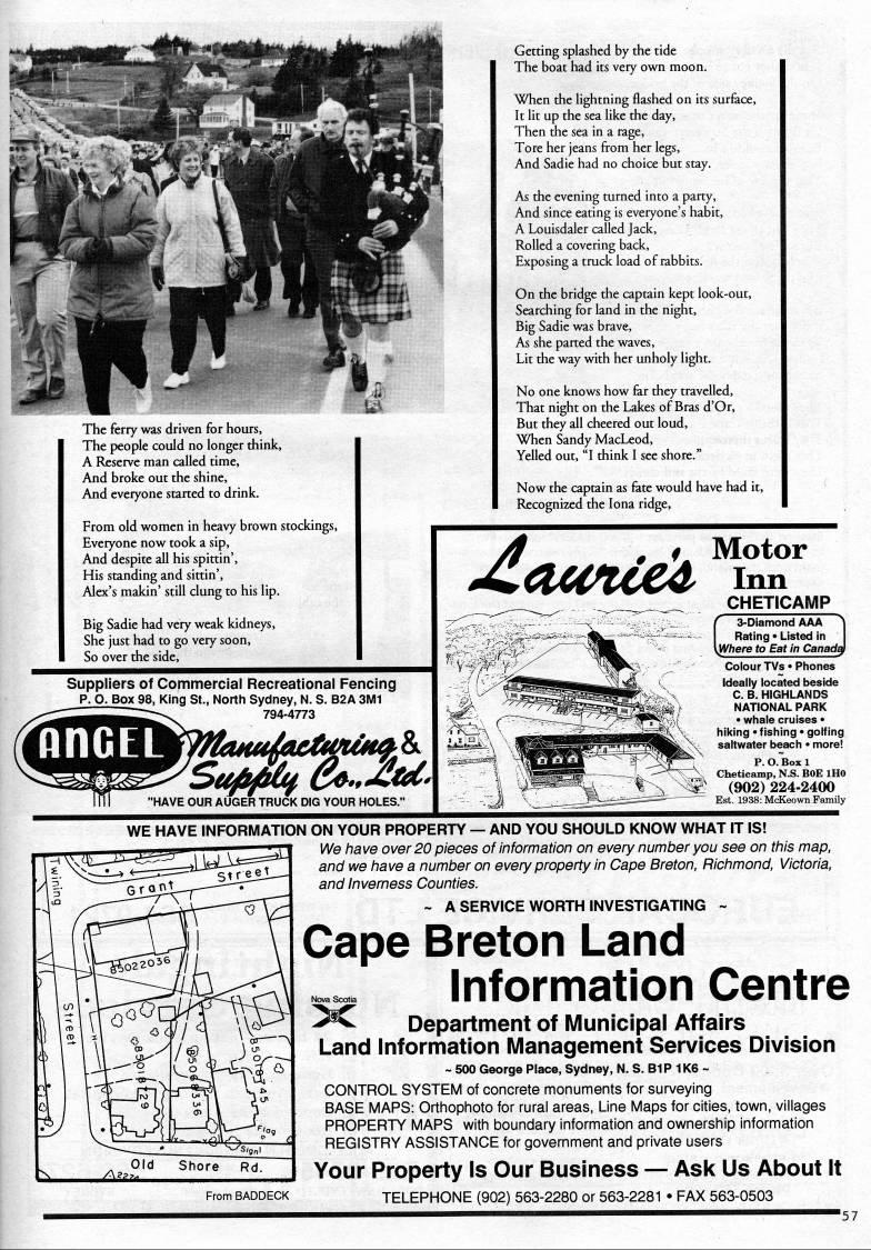 'l'''''-l 1' The ferry was driven for hours, The people could no longer think, A Reserve man called time. And broke out the shine, And everyone started to drink. From old women in heavy brown stockings, Everyone now took a sip, And despite all his spittin'. His standing and sittin', Alex's makin' still clung to his lip. Big Sadie had very weak kidneys. She just had to go very soon, So over the side, Getting splashed by the tide The boat had its very own moon. When the lightning flashed on its surface, It lit up the sea like the day. Then the sea in a rage. Tore her jeans from her legs, And Sadie had no choice but stay. As the evening turned into a party, And since eating is everyone's habit, A Louisdaler called Jack, Rolled a covering back, Exposing a truck load of rabbits. On the bridge the captain kept look-out, Searching for land in the night, Big Sadie was brave. As she parted the waves, Lit the way with her unholy light. No one knows how far they travelled. That night on the Lakes of Bras d'Or, But they all cheered out loud. When Sandy MacLeod, Yelled out, "I think I see shore." Now the captain as fate would have had it. Recognized the lona ridge, Suppliers of Commercial Recreational Fencing p. O. BOX98, King St., North Sydney, N. S. B2A3M1 794-4773 nnGEL Sa'' 6&.,ydteC. "HAVE OUR AUGER TRUCK DIG YOUR HOLES. AawUe' Motor Inn CHETICAMP 3-Diamond AAA Rating • Listed in Jfifhere to Eat in Canada' Colour TVs • Phones Ideally located beside C. B. HIGHLANDS NATIONAL PARK • whale cruises • hiking • fishing • golfing saltwater beach • more! I P. O. Box 1 '~ Cheticamp, N.S. BOE IHO '' (902) 224-2400 Est. 1938: McKeown Family WE HAVE INFORMATION ON YOUR PROPERTY • AND YOU SHOULD KNOW WHAT IT IS! We have over 20 pieces of information on every number you see on this map, and we have a number on every property in Cape Breton, Richmond, Victoria, and Inverness Counties. ~ A SERVICE WORTH INVESTIGATING ~ Cape Breton Land Information Centre From BADDECK Department of Municipal Affairs Land Information Management Services Division ~ 500 George Place, Sydney, N. S. BIP 1K6 ~ CONTROL SYSTEM of concrete monuments for surveying BASE MAPS: Orthophoto for rural areas, Line Maps for cities, town, villages PROPERTY MAPS with boundary information and ownership information REGISTRY ASSISTANCE for government and private users Your Property Is Our Business • Ask Us About It TELEPHONE (902) 563-2280 or 563-2281 • FAX 563-0503