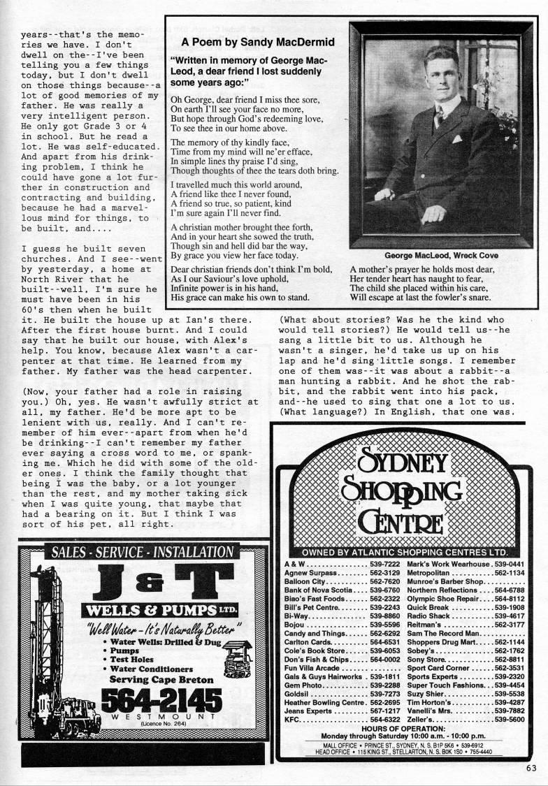 Published by Ronald Caplan on 1994/1/1 (164 reads)years--that's the memo? ries we have. I don't dwell on the--I've been telling you a few things today, but I don't dwell on those things because--a lot of good memories of my father. He was really a very intelligent person. He only got Grade 3 or 4 in school. But he read a lot. He was self-educated. And apart from his drink? ing problem, I think he could have gone a lot fur? ther in construction and contracting and building, because he had a marvel? lous mind for things, to be built, and.... A Poem by Sandy MacDermid "Written In memory of George Mac? Leod, a dear friend I lost suddenly some years ago:" Oh George, dear friend I miss thee sore, On earth I'll see your face no more, But hope through God's redeeming love. To see thee in our home above. The memory of thy kindly face. Time from my mind will ne'er efface. In simple Unes thy praise I'd sing, Though thoughts of thee the tears doth bring. I travelled much this world around, A friend like thee I never found, A friend so true, so patient, kind I'm sure again I'll never find. A christian mother brought thee forth, And in your heart she sowed the truth. Though sin and hell did bar the way. By grace you view her face today. Dear christian friends don't think I'm bold. As I our Saviour's love uphold. Infinite power is in his hand. His grace can make his own to stand. I guess he built seven churches. And I see--went by yesterday, a home at North River that he built--well, I'm sure he must have been in his 60's then when he built it. He built the house up at lan's there. After the first house burnt. And I could say that he built our house, with Alex's help. You know, because Alex wasn't a car? penter at that time. He learned from my father. My father was the head carpenter. (Now, your father had a role in raising you.) Oh, yes. He wasn't awfully strict at all, my father. He'd be more apt to be lenient with us, really. And I can't re? member of him ever--apart from when he'd be drinking--I can't remember my father ever saying a cross word to me, or spank? ing me. Which he did with some of the old? er ones. I think the family thought that being i was the baby, or a lot younger than the rest, and my mother taking sick when I was quite young, that maybe that had a bearing on it. But I think I was sort of his pet, all right. George MacLeod, Wreck Cove A mother's prayer he holds most dear. Her tender heart has naught to fear, The child she placed within his care, Will escape at last the fowler's snare. (What about stories? Was he the kind who would tell stories?) He would tell us--he sang a little bit to us. Although he wasn't a singer, he'd take us up on his lap and he'd sing-little songs. I remember one of them was--it was about a rabbit--a man hunting a rabbit. And he shot the rab? bit, and the rabbit went into his pack, and--he used to sing that one a lot to us. (What language?) In English, that one was. SALES ?? SERVICE - INSTALLATION J??T WELLS e PUMPS "?? *Dug> ffrrmrrr' ogggg'iDggflggggg'ggggj OWNED BY ATLANTIC SHOPPING CENTRES LTD. A&W; 539-7222 Mark's Wori( Wearhouse. 539-0441 Agnew Surpass 562-3129 IMetropoiitan 562-1134 Balloon City 562-7620 Munroe's Barber Shop Bank of Nova Scotia 539-6760 Northern Reflections 564-6788 Biao's Fast Foods 562-2322 Olympic Shoe Repair 564-8112 Bill's Pet Centre 539-2243 Quick Break 539-1908 Bi-Way 539-8860 Radio Shack 539-4617 Bojou 539-5596 Reitman's 562-3177 Candy and Things 562-6292 Sam The Record Man, Carlton Cards 564-6531 Shoppers Drug Mart 562-1144 Cole's Book Store 539-6053 Sobey's 562-1762 Don's Fish & Chips 564-0002 Sony Store. 562-8811 Fun Villa Arcade Sport Card Corner 562-3531 Gals & Guys Hairworks . 539-1811 Sports Experts 539-2320 Gem Photo 539-2288 Super Touch Fashions.. .539-4454 Goldsil 539-7273 Suzy Shier 539-5538 Heather Bowling Centre. 562-2695 Tim Horton's 539-4287 Jeans Experts 567-1217 Vanelli's Mrs 539-7882 KFC 564-6322 Zeller's 539-5600 HOURS OF OPERATION: Monday through Saturday 10:00 a.m. -10:00 p.m.