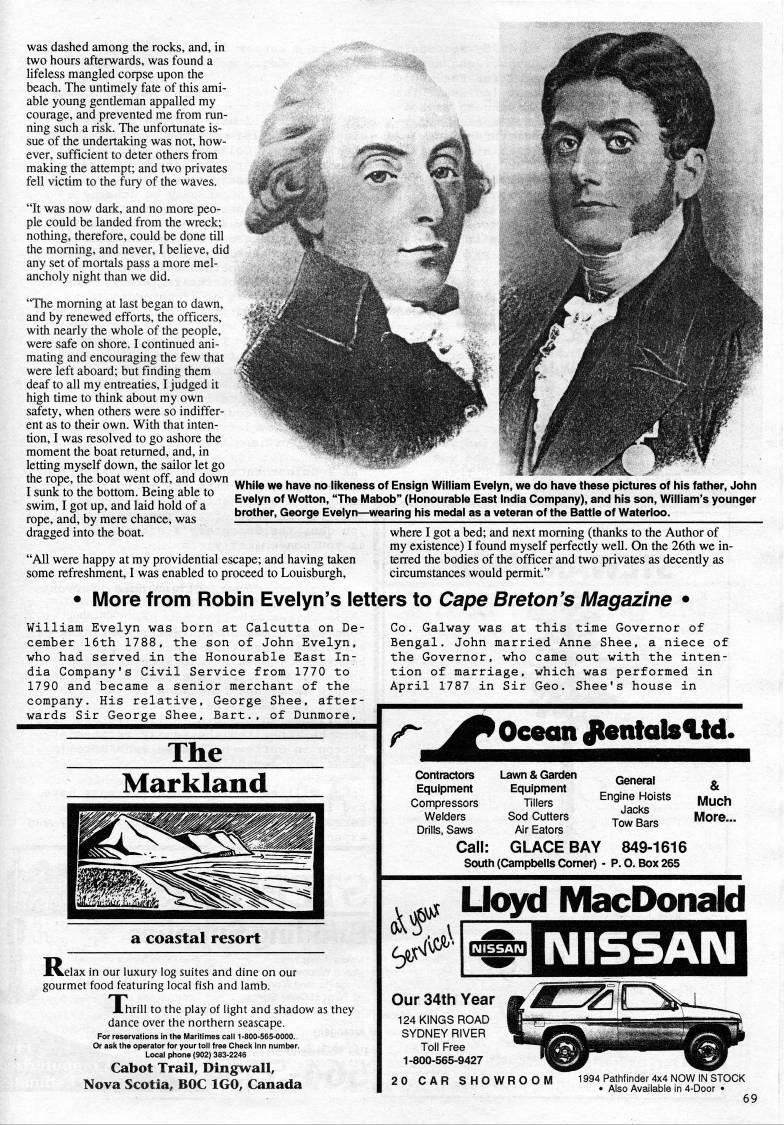 Published by Ronald Caplan on 1994/1/1 (198 reads)was dashed among the rocks, and, in two hours afterwards, was found a lifeless mangled corpse upon the beach. The untimely fate of this ami? able young gentleman appalled my courage, and prevented me from run? ning such a risk. The unfortunate is? sue of the undertaking was not, how? ever, sufficient to deter others from making the attempt; and two privates fell victim to the fury of the waves. "It was now dark, and no more peo? ple could be landed from the wreck; nothing, therefore, could be done till the moming, and never, I believe, did any set of mortals pass a more mel? ancholy night than we did. "The moming at last began to dawn, and by renewed efforts, the officers, with nearly the whole of the people, were safe on shore. I continued ani? mating and encouraging the few that were left aboard; but finding them deaf to all my entreaties, I judged it high time to think about my own safety, when others were so indiffer? ent as to their own. With that inten? tion, I was resolved to go ashore die moment the boat retumed, and, in letting myself down, the sailor let go the rope, the boat went off, and down '|'.|g '' '''' '' likeness of Ensign William Evelyn, we do have these pictures of his father, John 1 sumc to tne Dottom eeing aoie to '''jy'' '' Wotton, "The Mabob" (Honourable East India Company), and his son, William's younger swim, 1 got up, ana laia noia or a brother, George Evelyn • wearing his medal as a veteran of the Battle of Waterloo. rope, and, by mere chance, was .ay ?? dragged into the boat. "All were happy at my providential escape; and having taken some refreshment, I was enabled to proceed to Louisburgh, where I got a bed; and next moming (thanks to the Author of my existence) I found myself perfecdy well. On the 26th we in? terred the bodies of the officer and two privates as decentiy as circumstances would permit." • IVIore from Robin Evelyn's letters to Cape Breton's Magazine • William Evelyn was born at Calcutta on De? cember 16th 1788, the son of John Evelyn, who had served in the Honourable East In? dia Company's Civil Service from 1770 to 1790 and became a senior merchant of the company. His relative, George Shee, after? wards Sir George Shee, Bart., of Dunmore, Co. Galway was at this time Governor of Bengal. John married Anne Shee, a niece of the Governor, who came out with the inten? tion of marriage, which was performed in April 1787 in Sir Geo. Shee's house in The Markland a coastal resort Kel Lelax in our luxury log suites and dine on our gourmet food featuring local fish and lamb. Ji.hrill to the play of light and shadow as they dance over the northern seascape. For reservations in the iVIaritimes call 1-800-565.0000. Or asl( the operator for your toll free Check Inn number. Local phone (902) 383-2246 Cabot Trail, Dingwall, Nova Scotia, BOC IGO, Canada Ocean Jtentalsltd. Lawn & Garden Equipment Tillers Sod Cutters Air Eators GLACE BAY General Engine Hoists Jacks Tow Bars 849-1616 & Much More... South (Campbells Corner) • P. O. Box 265 Lloyd MacDonald NISSAN Our 34th Year 124 KINGS ROAD SYDNEY RIVER Toll Free 1-800-565-9427 20 CAR SHOWROOM 1994 Pathfinder 4x4 NOW IN STOCK • Also Available in 4-Door •
