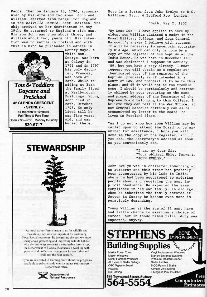 Published by Ronald Caplan on 1994/1/1 (205 reads)Dacca. Then on January 18, 1790, accompa? nied by his wife and two sons, John and William, started from Bengal for England in the Melville Castle, East Indiaman. The ship arrived at her destination on May 29th. He returned to England a rich man. His son John was then about three, and William about two, years old. His inten? tion was to settle in Ireland and with this in mind he purchased an estate in County Mayo. A third son, George, was born at Galway in 1791 and in 1797 his only daugh? ter, Frances, was born at Tots & Toddlers Daycare and PreSchool 42 GLENDA CRESCENT • SYDNEY. 18 months to 10 years Full Time & Part Time Open 7:30 • 5:30 Monday to Friday 539-6717 Bath. While re? siding at Bath the family lived at Marlborough Buildings. Young John died in Bath, October 1793. He only lived till he was five years old, and was buried there. STEWARDSHIP As much as our forests mean to us for wildlife and recreation, they are also important for sustaining Nova Scotia's economy. By integrating the best we know today about protecting and improving wildlife habitat with the best ways to ensure a sustainable forest crop, the Department of Natural Resources is working with private land holders to manage our forests today and well into the next century. If you are interested in learning more about the programs available to private landowners, contact your nearest Department office. Department of Natural Resources Here is a letter from John Evelyn to B.C. Williams, Esq.. 6 Bedford Row, London. "Bath, May 2, 1802. "My Dear Sir - I have applied to have my eldest son William admitted a cadet in the Royal Military College, and from General Harcourt's answer I believe with success. It will be necessary to ascertain accurate? ly his age, which can only be done by a copy of the register of his baptism at the India House. He was born in December 1788 and was christened I suppose in January '89, but you have a copy already. I must request you will obtain me a regular au? thenticated copy of the register of the baptism, precisely as if intended in a Court of Law, and transmit it to me to this place, and if it would not be too trouble? some, I should be particularly and extreme? ly obliged by your procuring me the name and proper address of the Secretary of the Supreme Board belonging to this College. I believe they can tell at the War Office, if not General Harcourt certainly can as he transmitted my letter to the Board--he lives in Portland Place.... "As I do not know how soon William may be called upon to attend the Board to be ex? amined for admittance, I hope you will send me the copy of the register, and if you can, the Secretary's address as soon as you conveniently can. "I am, my dear Sir, "Your obliged Hble. Servant, "JOHN EVELYN." John Evelyn was in character something of an autocrat and this trait had probably been accentuated by his life in India, where he had been accustomed to ordering people about and receiving the most im? plicit obedience. He expected the same compliance in his own family. In old age, when he inherited the family estates at Wotton in Surrey he became even more im? peratively demanding. Young William at the age of 14 must have had little chance to exercise a choice of career--but in those times filial duty was expected, anyway. STEPHENS HOME improvement! Building Supplies '' Makita Power Tools Mason Windows Donat Flamand Windows All Types of Cedar Sidings CGC Gypsum Board Plywood Iko Roofing Vinyl Replacement Windows Stanley Entrance Systems Pressure Treated Lumber Cedar Lumber SICO Paints & Stains Kaycan Vinyl Siding Fibreglass Pink Insulation 199 Townsend Street, Sydney 564-5554 Free Computerized Estimates