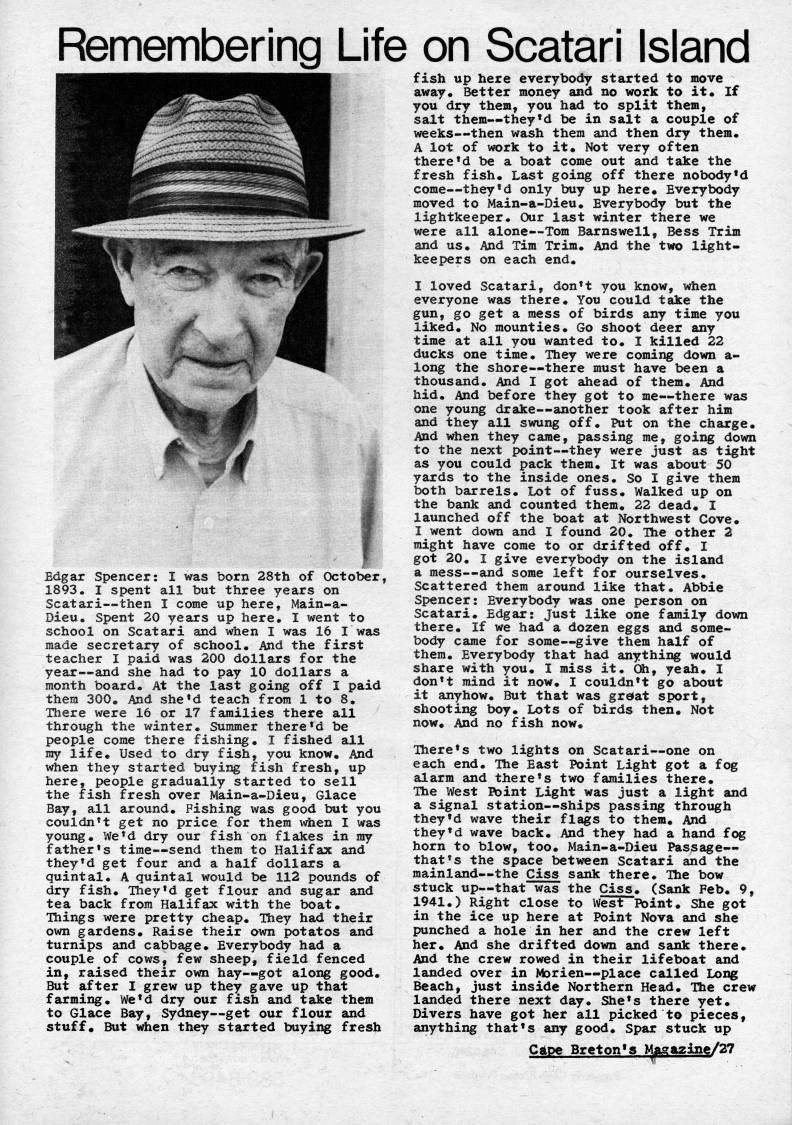 Published by Ronald Caplan on 1976/8/1 (1031 reads)Remembering Life on Scatari Island Edgar Spencer: I was born 28th of October, 1893. I spent all but three years on Scatari • then I corae up here, Main-a- Dieu. Spent 20 years up here. I went to school on Scatari and when I was 16 I was made secretary of school. And the first teacher I paid was 200 dollars for the year • and she had to pay 10 dollars a month board. At the last going off I paid thera 300. And she'd teach frora 1 to 8. There were 16 or 17 farailies there all through the winter. Suramer there'd be people come there fishing. I fished all my life. Used to dry fish, you know. And when they started buying fish fresh, up here, people gradually started to sell the fish fresh over Main-a-Dieu, Glace Bay, all around. Fishing was good but you couldn't get no price for them when I was young. We'd dry our fish on flakes in my father's time • send them to Halifax and they'd get four and a half dollars a quintal. A quintal would be 112 pounds of dry fish. They'd get flour and sugar and tea back from Halifax with the boat. Ihings were pretty cheap. They had their own gardens. Raise their own potatos and turnips and cabbage. Everybody had a couple of cows, few sheep, field fenced in, raised their own hay • got along good. But after I grew up they gave up that farming. We'd dry our fish and take them to Glace Bay, Sydney • get our flour and stuff. But when they started buying fresh fish up here everybody started to move away. Better money and no work to it. If you dry thera, you had to split thera, salt thera • they'd be in salt a couple of weeks • then wash thera and then dry thera. A lot of work to it. Not very often there'd be a boat come out and take the fresh fish. Last going off there nobody'd come • they'd only buy up here. Everybody moved to Main-a-Dieu. Everybody but the lightkeeper. Our last winter there we were all alone • Tom Barnswell, Bess Trim and us. And Tim Trim. And the two light- keepers on each end. I loved Scatari, don't you know, when everyone was there. You could take the gun, go get a mess of birds any time you liked. No raounties. Go shoot deer any time at all you wanted to. I killed 22 ducks one time. They were coming down a- long the shore • there must have been a thousand. And I got ahead of them. And hid. And before they got to me • there was one young drake • another took after him and they all swung off. Put on the charge. And when they came, passing me, going down to the next point • they were just as tight as you could pack them. It was about 50 yards to the inside ones. So I give them both barrels. Lot of fuss. Walked up on the bank and counted them. 22 dead. I launched off the boat at Northwest Cove. I went down and I found 20. Ihe other 2 might have come to or drifted off. I got 20. I give everybody on the island a mess--and some left for ourselves. Scattered them around like that. Abbie Spencer: Everybody was one person on Scatari. Edgar: Just like one family down there. If we had a dozen eggs and some? body came for some • give them half of them. Everybody that had anything would share with you. I miss it. Oh, yeah. I don't raind it now. I couldn't go about it anyhow. But that was gre'at sport, shooting boy. Lots of birds then. Not now. And no fish now. There's two lights on Scatari • one on each end. Ihe East Point Light got a fog alarm and there's two families there. The West Point Light was just a light and a signal station • ships passing through they'd wave their flags to thera. And they'd wave back. And they had a hand f<' horn to blow, too. Main-a-Dieu Passage- that's the space between Scatari and the mainland--the Ciss sank there. Ihe bow stuck up • that was the Ciss. (Sank Feb. 9, 1941.) Right close to West Point. She got in the ice up here at Point Nova and she punched a hole in her and the crew left her. And she drifted down and sank there. And the crew rowed in their lifeboat and landed over in Morien • place called Long Beach, just inside Northern Head. The crew landed there next day. She's there yet. Divers have got her all picked to pieces, anything that's any good. Spar stuck up Cape Breton's ''aga2ine/27