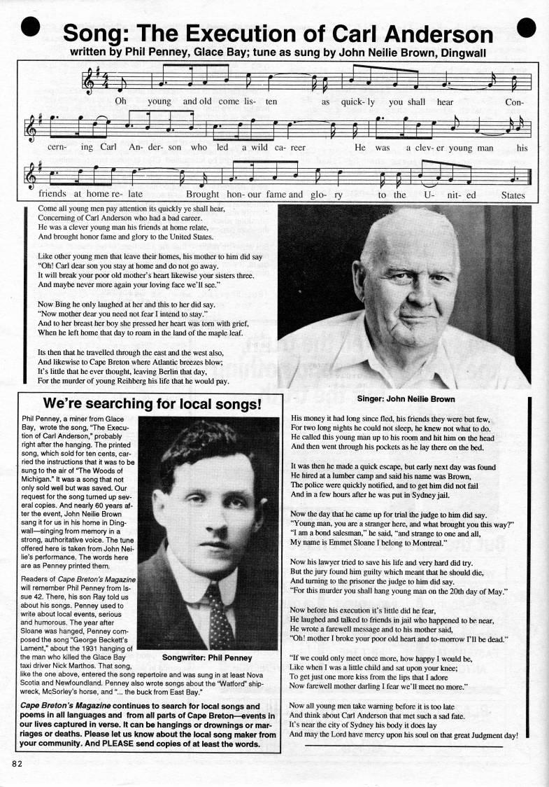 Song: The Execution of Carl Anderson written by Phil Penney, Glace Bay; tune as sung by John Neilie Brown, Dingwall cern- r-fr-l ing Carl r • w~~ An- der- son who led a wild ca- reer He was a clev- er young man his y k'kfl''**' 'Il friends at home re- late Brought hon- our fame and glo- ry to the U- nit- ed States Come all young men pay attention its quickly ye shall hear. Concerning of Carl Anderson who had a bad career. He was a clever young man his friends at home relate, And brought honor fame and glory to the United States. Like other young men that leave their homes, his mother to him did say "Oh! Carl dear son you stay at home and do not go away. It wiU break your poor old mother's heart likewise your sisters three. And maybe never more again your loving face we'll see." Now Bing he only laughed at her and this to her did say. "Now mother dear you need not fear I intend to stay." And to her breast her boy she pressed her heart was tom with grief, When he left home that day to roam in the land of the maple leaf. Its then that he travelled through the east and the west also. And likewise to Cape Breton where Atlantic breezes blow; It's little that he ever thought, leaving Berlin that day. For the murder of young Reihberg his life that he would pay. We're searching for local songs! Phil Penney, a miner fronn Glace Bay, wrote the song, "The Execu? tion of Carl Anderson," probably right after the hanging. The printed song, which sold for ten cents, car? ried the instructions that it was to be sung to the air of 'The Woods of Michigan." It was a song that not only sold well but was saved. Our request for the song turned up sev? eral copies. And nearly 60 years af? ter the event, John Neilie Brown sang it for us in his home in Ding? wall • singing from memory in a strong, authoritative voice. The tune offered here is taken from John Nel? lie's performance. The words here are as Penney printed them. Readers of Cape Breton's Magazine I will remember Phil Penney from Is? sue 42. There, his son Ray told us about his songs. Penney used to write about local events, serious and humorous. The year after Sloane was hanged, Penney com? posed the song "George Beckett's Lament," about the 1931 hanging of ' the man who killed the Glace Bay taxi driver Nick Marthos. That song, like the one above, entered the song repertoire and was sung in at least Nova Scotia and Newfoundland. Penney also wrote songs about the "Watford" ship? wreck, McSorley's horse, and "... the buck from East Bay." Cape Breton's Magazine continues to search for local songs and poems in all languages and from ail parts of Cape Breton • events in our lives captured in verse. It can be hangings or drownings or mar? riages or deaths. Please let us Icnow about the local song maker from your community. And PLEASE send copies of at least the words. Songwriter: Phil Penney Singer: John Neilie Brown His money it had long since fled, his friends they were but few. For two long nights he could not sleep, he knew not what to do. He called this young man up to his room and hit him on the head And then went through his pockets as he lay there on the bed. It was then he made a quick escape, but early next day was found He hired at a lumber camp and said his name was Brown, The pohce were quickly notified, and to get him did not fail And in a few hours after he was put in Sydney jail. Now the day that he came up for trial the judge to him did say. "Young man, you are a stranger here, and what brought you this way?" "I am a bond salesman," he said, "and strange to one and aU, My name is Emmet Sloane I belong to Montreal." Now his lawyer tried to save his life and very hard did try. But the jury found him guilty which meant that he should die. And tuming to the prisoner the judge to him did say. "For this murder you shall hang young man on the 20th day of May." Now before his execution it's little did he fear. He laughed and talked to friends in jail who happened to be near. He wrote a farewell message and to his mother said, "Oh! mother I broke your poor old heart and to-morrow I'll be dead." "If we could only meet once more, how happy I would be. Like when I was a little child and sat upon your knee; To get just one more kiss from the lips that I adore Now farewell mother darhng I fear we'll meet no more." Now all young men take warning before it is too late And think about Carl Anderson that met such a sad fate. It's near the city of Sydney his body it does lay And may the Lord have mercy upon his soul on that great Judgment day! 82