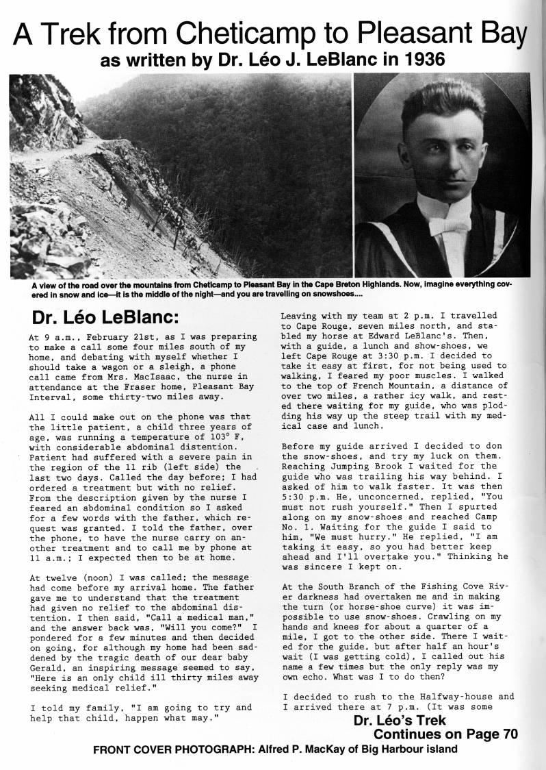 Published by Ronald Caplan on 1994/6/1 (531 reads)A Trek from Cheticamp to Pleasant Bay as written by Dr. Leo J. LeBlanc in 1936 A view of the road over the mountains from Cheticamp to Pleasant Bay in the Cape Breton h ered in snow and ice • it is the middle of the night • 'and you are travelling on snowshoes... Now, imagine everything cov- Dr. Leo LeBlanc: At 9 a.m., February 21st, as I was preparing to make a call some four miles south of my home, and debating with myself whether I should take a wagon or a sleigh, a phone call came from Mrs. Maclsaac, the nurse in attendance at the Fraser home. Pleasant Bay Interval, some thirty-two miles away. All I could make out on the phone was that the little patient, a child three years of age, was running a temperature of 103? F, with considerable abdominal distention. Patient had suffered with a severe pain in the region of the 11 rib (left side) the last two days. Called the day before; I had ordered a treatment but with no relief. From the description given by the nurse I feared an abdominal condition so I asked for a few words with the father, which re? quest was granted. I told the father, over the phone, to have the nurse carry on an? other treatment and to call me by phone at 11 a.m.; I expected then to be at home. At twelve (noon) I was called; the message had come before my arrival home. The father gave me to understand that the treatment had given no relief to the abdominal dis? tention. I then said, "Call a medical man," and the answer back was, "Will you come?" I pondered for a few minutes and then decided on going, for although my home had been sad? dened by the tragic death of our dear baby Gerald, an inspiring message seemed to say, "Here is an only child ill thirty miles away seeking medical relief." Leaving with my team at 2 p.m. I travelled to Cape Rouge, seven miles north, and sta? bled my horse at Edward LeBlanc's. Then, with a guide, a lunch and show-shoes, we left Cape Rouge at 3:30 p.m. I decided to take it easy at first, for not being used to walking, I feared my poor muscles. I walked to the top of French Mountain, a distance of over two miles, a rather icy walk, and rest? ed there waiting for my guide, who was plod? ding his way up the steep trail with my med? ical case and lunch. Before my guide arrived I decided to don the snow-shoes, and try my luck on them. Reaching Jumping Brook I waited for the guide who was trailing his way behind. I asked of him to walk faster. It was then 5:30 p.m. He, unconcerned, replied, "You must not rush yourself." Then I spurted along on my snow-shoes and reached Camp No. 1. Waiting for the guide I said to him, "We must hurry." He replied, "I am taking it easy, so you had better keep ahead and I'll overtake you." Thinking he was sincere I kept on. At the South Branch of the Fishing Cove Riv? er darkness had overtaken me and in making the turn (or horse-shoe curve) it was im? possible to use snow-shoes. Crawling on my hands and knees for about a quarter of a mile, I got to the other side. There I wait? ed for the guide, but after half an hour's wait (I was getting cold), I called out his name a few times but the only reply was my own echo. What was I to do then? I told my family. "I am going to try and help that child, happen what may." I decided to rush to the Halfway-house and I arrived there at 7 p.m. (It was some Dr. Leo's Trek Continues on Page 70 FRONT COVER PHOTOGRAPH: Alfred P. MacKay of Big Harbour island