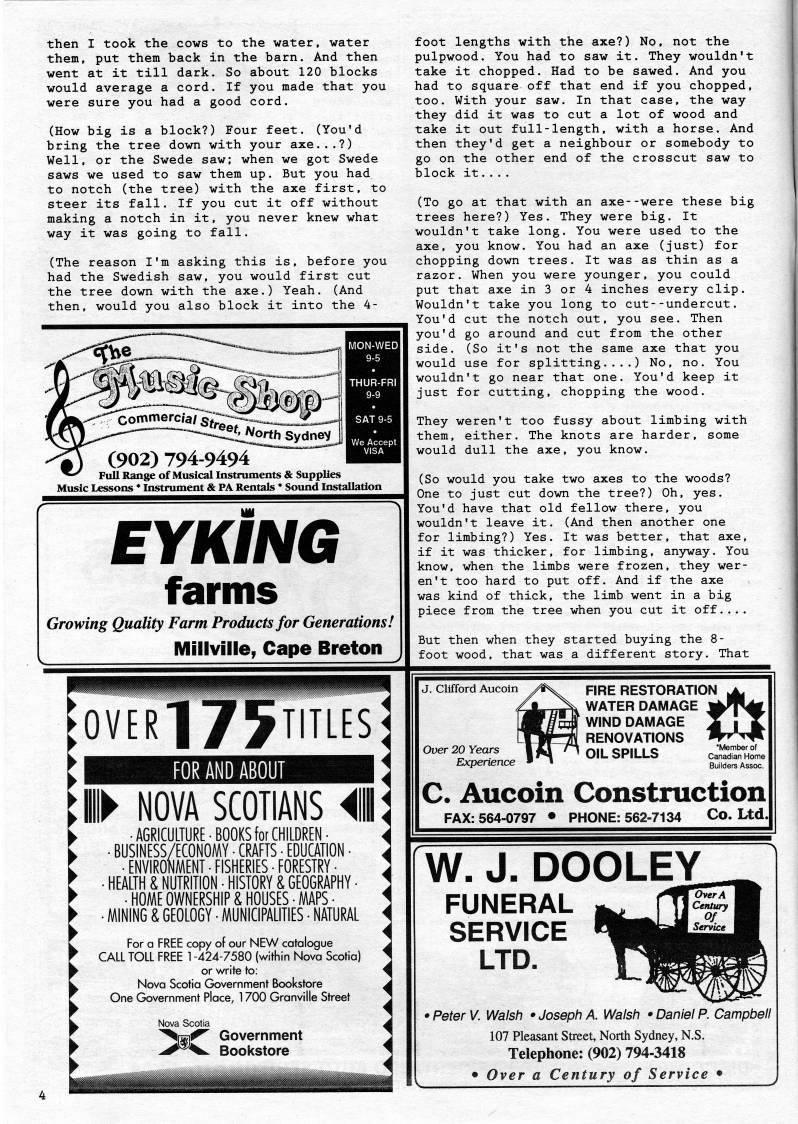 then I took the cows to the water, water them, put them back in the barn. And then went at it till dark. So about 120 blocks would average a cord. If you made that you were sure you had a good cord. (How big is a block?) Four feet. (You'd bring the tree down with your axe...?) Well, or the Swede saw; when we got Swede saws we used to saw them up. But you had to notch (the tree) with the axe first, to steer its fall. If you cut it off without making a notch in it, you never knew what way it was going to fall. (The reason I'm asking this is, before you had the Swedish saw, you would first cut the tree down with the axe.) Yeah. (And then, would you also block it into the 4- Full Range of Musical Instruments & Supplies Music Lessons * Instrument & PA Rentals * Sound Installation EYKING farms Growing Quality Farm Products for Generations! Millville, Cape Breton foot lengths with the axe?) No, not the pulpwood. You had to saw it. They wouldn't take it chopped. Had to be sawed. And you had to square off that end if you chopped, too. With your saw. In that case, the way they did it was to cut a lot of wood and take it out full-length, with a horse. And then they'd get a neighbour or somebody to go on the other end of the crosscut saw to block it.... (To go at that with an axe--were these big trees here?) Yes. They were big. It wouldn't take long. You were used to the axe, you know. You had an axe (just) for chopping down trees. It was as thin as a razor. When you were younger, you could put that axe in 3 or 4 inches every clip. Wouldn't take you long to cut--undercut. You'd cut the notch out, you see. Then you'd go around and cut from the other side. (So it's not the same axe that you would use for splitting....) No, no. You wouldn't go near that one. You'd keep it just for cutting, chopping the wood. They weren't too fussy about limbing with them, either. The knots are harder, some would dull the axe, you know. (So would you take two axes to the woods? One to just cut down the tree?) Oh, yes. You'd have that old fellow there, you wouldn't leave it. (And then another one for limbing?) Yes. It was better, that axe, if it was thicker, for limbing, anyway. You know, when the limbs were frozen, they wer? en't too hard to put off. And if the axe was kind of thick, the limb went in a big piece from the tree when you cut it off.... But then when they started buying the 8- foot wood, that was a different story. That over175titles FOR AND ABOUT ! NOVA SCOTIANS '11 • AGRICULTURE-BOOKS for CHILDREN- • BUSINESS/ECONOMY • CRAFTS - EDUCATION - - ENVIROMENT-FISHERIES-FORESTRY • ILTH & NUTRITION-HISTORY & GEOGRAPHY- - HOME OWNERSHIPS HOUSES-MAPS • I GEOLOGY-MUNICIPALITIES-NATURAL J. Clifford Aucoin Over 20 Years Experience FIRE RESTORATION WATER DAMAGE WIND DAMAGE RENOVATIONS OIL SPILLS th • Member of Canadian Home Builders Assoc C. Aucoin Construction FAX: 564-0797 • PHONE: 562-7134 Co. Ltd.! For o FREE copy of our NEW catalogue CALL TOLL FREE 1 -424-7580 (within Nova Scotia) or write to: Novo Scotia Government Bookstore One Government Place, 1700 Granville Street Nova Scotia 'ra' Government ''' Bookstore i'a'iiMMW W. J. DOOLEY FUNERAL SERVICE LTD. • Peter V. Walsh • Joseph A. Walsh • Daniel P. Campbell 107 Pleasant Street, North Sydney, N.S. Telephone: (902) 794-3418 • Over a Century of Service •