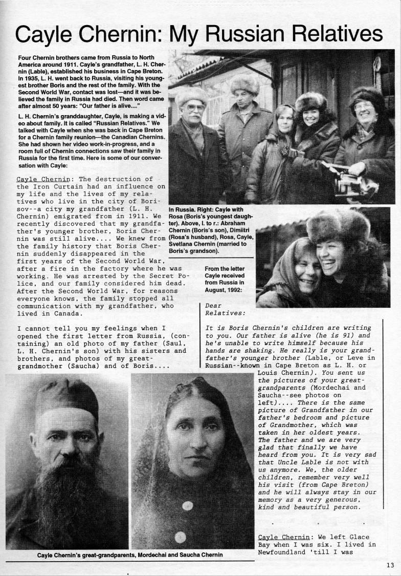 Cayle Chernin: My Russian Relatives Four Chernin brothers came from Russia to North America around 1911. Cayle's grandfather, L. H. Cher? nin (Labie), established his business in Cape Breton. In 1935, L. H. went back to Russia, visiting his young? est brother Boris and the rest of the family. With the Second World War, contact was lost • and it was be? lieved the family in Russia had died. Then word came after almost 50 years: "Our father is alive...." L. H. Chernin's granddaughter, Cayle, is making a vid? eo about family. It is caiied "Russian Relatives." We talked with Cayle when she was back in Cape Breton for a Chernin family reunion • the Canadian Chernins. She had shown her video work-in-progress, and a room full of Chernin connections saw their family in Russia for the first time. Here is some of our conver? sation with Cayle: Cayle Chernin: The destruction of the Iron Curtain had an influence on my life and the lives of my rela? tives who live in the city of Bori- sov--a city my grandfather (L. H. Chernin) emigrated from in 1911. We recently discovered that my grandfa ther's younger brother, Boris Cher? nin was still alive We knew from (Rosa's husband), Rosa, Cayle, the family history that Boris Cher- Svetlana Chernin (married to nin suddenly disappeared in the first years of the Second World War In Russia. Right: Cayle with Rosa (Boris's youngest daugh? ter). Above, I. to r.: Abraham Chernin (Boris's son), Dimiitri Boris's grandson). after a fire in the factory where he was working. He was arrested by the Secret Po? lice, and our family considered him dead. After the Second World War, for reasons everyone knows, the family stopped all communication with my grandfather, who lived in Canada, I cannot tell you my feelings when I opened the first letter from Russia, (con? taining) an old photo of my father (Saul, L. H. Chernin's son) with his sisters and brothers, and photos of my great- grandmother (Saucha) and of Boris.... Cayle Chernin's great-grandparents, Mordechai and Saucha Chernin From the letter Cayle received from Russia in August, 1992: Dear Relatives: It is Boris Chernin's children are writing to you. Our father is alive (he is 91) and he's unable to write himself because his hands are shaking. He really is your grand? father's younger brother ("Lable, or Leve in Russian--khown in Cape Breton as L. H. or Louis Cherninj. You sent us the pictures of your great- grandparents CMordechai and Saucha--see photos on left'.... There is the same picture of Grandfather in our father's bedroom and picture of Grandmother, which was taken in her oldest years. The father and we are very glad that finally we have heard from you. It is very sad that Uncle Lable is not with us anymore. We. the older children, remember very well his visit (from Cape Breton) and he will always stay in our memory as a very generous. kind and beautiful person. Cayle Chernin: We left Glace Bay when I was six. I lived in Newfoundland 'till I was