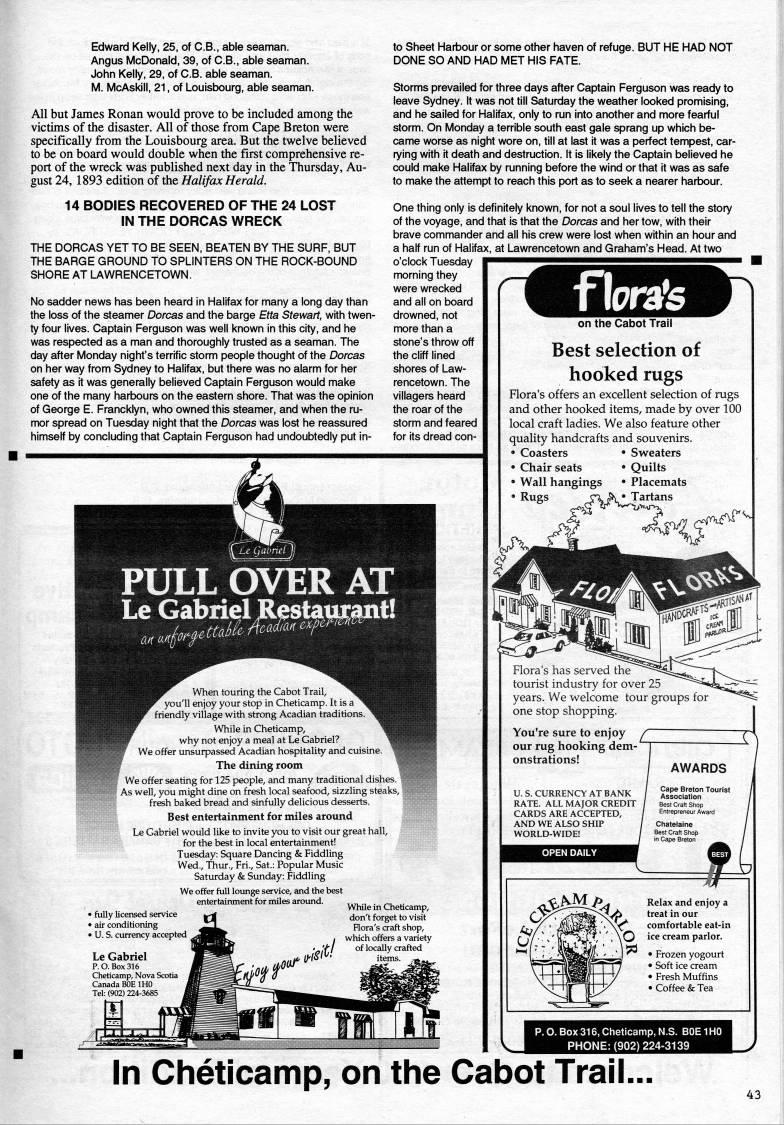 Published by Ronald Caplan on 1994/6/1 (291 reads)Edward Kelly, 25, of C.B., able seaman. Angus McDonald, 39, of C.B., able seaman. John Kelly, 29, of C.B. able seaman. M. McAskill, 21, of Louisbourg, able seaman. All but James Ronan would prove to be included among the victims of the disaster. All of those from Cape Breton were specifically from the Louisbourg area. But the twelve believed to be on board would double when the first comprehensive re? port of the wreck was published next day in the Thursday, Au? gust 24, 1893 edition of the Halifax Herald. 14 BODIES RECOVERED OF THE 24 LOST IN THE DORCAS WRECK THE DORCAS YET TO BE SEEN, BEATEN BY THE SURF, BUT THE BARGE GROUND TO SPLINTERS ON THE ROCK-BOUND SHORE AT LAWRENCETOWN. No sadder news has been heard in Halifax for many a long day than the loss of the steamer Dorcas and the barge Etta Stewart, with twen? ty four lives. Captain Ferguson was well known in this city, and he was respected as a man and thoroughly trusted as a seaman. The day after Monday night's terrific storm people thought of the Dorcas on her way from Sydney to Halifax, but there was no alarm for her safety as it was generally believed Captain Ferguson would make one of the many harbours on the eastern shore. That was the opinion of George E. Francklyn, who owned this steamer, and when the ru? mor spread on Tuesday night that the Dorcas was lost he reassured himself by concluding that Captain Ferguson had undoubtedly put in? to Sheet Harbour or some other haven of refuge. BUT HE HAD NOT DONE SO AND HAD MET HIS FATE. Storms prevailed for three days after Captain Ferguson was ready to leave Sydney. It was not till Saturday the weather looked promising, and he sailed for Halifax, only to run into another and more fearful storm. On Monday a terrible south east gale sprang up which be? came worse as night wore on, till at last it was a perfect tempest, car? rying with it death and destruction. It is likely the Captain believed he could make Halifax by running before the wind or that it was as safe to make the attempt to reach this port as to seek a nearer harbour. One thing only is definitely known, for not a soul lives to tell the story of the voyage, and that is that the Dorcas and her tow, with their brave commander and all his crew were lost when within an hour and a half run of Halifax, at Lawrencetown and Graham's Head. At two o'clock Tuesday morning they were wrecked and all on board drowned, not more than a stone's throw off the cliff lined shores of Law? rencetown. The villagers heard the roar of the storm and feared for its dread con- When touring the Cabot Trail, you'll enjoy your stop in Cheticamp. It is a ' friendly village with strong Acadian traditions. ' While in Cheticamp, why not enjoy a meal at Le Gabriel? We offer unsurpassed Acadian hospitality and cuisine. The dining room We offer seating for 125 people, and many traditional dishes. ' As well, you might dine on fresh local seafood, sizzling steaks, fresh baked bread and sinfully delicious desserts. Best entertainment for miles aroimd Le Gabriel would like to invite you to visit our great hall, for the best in local entertainment! Tuesday: Square Dancing & Fiddling Wed., Thur., Fri., Sat.: Popular Music Saturday & Simday: Fiddling • fuEy licensed service • air conditioning • U. S. ctirrency accepted While in Cheticamp, don't forget to visit Flora's craft shop, which offers a variety of locally crafted items. on the Cabot Trail Best selection of hooked rugs Flora's offers an excellent selection of rugs and other hooked items, made by over 100 local craft ladies. We also feature other quality handcrafts and souvenirs. • Coasters • Chair seats • Wall hangings " Rugs Flora's has served the tourist industry for over 25 years. We welcome tour groups for one stop shopping. You're sure to enjoy /~ our rug hooking dem? onstrations! ip,N.S. BOE 1 HO PHONE: (902) 224-3139 In Cheticamp, on the Cabot Trail...