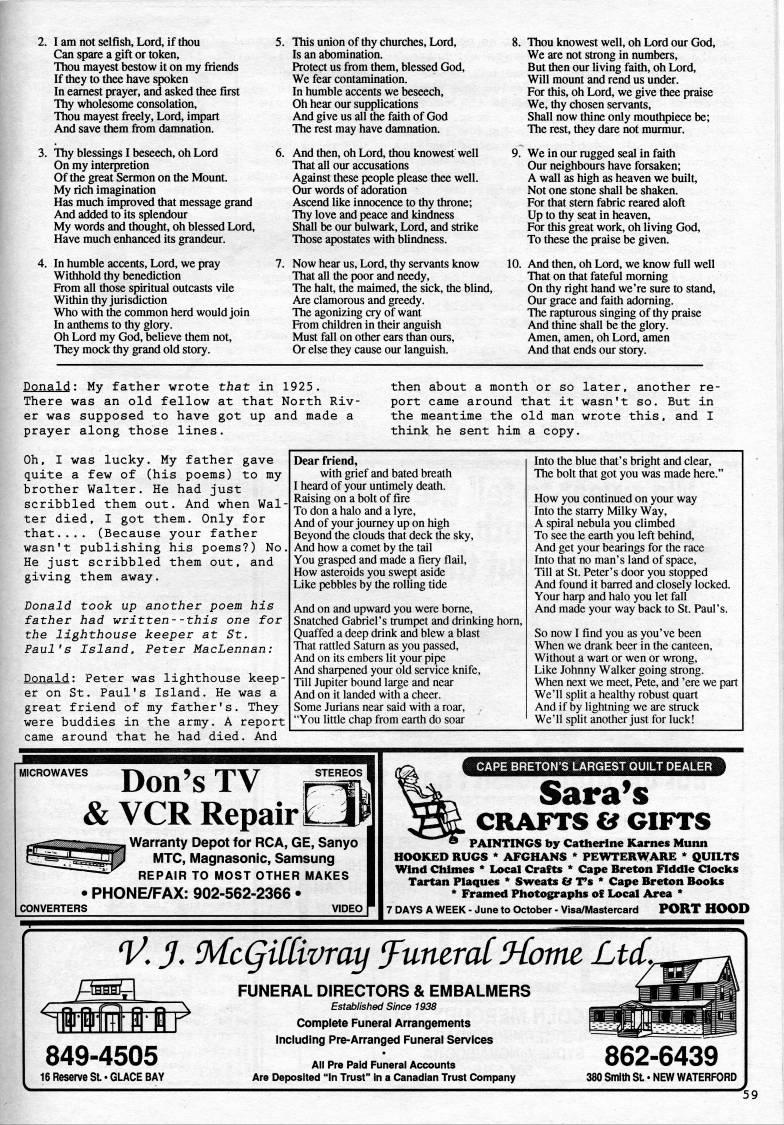 Published by Ronald Caplan on 1994/6/1 (164 reads)2. I am not selfish. Lord, if thou Can spare a gift or token. Thou mayest bestow it on my friends If they to thee have spoken In earnest prayer, and asked thee first Thy wholesome consolation. Thou mayest freely, Lord, impart And save them from damnation. 3. Thy blessings I beseech, oh Lord On my interpretion Of the great Sermon on the Mount. My rich imagination Has much improved that message grand And added to its splendour My words and thought, oh blessed Lord, Have much enhanced its grandeur. 4. In humble accents. Lord, we pray Withhold thy benediction From all those spiritual outcasts vile Within thy jurisdiction Who with the common herd would join In anthems to thy glory. Oh Lord my God, believe them not. They mock thy grand old story. This union of thy churches. Lord, Is an abomination. Protect us from them, blessed God, We fear contamination. In humble accents we beseech. Oh hear our supplications And give us all the faith of God The rest may have damnation. And then, oh Lord, thou knowest well That all our accusations Against these people please thee well. Our words of adoration Ascend like innocence to thy throne; Thy love and peace and kindness Shall be our bulwark. Lord, and strike Those apostates with blindness. Now hear us. Lord, thy servants know That all the poor and needy. The halt, the maimed, the sick, the blind. Are clamorous and greedy. The agonizing cry of want From children in their anguish Must fall on other ears than ours. Or else they cause our languish. 8. Thou knowest well, oh Lord our God, We are not strong in numbers. But then our living faith, oh Lord, Will moimt and rend us under. For this, oh Lord, we give thee praise We, thy chosen servants. Shall now thine only mouthpiece be; The rest, they dare not murmur. 9. We in our rugged seal in faith Our neighbours have forsaken; A wall as high as heaven we built. Not one stone shall be shaken. For that stern fabric reared aloft Up to thy seat in heaven. For this great work, oh living God, To these the praise be given. 10. And then, oh Lord, we know fiill well That on that fateful moming On thy right hand we're sure to stand, Our grace and faith adorning. The rapturous singing of thy praise And thine shall be the glory. Amen, amen, oh Lord, amen And that ends our story. Donald; My father wrote that in 1925. There was an old fellow at that North Riv? er was supposed to have got up and made a prayer along those lines. then about a month or so later, another re? port came around that it wasn't so. But in the meantime the old man wrote this, and I think he sent him a copy. Oh, I was lucky. My father gave quite a few of (his poems) to my brother Walter. He had just scribbled them out. And when Wal? ter died, I got them. Only for that.... (Because your father wasn't publishing his poems?) No. He just scribbled them out, and giving them away. Donald took up another poem his father had written--this one for the lighthouse keeper at St. Paul's Island, Peter MacLennan: Donald: Peter was lighthouse keep? er on St. Paul's Island. He was a great friend of my father's. They were buddies in the army. A report came around that he had died. And Dear friend, with grief and bated breath I heard of your untimely death. Raising on a bolt of fire To don a halo and a lyre, And of your journey up on high Beyond the clouds that deck the sky, And how a comet by the tail You grasped and made a fiery flail, How asteroids you swept aside Like pebbles by the rolling tide And on and upward you were borne, Snatched Gabriel's trumpet and drinking horn, Quaffed a deep drink and blew a blast That rattled Saturn as you passed, And on its embers lit your pipe And sharpened your old service knife. Till Jupiter bound large and near And on it landed with a cheer. Some Jurians near said with a roar, "You little chap from earth do soar Into the blue that's bright and clear. The bolt that got you was made here." How you continued on your way Into the starry Milky Way, A spiral nebula you climbed To see the earth you left behind, And get your bearings for the race Into that no man's land of space, Till at St. Peter's door you stopped And found it barred and closely locked. Your harp and halo you let fall And made your way back to St. Paul's. So now I find you as you've been When we drank beer in the canteen. Without a wart or wen or wrong. Like Johnny Walker going strong. When next we meet, Pete, and 'ere we part We'll split a healthy robust quart And if by lightning we are struck We'll split another just for luck! '' Don's TV & VCR Repair I q Warranty Depot for RCA, GE, Sanyo MTC, Magnasonic, Samsung REPAIR to most OTHER MAKES PHONE/FAX: 902-562-2366 • CONVERTERS >ailiiliafeliH'!iH4i<'l'llti'HJ'!=lii Sara's CRAFTS & GIFTS PAINTINGS by Catherine Karnes Munn HOOKED RUGS * AFGHANS * PEWTERWARE * QUILTS ''nd Chimes * Local Crafts * Cape Breton Hddle Clocks Tartan Plaques * Sweats & T's * Cape Breton Books * Framed Photographs o?? Local Area * 7 DAYS A WEEK - June to October - Visa/Mastercard PORT HOOD 849-4505 16 Reserve St • GLACE BAY '. J. McQiCCivray 'untratHomt Lid. FUNERAL DIRECTORS & EMBALMERS Establlstied Since 1938 Complete Funeral Arrangements Including Pre-Arranged Funeral Services All Pre Paid Funeral Accounts Are Deposited "in Trust" in a Canadian Trust Company 862-6439 380 Smith SL • NEW WATERFORD 59