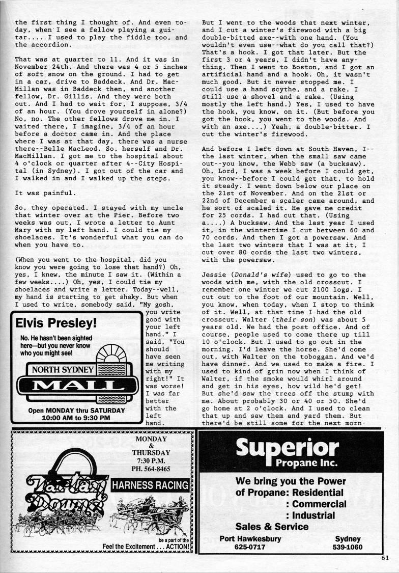 Published by Ronald Caplan on 1994/6/1 (144 reads)the first thing I thought of. And even to? day, when'I see a fellow playing a gui? tar.... I used to play the fiddle too, and the accordion. That was at quarter to 11. And it was in November 24th. And there was 4 or 5 inches of soft snow on the ground. I had to get in a car, drive to Baddeck. And Dr. Mac? Millan was in Baddeck then, and another fellow. Dr. Gillis. And they were both out. And I had to wait for, I suppose, 3/4 of an hour. (You drove yourself in alone?) No, no. The other fellows drove me in. I waited there, I imagine, 3/4 of an hour before a doctor came in. And the place where I was at that day, there was a nurse there--Belle MacLeod. So, herself and Dr. MacMillan. I got me to the hospital about 4 o'clock or quarter after 4--City Hospi? tal (in Sydney). I got out of the car and I walked in and I walked up the steps. It was painful. So, they operated. I stayed with my uncle that winter over at the Pier. Before two weeks was out, I wrote a letter to Aunt Mary with my left hand. I could tie my shoelaces. It's wonderful what you can do when you have to. (When you went to the hospital, did you know you were going to lose that hand?) Oh, yes, I knew, the minute I saw it. (Within a few weeks....) Oh, yes, I could tie my shoelaces and write a letter. Today--well, my hand is starting to get shaky. But when I used to write, somebody said, "My gosh, you write good with your left hand." I said, "You should have seen me writing with my right!" It was worse! I was far better with the left hand. Elvis Presley! No. He hasn't been sighted here • but you never know who you might see! [ NORTH SYDNEY IVE>'VI_JiL- Open MONDAY thru SATURDAY 10:00 AM to 9:30 PM But I went to the woods that next winter, and I cut a winter's firewood with a big double-bitted axe--with one hand. (You wouldn't even use--what do you call that?) That's a hook. I got that later. But the first 3 or 4 years, I didn't have any? thing. Then I went to Boston, and I got an artificial hand and a hook. Oh, it wasn't much good. But it never stopped me. I could use a hand scythe, and a rake. I still use a shovel and a rake. (Using mostly the left hand.) Yes, I used to have the hook, you know, on it. (But before you got the hook, you went to the woods. And with an axe....) Yeah, a double-bitter. I cut the winter's firewood. And before I left down at South Haven, I-- the last winter, when the small saw came out--you know, the Webb saw (a bucksaw). Oh, Lord, I was a week before I could get, you know--before I could get that, to hold it steady. I went down below our place on the 21st of November. And on the 21st or 22nd of December a scaler came around, and he sort of scaled it. He gave me credit for 25 cords. I had cut that. (Using a....) A bucksaw. And the last year I used it, in the wintertime I cut between 60 and 70 cords. And then I got a powersaw. And the last two winters that I was at it, I cut over 80 cords the last two winters, with the powersaw. Jessie (.Donald's wife) used to go to the woods with me, with the old crosscut. I remember one winter we cut 2100 logs. I cut out to the foot of our mountain. Well, you know, when today, when I stop to think of it. Well, at that time I had the old crosscut. Walter (their son) was about 5 years old. We had the post office. And of course, people used to come there up till 10 o'clock. But I used to go out in the morning. I'd leave the horse. She'd come out, with Walter on the toboggan. And we'd have dinner. And we used to make a fire. I used to kind of grin now when I think of Walter, if the smoke would whirl around and get in his eyes, how wild he'd get! But she'd saw the trees off the stump with me. About probably 30 or 40 or 50. She'd go home at 2 o'clock. And I used to clean that up and saw them and yard them. But there'd be still some for the next morn-