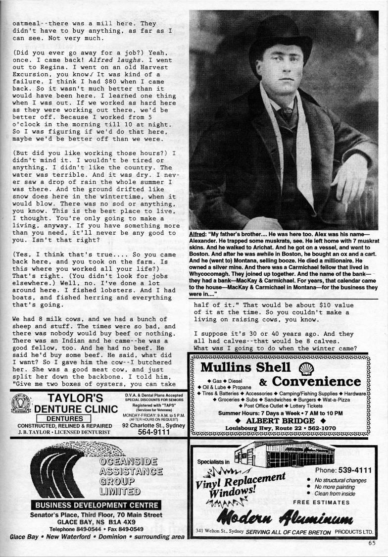 oatmeal--there was a mill here. They didn't have to buy anything, as far as I can see. Not very much. (Did you ever go away for a job?) Yeah, once. I came back! Alfred laughs. I went out to Regina. I went on an old Harvest Excursion, you know.r It was kind of a failure. I think I had $80 when I came back. So it wasn't much better than it would have been here. I learned one thing when I was out. If we worked as hard here as they were working out there, we'd be better off. Because I worked from 5 o'clock in the morning till 10 at night. So I was figuring if we'd do that here, maybe we'd be better off than we were. (But did you like working those hours?) I didn't mind it. I wouldn't be tired or anything. I didn't like the country. The water was terrible. And it was dry. I nev? er saw a drop of rain the whole summer I was there. And the ground drifted like snow does here in the wintertime, when it would blow. There was no sod or anything, you know. This is the best place to live, I thought. You're only going to make a living, anyway. If you have something more than you need, it'll never be any good to you. Isn't that right? (Yes, I think that's true.... So you came back here, and you took on the farm. Is this where you worked all your life?) That's right. (You didn't look for jobs elsewhere.) Well, no. I've done a lot around here. I fished lobsters. And I had boats, and fished herring and everything that's going. We had 8 milk cows, and we had a bunch of sheep and stuff. The times were so bad, and there was nobody would buy beef or nothing. There was an Indian and he came--he was a good fellow, too. And he had no beef. He said he'd buy some beef. He said, what did I want? So I gave him the cow--I butchered her. She was a good meat cow, and just split her down the backbone. I told him, "Give me two boxes of oysters, you can take TAYLOR'S DENTURE CLINIC I DENTURES I CONSTRUCTED, RELINED & REPAIRED J. B. TAYLOR • LICENSED DENTURIST D.V.A. & Dental Plans Accepted SPECIAL DISCOUNTS FOR SENIORS Registered with "TAPS" (Services for Veterans) MONDAY-FRIDAY: 9 A.M. to 5 P.M. (AFTER HOURS ON REQUEST) 92 Charlotte St., Sydney 564-9111 Alfred: "My father's brother.... He was here too. Alex was his name- Alexander. He trapped some muskrats, see. He left home with 7 muskrat skins. And he walked to Arichat. And he got on a vessel, and went to Boston. And after he was awhile in Boston, he bought an ox and a cart. And he (went to) Montana, selling booze. He died a millionaire. He owned a silver mine. And there was a Carmichael fellow that lived in Whycocomagh. They joined up together. And the name of the bank • they had a bank • MacKay & Carmichael. For years, that calendar came to the house • MacKay & Carmichael in Montana • for the business they were in...." half of it." That would be about $10 value of it at the time. So you couldn't make a living on raising cows, you know. I suppose it's 30 or 40 years ago. And they all had calves--that would be 8 calves. What was I going to do when the winter came? I MuUins SheU i??o;s:'Cans & Convenience | ??V, Tires & Batteries Accessories Camping/Fishing Supplies Hardware J' [%' Groceries Subs Sandwiches Burgers Wat-a-Pizza j,' j! Post Office Outlet Lottery Tickets jS !v' Summer Hours: 7 Days a Week • 7 AM to 10 PM '}$ i? ALBERT BRIDGE g :'- Louisbourg Hwy, Route 22 • 562-1070 l> BUSINESS DEVELOPMENT CENTRE Senator's Place, Third Floor, 70 Main Street GLACE BAY, NS BIA 4X9 Telephone 849'544 • Fax 849'549 Glace Bay • New Waterford • Dominion • surrounding a hndoyvs! 341 Welton St.. Sydney SERVING ALL OF CAPE BRETON PRODUCTS LTD. Phone:539-4111 • No structural changes • No more painting • Clean from inside FREE ESTIMATES 65