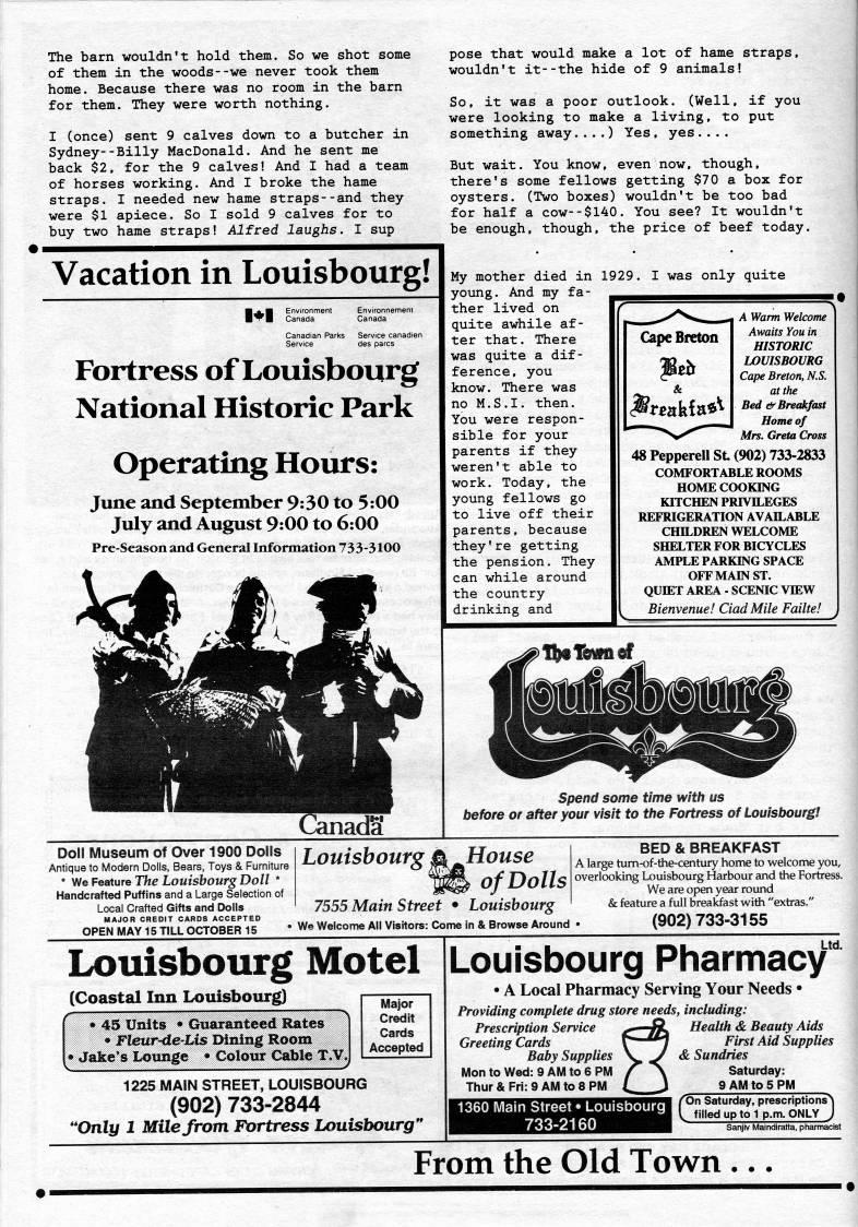 The barn wouldn't hold them. So we shot some of them in the woods--we never took them home. Because there was no room in the barn for them. They were worth nothing. I (once) sent 9 calves down to a butcher in Sydney--Billy MacDonald. And he sent me back $2, for the 9 calves! And I had a team of horses working. And I broke the hame straps. I needed new hame straps--and they were $1 apiece. So I sold 9 calves for to buy two hame straps! Alfred laughs. I sup Vacation in Louisbourg! 1'1 'c. Canada Canada Canadian Parks Service ci Fortress of Louisbourg National Historic Park Operating Hours: June and September 9:30 to 5:00 July and August 9:00 to 6:00 Pre-Season and General Information 733-3100 pose that would make a lot of hame straps, wouldn't it--the hide of 9 animals! So, it was a poor outlook. (Well, if you were looking to make a living, to put something away....) Yes, yes .... But wait. You know, even now, though, there's some fellows getting $70 a box for oysters. (Two boxes) wouldn't be too bad for half a cow--$140. You see? It wouldn't be enough, though, the price of beef today. My mother died in young. And my fa? ther lived on quite awhile af? ter that. There was quite a dif? ference, you know. There was no M.S.I, then. You were respon? sible for your parents if they weren't able to work. Today, the young fellows go to live off their parents, because they're getting the pension. They can while around the country drinking and 1929. I was only quite A Warm Welcome Awaits You in HISTORIC LOUISBOURG Cape Breton, N.S. at the Bed & Breakfast Home of Mrs. Greta Cross 48 Pepperell St (902) 733-2833 COMFORTABLE ROOMS HOME COOKING KITCHEN PRIVILEGES REFRIGERATION AVAILABLE CHILDREN WELCOME SHELTER FOR BICYCLES AMPLE PARKING SPACE OFF MAIN ST. QUIET AREA - SCENIC VIEW Bienvenue! Ciad Mile Failte! f>'%fmmd spend some time with us before or after your visit to the Fortress of LouisbourgI Doll Museum of Over 1900 Dolls Antique to Modern Dolls, Bears, Toys & Furniture * y'e Feature The Louisbourg Doll * Handcrafted Puffins and a Large Selection of Local Crafted Gifts and Dolls MAJOR CREDIT CARDS ACCEPTED Louisbourg j 7555 Main Street 'House of Dolls Louishourg OPEN MAY 15 TILL OCTOBER 15 • We Welcome All Visitors: Come in & Browse Around • BED & BREAKFAST A large tum-of-the-century home to welcome you, overlooking Louisbourg Harbour and the Fortress. We are open year round & feature a full breakfast with "extras." (902)733-3155 Louisbourg Motel (Coastal Inn Louisbourg) • 45 Units • Guaranteed Rates • Fleur-de-Lis Dining Room • Jake's Lounge • Colour Cable T.V, Major Credit Cards Accepted 1225 MAIN STREET, LOUISBOURG (902) 733-2844 "Only 1 Mile from Fortress Louisbourg** Louisbourg Pharmacy • A Local Pharmacy Serving Your Needs • Providing complete drug store needs, including: Prescription Service 4''f' Health & Beauty Aids Greeting Cards V"'/ '''' '' Supplies Baby Supplies ' ' <' Sundries Mon to Wed: 9 AM to 6 PM / "N Saturday: Thur & Fri: 9 AM to 8 PM (. J 9 AM to 5 PM /"On Saturday, prescriptions' V' filled up to 1 p.m. ONLY J Sanjiv Maindirana, pharmacist 1360 Mam Street • Louisbourg 733-2160 From the Old Town