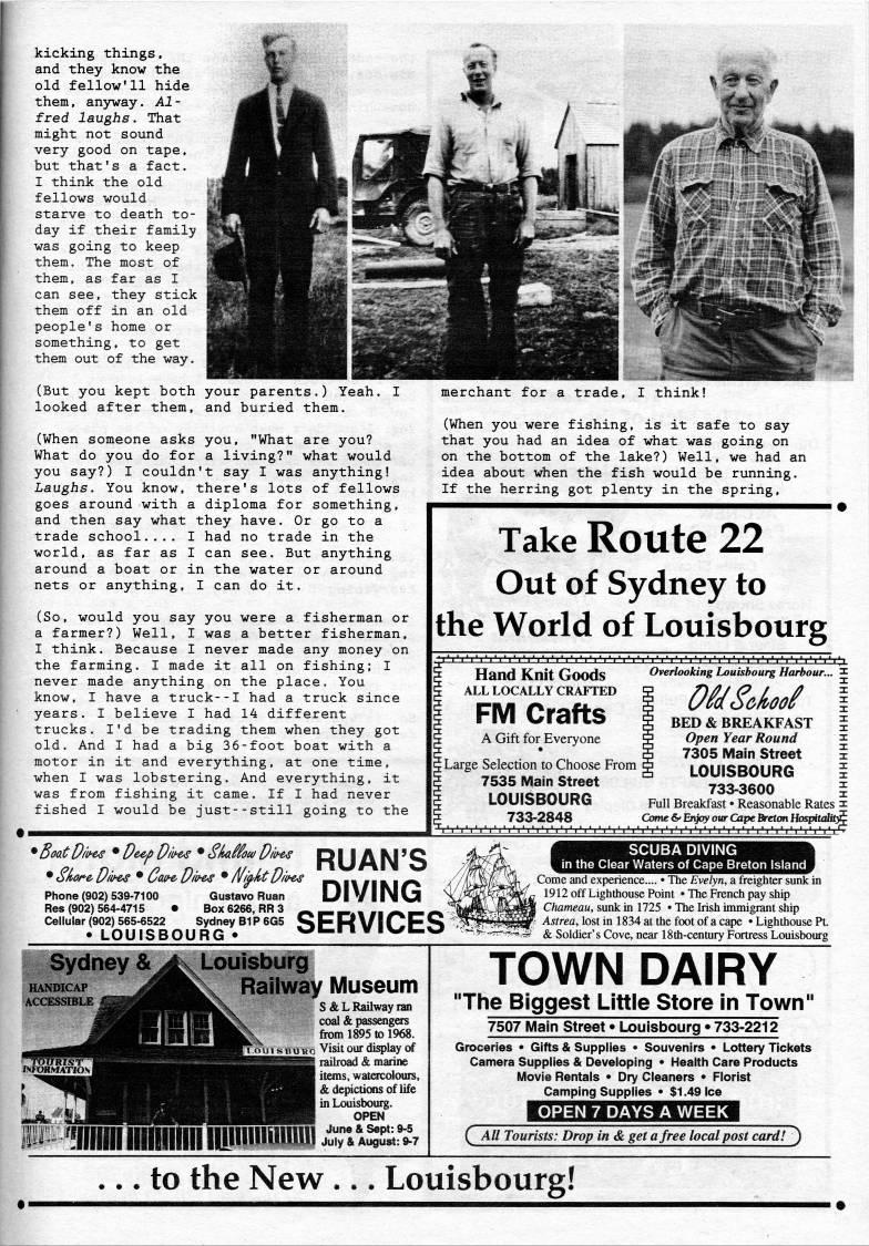 kicking things, and they know the old fellow'11 hide them, anyway. Al- fred laughs. That might not sound very good on tape, but that's a fact. I think the old fellows would starve to death to? day if their family was going to keep them. The most of them, as far as I can see, they stick them off in an old people's home or something, to get them out of the way. (But you kept both your parents.) Yeah. I looked after them, and buried them. (When someone asks you, "What are you? What do you do for a living?" what would you say?) I couldn't say I was anything! Laughs. You know, there's lots of fellows goes around with a diploma for something, and then say what they have. Or go to a trade school.... I had no trade in the world, as far as I can see. But anything around a boat or in the water or around nets or anything, I can do it. merchant for a trade, I think! (When you were fishing, is it safe to say that you had an idea of what was going on on the bottom of the lake?) Well, we had an idea about when the fish would be running. If the herring got plenty in the spring. (So, would you s, a farmer?) Well, I think. Because the farming. I m, never made anyth know, I have a t years. I believe trucks. I'd be t old. And I had a motor in it and when I was lobst' was from fishing fished I would b' ay you were a fisherman or I was a better fisherman, I never made any money on de it all on fishing; I ing on the place. You ruck--I had a truck since I had 14 different rading them when they got big 36-foot boat with a everything, at one time, ering. And everything, it it came. If I had never e just--still going to the Take Route 22 Out of Sydney to the World of Louisbourg Hand Knit Goods ALL LOCALLY CRAFTED FM Crafts A Gift for Everyone : Large Selection to Choose From 7535 Main Street LOUISBOURG 733-2848 Overlooking Louisbourg Harbour... ' OidSckooi f BED & BREAKFAST ' Open Year Round ' 7305 Main Street z LOUISBOURG X 733-3600 ' Full Breakfast • Reasonable Rates ' Come &Enioy; our Cape BretonHospitdb?? • BoatDio-es • Deeff P/b-e' • Ski'oa; Dive' R U A N ' S Phone (902) 539-7100 Gustavo Ruan UIVI IM (jl Res (902) 564-4715 • Box 6266, RR3 -'----',-,,-''-' Cellular (902) 565-6522 Sydney B1P6G5 'FKl/inF' • LOUISBOURG • OtnviV't' SCUBA DIVING r Waters of Cape Breton Island , Come and experience.... • The Evelyn, a freighter sunk in 1912 off Lighthouse Point • The French pay ship Chameau, sunk in 1725 • The Irish immigrant ship _' Astrea, lost in 1834 at the foot of a cape • Lighthouse Pt. ''''- & Soldier's Cove, near 18th-century Fortress Louisbourg |tl.'?| Railway Museum S&L; Railway ran coal & passengCTs from 1895 to 1968. lu IS BUBO Visit our display of railroad & marine items, watracolouis, & depictions of life in Louisbourg. _ OPEN TOWN DAIRY "The Biggest Little Store in Town" 7507 Main Street • Louisbourg * 733-2212 Groceries • Gifts & Supplies • Souvenirs • Lottery Ticl