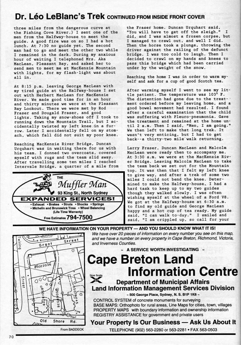 Dr. Leo LeBlanc's Trek continued from inside front cover three miles from the dangerous curve at the Fishing Cove River.) I sent one of the men from the Halfway-house to meet the guide. A good fire was on so I had a hot lunch. At 7:30 no guide yet. The second man had to go and meet the other two while I remained in the dark. During my anxious hour of waiting I telephoned Mrs. Aka MacLean, Pleasant Bay, and asked her to send men to meet me at MacKenzie Mountain with lights, for my flash-light was about all in. At 8:15 p.m. leaving George MacLean with my tired guide at the Halfway-house I set out with Herbert MacLean for MacKenzie River. We made good time for in an hour and thirty minutes we were at the Pleasant Bay Lookout. There we were met by Rod Fraser and Dougald Fraser, and good lights. Taking my snow-shoes off I took to running down the Mountain Trail, but I ac? cidentally twisted my left knee in a fur? row. Later I accidentally fell on my stom? ach, which fall did not suit my poor knee. Reaching MacKenzie River Bridge, Duncan Urquhart was in waiting there for us with his team. I donned two overcoats, covered myself with rugs and the team slid away. After travelling some ten miles I reached Intervale Bridge, a quarter of a mile from MuffUr Man 93 King St., North Sydney EX:f>ANDE:D 3ERVIOE3! Exhaust 'Brakes • Struts • Shocks • Springs Michelln and Brunswick Tires • Wheel Balancing (Life Time Warranty) Free Estimates 794-7500 the Fraser home. Duncan Urquhart said, "You will have to get off the sleigh." I did, and I was almost a frozen corpse, but I managed to crawl out, and well I did. Then the horse took a plunge, throwing the driver against the railing of the defunct bridge. I was too cold to laugh. Then I decided to crawl on my hands and knees to pass this bridge which had been carried under by the weight of the snow. Reaching the home I was in order to warm my? self and ask for a cup of good Scotch tea. After warming myself I went to see my lit? tle patient. The temperature was 103? F. The distention had gone due to the treat- ' ment ordered before my leaving home, and a good bowel movement had resulted. I found after a careful examination that the child was suffering with Pleuro-pneumonia. Gave the treatment and remained at the home un? til 2 a.m. Then I said, "Men, I am going." We then left to make that long trek. It wasn't very enticing, but I had to get back--a thirty-two mile walk returning. Larry Fraser, Duncan MacLean and Malcolm MacLean were ready then to accompany me. At 3:30 a.m. we were at the MacKenzie Riv? er Bridge. Leaving Malcolm MacLean to take the team back we set out for the Mountain top. It was then that I felt my left knee to give way, and after a trek of some two miles I could not bend the knee. Deter? mined to make the Halfway-house, I had a hard task to keep up to my two guides though they walked slowly. I was often wishing myself at the wheel of a Ford V8. We got at the Halfway-house at 6:30 a.m. to find my old guide and George MacLean happy and a hot cup of tea ready. My guide said, "I can walk to-day." I smiled and said, "I am crippled up, so call for your WE HAVE INFORMATION ON YOUR PROPERTY • AND YOU SHOULD KNOW WHAT IT IS! We have over 20 pieces of information on every number you see on this map, and we have a number on every property in Cape Breton, Richmond, Victoria, and Inverness Counties. " A SERVICE WORTH INVESTIGATING ~ Cape Breton Land Information Centre From BADDECK Department of Municipal Affairs Land Information Management Services Division ~ 500 George Place, Sydney, N. S. B1P 1K6 ~ CONTROL SYSTEM of concrete monuments for surveying BASE MAPS: Orthophoto for rural areas, Line Maps for cities, town, villages PROPERTY MAPS with boundary information and ownership information REGISTRY ASSISTANCE for government and private users Your Property Is Our Business • Ask Us About It TELEPHONE (902) 563-2280 or 563-2281 • FAX 563-0503