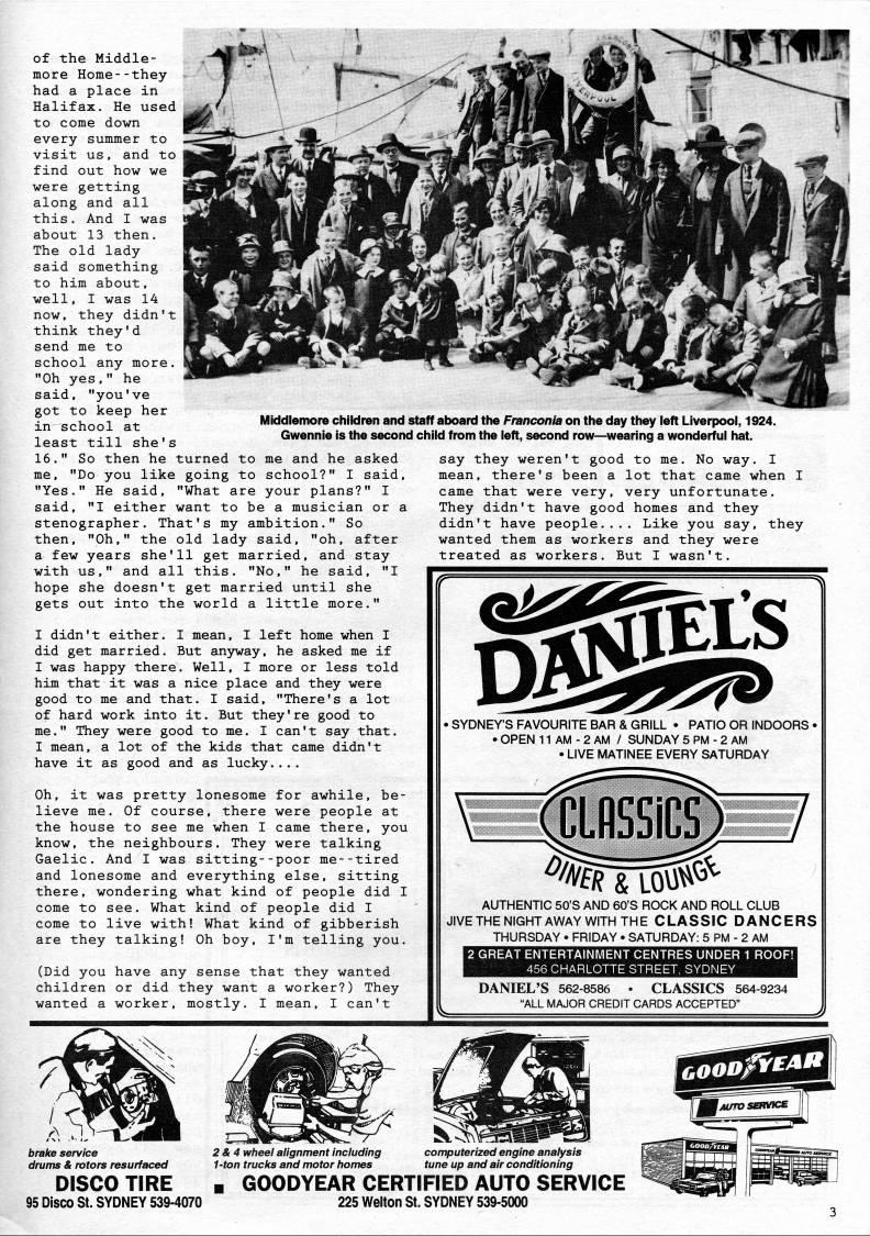 Published by Ronald Caplan on 1994/8/1 (283 reads)of the Middle- more Home--they had a place in Halifax. He used to come down every summer to visit us, and to find out how we were getting along and all this. And I was about 13 then. The old lady said something to him about, well, I was 14 now, they didn't think they'd send me to school any more. "Oh yes," he said, "you've got to keep her in-school at least till she's 16," So then he turned to me and he asked me, "Do you like going to school?" I said, "Yes," He said, "What are your plans?" I said, "I either want to be a musician or a stenographer. That's my ambition," So then, "Oh," the old lady said, "oh, after a few years she'll get married, and stay with us," and all this, "No," he said, "I hope she doesn't get married until she gets out into the world a little more," I didn't either, I mean, I left home when I did get married. But anyway, he asked me if I was happy there. Well, I more or less told him that it was a nice place and they were good to me and that. I said, "There's a lot of hard work into it. But they're good to me." They were good to me. I can't say that. I mean, a lot of the kids that came didn't have it as good and as lucky.... Oh, it was pretty lonesome for awhile, be? lieve me. Of course, there were people at the house to see me when I came there, you know, the neighbours. They were talking Gaelic, And I was sitting--poor me--tired and lonesome and everything else, sitting there, wondering what kind of people did I come to see. What kind of people did I come to live with! What kind of gibberish are they talking! Oh boy, I'm telling you, (Did you have any sense that they wanted children or did they want a worker?) They wanted a worker, mostly, I mean, I can't Middlemore children and staff aboard the Franconia on the day they left Liverpool, 1924. Gwennie is the second child from the left, second row • wearing a wonderful hat. say they weren't good to me. No way. I mean, there's been a lot that came when I came that were very, very unfortunate. They didn't have good homes and they didn't have people.... Like you say, they wanted them as workers and they were treated as workers. But I wasn't. • SYDNEY'S FAVOURITE BAR & GRILL • PATIO OR INDOORS ? • OPEN 11 AM - 2 AM / SUNDAY 5 PM - 2 AM • LIVE MATINEE EVERY SATURDAY AUTHENTIC 50'S AND 60'S ROCK AND ROLL CLUB JIVE THE NIGHT AWAY WITH THE CLASSIC DANCERS THURSDAY • FRIDAY • SATURDAY: 5 PM - 2 AM EAT ENTERTAINMENT CENTRES UNDER 1 ROOF! 456 CHARLOTTE STREET, SYDNEY DANIEL'S 562-8586 • CLASSICS 564-9234 "ALL MAJOR CREDIT CARDS ACCEPTED" e service drums & rotors resurfaced DISCO TIRE 95 Disco St. SYDNEY 539-4070 2&4 wheel alignment including 1-ton trucks and motor homes computerized engine analysis tune up and air conditioning GOODYEAR CERTIFIED AUTO SERVICE 225 Welton St. SYDNEY 539-5000