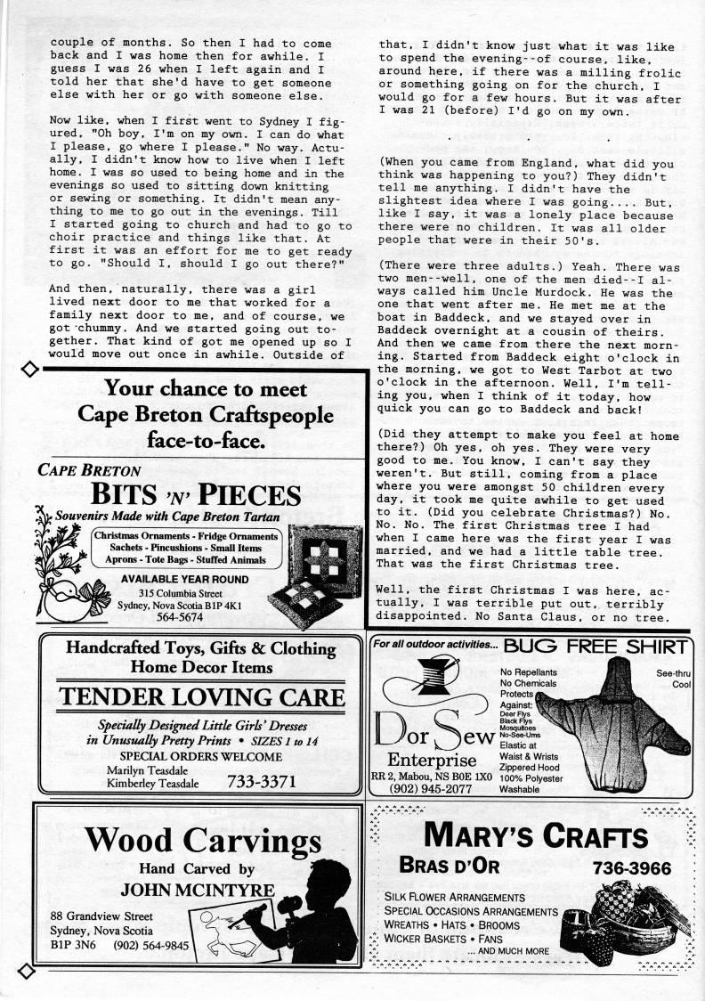 Published by Ronald Caplan on 1994/8/1 (341 reads)coup] back guess told else .e of and months. So ther I was , I was 26 her with that her home when she'd or go then I had for awh I left again have with to get someone to come ile. I and I someone else. Now like, when I first went to Sydney I fig? ured, "Oh boy, I'm on my own. I can do what I please, go where I please." No way. Actu? ally, I didn't know how to live when I left home. I was so used to being home and in the evenings so used to sitting down knitting or sewing or something. It didn't mean any? thing to me to go out in the evenings. Till I started going to church and had to go to choir practice and things like that. At first it was an effort for me to get ready to go. "Should I, should I go out there?" And then, naturally, there was a girl lived next door to me that worked for a family next door to me, and of course, we got "chummy. And we started going out to? gether. That kind of got me opened up so I would move out once in awhile. Outside of Your chance to meet Cape Breton Craftspeople face-to-face. Cape Breton BITS w PIECES Souvenirs Made with Cape Breton Tartan Christmas Ornaments - Fridge Ornaments Sachets - Pincushions - Small Items Aprons - Tote Bags - Stuffed Animals AVAILABLE YEAR ROUND 315 Columbia Street Sydney, Nova Scotia BIP 4K1 564-5674 that, I didn't know just what it was like to spend the evening--of course, like, around here, if there was a milling frolic or something going on for the church, I would go for a few hours. But it was after I was 21 (before) I'd go on my own. (When you came from England, what did you think was happening to you?) They didn't tell me anything. I didn't have the slightest idea where I was going.... But, like I say, it was a lonely place because there were no children. It was all older people that were in their 50's. (There were three adults.) Yeah. There was two men--well, one of the men died--I al? ways called him Uncle Murdock. He was the one that went after me. He met me at the boat in Baddeck, and we stayed over in Baddeck overnight at a cousin of theirs. And then we came from there the next morn? ing. Started from Baddeck eight o'clock in the morning, we got to West Tarbot at two o'clock in the afternoon. Well, I'm tell? ing you, when I think of it today, how quick you can go to Baddeck and back! (Did they attempt to make you feel at home there?) Oh yes, oh yes. They were very good to me. You know, I can't say they weren't. But still, coming from a place where you were amongst 50 children every day, it took me quite awhile to get used to it. (Did you celebrate Christmas?) No. No. No. The first Christmas tree I had when I came here was the first year I was married, and we had a little table tree. That was the first Christmas tree. Well, the first Christmas I was here, ac? tually. I was terrible put out, terribly disappointed. No Santa Claus, or no tree. Handcrafted Toys, Gifts & Clothing Home Decor Items TENDER LOVING CARE Specially Designed Little Girls' Dresses in Unusually Pretty Prints • SIZES 1 to 14 SPECIAL ORDERS WELCOME Marilyn Teasdale Kimberley Teasdale / 'D~DD/ i. >or all outdoor activities... BUG FREE SHIRT ''S'J '? Repeilants /' y'''' No Chemicals v. ' -',' Protects fl|| '-' ) Against: V'''' TI X (' ' -' Deer Flys ''''M n L Black Flys ''''W 1 II ''' Mosquitoes 'Silf L/or'ew-STcr ' Enterprise "'''Ji', RR 2, Mabou, NS BOE 1X0 100% Polyester , (902) 945-2077 Washable 'HH See-thru jHB Cool jpiiiiiiir ' Wood Carvings Hand Carved by JOHNMCINTYRE 88 Grandview Street Sydney, Nova Scotia BIP 3N6 (902) 564-9845 O' MARY'S Crafts Bras d'Or Silk Flower Arrangements Special occasions arrangements wreaths • hats • brooms Wicker Baskets • fans | ... AND MUCH MORE