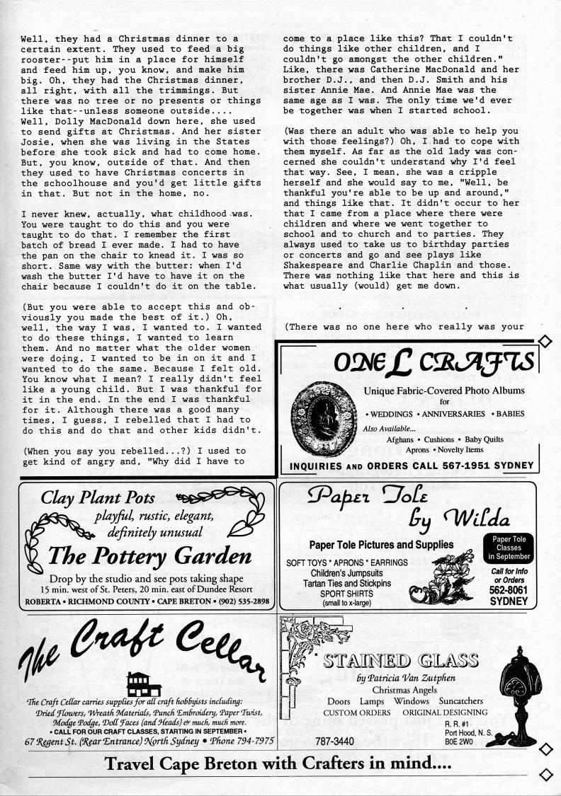 Published by Ronald Caplan on 1994/8/1 (268 reads)Well, they had a Christmas dinner to a certain extent. They used to feed a big rooster--put him in a place for himself and feed him up, you know, and make him big. Oh, they had the Christmas dinner, all right, with all the trimmings. But there was no tree or no presents or things like that--unless someone outside.... Well, Dolly MacDonald down here, she used to send gifts at Christmas. And her sister Josie, when she was living in the States before she took sick and had to come home. But, you know, outside of that. And then they used to have Christmas concerts in the schoolhouse and you'd get little gifts in that. But not in the home, no. I never knew, actually, what childhood was. You were taught to do this and you were taught to do that. I remember the first batch of bread I ever made. I had to have the pan on the chair to knead it. I was so short. Same way with the butter: when I'd wash the butter I'd have to have it on the chair because I couldn't do it on the table. (But you were able to accept this and ob? viously you made the best of it.) Oh, well, the way I was, I wanted to. I wanted to do these things, I wanted to learn them. And no matter what the older women were doing, I wanted to be in on it and I wanted to do the same. Because I felt old. You know what I mean? I really didn't feel like a young child. But I was thankful for it in the end. In the end I was thankful for it. Although there was a good many times, I guess, I rebelled that I had to do this and do that and other kids didn't. (When you say you rebelled...?) I used to get kind of angry and, "Why did I have to Clay Plant Pots playful, rustic, elegant, definitely unusual The Pottery Garden Drop by the studio and see pots taking shape 15 min. west of St. Peters, 20 min. east of Dundee Resort ROBERTA • RICHMOND COUNTY • CAPE BRETON • (902) 535-2898 come to a place like this? That I couldn't do things like other children, and I couldn't go amongst the other children." Like, there was Catherine MacDonald and her brother D.J., and then D.J. Smith and his sister Annie Mae. And Annie Mae was the same age as I was. The only time we'd ever be together was when I started school. (Was there an adult who was able to help you with those feelings?) Oh, I had to cope with them myself. As far as the old lady was con? cerned she couldn't understand why I'd feel that way. See, I mean, she was a cripple herself and she would say to me, "Well, be thankful you're able to be up and around," and things like that. It didn't occur to her that I came from a place where there were children and where we went together to school and to church and to parties. They always used to take us to birthday parties or concerts and go and see plays like Shakespeare and Charlie Chaplin and those. There was nothing like that here and this is what usually (would) get me down. (There was no one here who really was your OD'J[l CS J'JT' Unique Fabric-Covered Photo Albums for • WEDDINGS • ANNIVERSARffiS • BABIES Also Available... Afghans • Cushions • Baby Quilts Aprons • Novelty Items INQUIRIES AND ORDERS CALL 567-1951 SYDNEY .O 'afxLX &y; nA/iCJa Paper Tole Pictures and Supplies soft toys * APRONS * EARRINGS Children's Jumpsuits Tartan Ties and Sticl