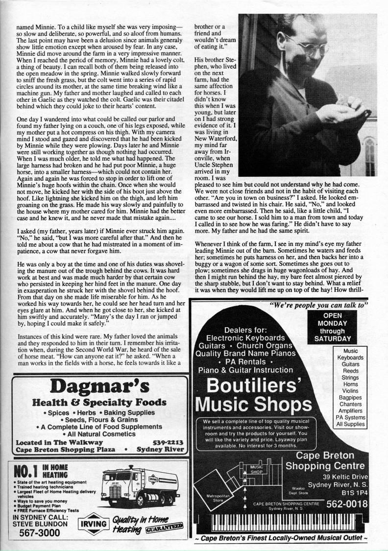 named Minnie. To a child like myself she was very imposing • so slow and deliberate, so powerful, and so aloof from humans. The last point may have been a delusion since animals generaly show httle emotion except when aroused by fear. In any case, Minnie did move around the farm in a very impressive manner. When I reached the period of memory, Minnie had a lovely colt, a thing of beauty. I can recall both of them being released into the open meadow in the spring. Minnie walked slowly forward to sniff the fresh grass, but the colt went into a series of rapid circles around its mother, at the same time breaking wind like a machine gun. My father and mother laughed and called to each other in Gaelic as they watched the colt. Gaehc was their citadel behind which they could joke to their hearts' content. One day I wandered into what could be called our parlor and found my father lying on a couch, one of his legs exposed, while my mother put a hot compress on his thigh. With my camera mind I stood and gazed and discovered tfiat he had been kicked by Minnie while tiiey were plowing. Days later he and Minnie were still working together as though nothing had occurred. When I was much older, he told me what had happened. The large hamess had broken and he had put poor Minnie, a huge horse, into a smaller hamess • which could not contain her. Again and again he was forced to stop in order to lift one of Minnie's huge hoofs within the chain. Once when she would not move, he kicked her with the side of his boot just above the hoof. Like lightning she kicked him on the thigh, and left him groaning on the grass. He made his way slowly and painfully to ??ie house where my mother cared for him. Minnie had the better case and he knew it, and he never made that mistake again.... I asked (my father, years later) if Minnie ever strack him again. "No," he said, "but I was more careful after that." And then he told me about a cow that he had mistreated in a moment of im? patience, a cow that never forgave him. He was only a boy at the time and one of his duties was shovel? ing the manure out of the trough behind the cows. It was hard work at best and was made much harder by that certain cow who persisted in keeping her hind feet in the manure. One day in exasperation he struck her with the shovel behind the hoof. From that day on she made life miserable for him. As he worked his way towards her, he could see her head tum and her eyes glare at him. And when he got close to her, she kicked at him swiftly and accurately. "Many's the day I ran or jumped by, hoping I could make it safely." Instances of this kind were rare. My father loved the animals and they responded to him in their tum. I remember his irrita? tion when, during the Second World War, he heard of the sale of horse meat. "How can anyone eat it?" he asked. "When a man works in the fields with a horse, he feels towards it like a Dagmar's Health & Specialty Foods • spices • Herbs • Baking Supplies • Seeds, Flours & Grains • A Complete Line of Food Supplements • All Natural Cosmetics Located in The Walkway 539-?2l3 I Cape Breton Shopping Plaza * Sydney River J N0.1 IN HOME HEATING • state of the art heating equipment • Trained heating technicians • Largest Fleet of Home Heating delivery • Ways to save you money • Budget Payment Plan • FREE Furnace Efficiency Tests IN SYDNEY CALL: STEVE BLUNDON I IRVING I ' _'.. 567-3000 '''5J' r'satr' i brother or a friend and wouldn't dream of eating it." His brother Ste? phen, who lived I on the next farm, had the same affection for horses. I didn't know this when I was I young, but later | on I had strong evidence of it. I I was living in I New Waterford, my mind far away from Ir? onville, when Uncle Stephen arrived in my room. I was pleased to see him but could not understand why he had come. We were not close friends and not in the habit of visiting each other. "Are you in town on business?" I asked. He looked em? barrassed and twisted in his chair. He said, "No," and looked even more embarrassed. Then he said, like a little child, "I came to see our horse. I sold him to a man from town and today I called in to see how he was faring." He didn't have to say more. My father and he had the same spirit. Whenever I think of the farm, I see in my mind's eye my father leading Minnie out of the bam. Sometimes he waters and feeds her; sometimes he puts hamess on her, and then backs her into a buggy or a wagon of some sort. Sometimes she goes out to plow; sometimes she drags in huge wagonloads of hay. And then I might ran behind the hay, my bare feet almost pierced by the sharp stubble, but I don't want to stay behind. What a relief it was when they would lift me up on top of the hay! How thriU- "We're people you can talk to" Dealers for: Electronic Keyboards Guitars • Church OrganS' Quality Brand Name Pianos • PA Rentals • n Piano & Guitar Instruction , Boutiliers' Music Shops istruments and accessories. Visit our she oom and try the products for yourself. Y( m like the variety and price. Layaway pi; available. No interest for 3 months. OPEN MONDAY through SATURDAY Music Keyboards Guitars Reeds Strings Horns Violins Chanters Amplifiers PA Systems All Supplies Cape Breton Shopping Centre 39 Keltic Drive Sydney River, N. S. B1S1P4 ''''''562-0018 TIT'mfHniHmH!!ll!!l!tlt!!miri!!! ~ Cape Breton's Finest Locally-Owned Musical Outlet ~