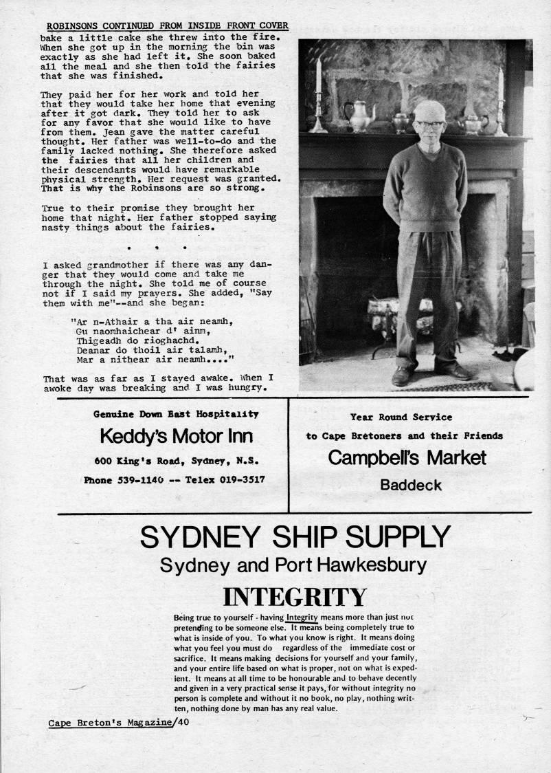 ROBINSONS CONTINUED FROM INSIDE FRONT COVER bake a little cake she threw into the fire. When she got up in the morning the bin was exactly as she had left it. She soon baked all the meal and she then told the fairies that she was finished. They paid her for her work and told her that they would take her home that evening after it got dark. They told her to ask for any favor that she would like to have frora them. Jean gave the matter careful thought. Her father was well-to-do and the family lacked nothing. She therefore asked the fairies that all her children and their descendants would have remarkable physical strength. Her request was granted. That is why the Robinsons are so strong. True to their promise they brought her horae that night. Her father stopped saying nasty things about the fairies. I asked grandmother if there was any dan? ger that they would corae and take me through the night. She told rae of course not if I said my prayers. She added, "Say them with rae" • and she began: "Ar n-Athair a tha air neamh, Gu naomhaichear d' ainm, Thigeadh do rioghachd. Deanar do thoil air talamh, Mar a nithear air neamh...." That was as far as I stayed awake. When I awoke day was breaking and I was hungry. .-w'?''' • %.w;' *. Genuine Down Bast Hospitality Keddy' Motor Inn 600 King's Road, Sydney, N.S. Phone 539-1140 • Telex 019-3517 Tear Round Service to Cape Bretoners and their Friends Campbeirs Market Baddeck SYDNEY SHIP SUPPLY Sydney and Port Hawkesbury INTEGRITY Being true to yourself - having Integrity means more than just nut pretending to be someone else. It means being completely true to what is inside of you. To what you know is right. It means doing what you feel you must do regardless of the immediate cost or sacrifice. It means making decisions for yourself and your family, and your entire life based on what is proper, not on what is exped? ient. It means at all time to be honourable and to behave decently • -' and given in a very practical sense it pays, for without integrity no F>erson is complete and without it no book, no play, nothing writ? ten, nothing done by man has any real value. Cape Breton's Magazine/40