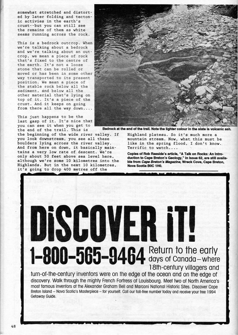 somewhat stretched and distort? ed by later folding and tecton? ic activies in the earth's crust--but you can still see the remains of them as white seams running across the rock. This is a bedrock outcrop. When we're talking about a bedrock and we're talking about an out? crop, we mean a piece of rock that's fixed to the centre of the earth. It's not a loose stone that can be rolled or moved or has been in some other way transported to its present position. We mean a piece of the stable rock below all the sediment, and below all the other material that's lying on top of it. It's a piece of the crust. And it keeps on going from there all the way down.... This just happens to be the last gasp of it. It's nice that you can see it when you get to the end of the trail. This is Bedrockattho the beginning of the wide river valley. If you look downstream, you see all these boulders lying across the river valley. And from here on down, it basically main? tains a very low rate of descent. We're only about 50 feet above sea level here, although we're some 10 kilometres into the Highlands. But in the next 10 kilometres, it's going to drop 400 metres off the end of the trail. Note the lighter colour in the slate is volcanic ash. Highland plateau. So it's much more a mountain stream. Now, what, this must be like in the spring flood, I don't know. Terrific to watch.... Copies of Rob Raeside's article, "A Talk on Rocks: An Intro? duction to Cape Breton's Geology," in issue 62, are still availa? ble from Cape Breton's Magazine, Wreck Cove, Cape Breton, Nova Scotia BOC IHO. DiSCOVERJT! l"llUll'"DbD""04"u4 d'y' of Canada-where 18th-century villagers and turn-of-the-century inventors were on the edge of the ocean and on the edge of discovery. Walk through the mighty French Fortress of Louisbourg. Meet two of North America's most famous inventors at the Alexander Graham Bell and Marconi National Historic Sites. Discover Cape Breton Island - Nova Scotia's Masterpiece - for yourself. Call our toll-free number today and receive your free 1994 Getaway Guide.
