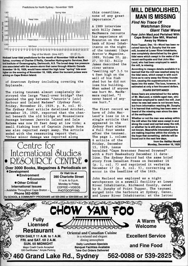 Predictions for North Sydney - November 1929 'Spring' tides Day of tiie Montii (time AST) Hindcast lunar tidal predictions for the month of November 1929 at North Sydney, courtesy of Charles O'Reilly, Canadian Hydrographic Services, Bed? ford Institute of Oceanography, Dartmouth, N.S. The broad deep low pressure zone associated with the severe storm that came through Atlantic Canada November 18-19,1929, would have raised the high lunar "spring" tide even higher on the evening of November 18,1929, when the tsunami pulses were arriving on Cape Breton Island. of downtown Sydney including covering the Esplanade. The rising tsunami almost completely de? stroyed the large "haul-over bridge" that spanned the gap between "Januvin's [sic] Harbour and Island Madame" (Sydney Post, Friday, November 22, 1929, p. 8. col. 8). The Sydney Post article datelined Arichat, November 19, 1929, reported that the chan? nel beneath the old bridge at Mousseliers Passage between Janvrin Island and Isle Madame was now 20 feet deep at low tide; a small fishing boat of Captain Joseph Bona was also reported swept away. The article ended with the reassuring report that, "Other minor damage was reported along Centre for International Studies • DEcSOUDCE CENTDE • Over 3000 Books, Magazines & Periodicals on • Development • Environment • Economic • Other Critical International Issues ~ Available Throughout Cape Breton Phone 562-6090 Or Visit Us at 390 Charlotte Street 11 a.m. to 5 p.m. Monday to Friday COFFEE • VIDEOS PHOTOCOPYING For SCHOOL & COMMUNITY PROGRAMS call 929-2063 or 539-5300 ext. 267 MILL DEMOLISHED, MAN IS MISSING Find No Trace Of Watchman Since Giant Tidal Wave Fear John MacLeod Perished With Cape Breton Saw Mill, Washed Away by Waters Point Tupper, Dec. 15 • 'Word has been re? ceived here by R. Dunphy that his saw mill, located at Lower River Inhabitants, was completely demolished by the giant tidal wave which swept in the wake of the recent earthquake and that John Mac? Leod, who had been employed to watch the mill, is missing. According to meagre details available it is learned that the mill was washed away by the tidal wave, which swept in with such force as to carry away the flimsy founda? tion, causing the superstructure to col? lapse into the water. The loss, however, is estimated at only a few thousand dollars. FEARS ENTERTAINED Grave fears are entertained for the safety of Mr. MacLeod, a middle aged man, who had been employed to watch the mill. Just when he was last seen is not known here, but from information reaching Mr. Dunphy it is learned that nothing has been seen or heard of the missing man since the date of the earthquake. Whether or not the man was asleep within the mill when the tidal wave swept in and along the coast and carried away the mill, or whether he is still alive somewhere is not known. Meanwhile interested parties are making inquiries within the vicinity in the hope that something definite will be found out in the next few days. from the Halifax Henald Monday, December 16,1929 this coastline, none of any great importance." A 1989 interview with Billy James MacNamara recounts his experience at Evanston on the east bank of River Inhab? itants on the night of the tsunami (Cape Breton's Magazine, 1989, Volume 50, pp. 27, 30-32) . Billy James described the river waters "swelling up" 3.5 to 4 feet high on the wall of his fish shed but he did not lose his building. Vflien asked if anyone was hurt Mr. MacNa? mara replied, "I never heard of any? one hurt." The first record we have of John Mac? Leod's loss is in a single article that appeared in the Sydney Post almost a full four weeks after the tsunami. The page 1, column 6 article of the Friday, December 13, 1929, issue heralded "Cape Bretoner Feared Drowned" with a Port Hawkesbury December 11 date? line. The Sydney Record had the same brief story from Canadian Press on December 16 (p. 1, col. 7) and reprinted it verbatim December 17 (p. 8, col. 5), correcting an error in the headline of the 16th. John MacLeod was employed as a night watchperson in a sawmill facility at Lower River Inhabitants, Richmond County, owned by R. Dunphy of Point Tupper. The tsunami surged into the harbours at Sydney, Canso, and Lower River Inhabitants; at the latter Fully Licensed Restaurant CflOW VAN f00 A Warm Welcome OPEN DAILY 11 A.M. to 1 A.M. FRI. and SAT. till 2 A.M. SUN. till MIDNIGHT Major Credit Cards Accepted Gift Certificates * Ample Parking Oriental and Canadian Cuisine in a relaxed and elegant dining atmosphere Daily Luncheon Specials Banquet Facilities Available Take Out Orders Delivered Excellent Service and Fine Food ' 460 Grand Lake Rd., Sydney 562-0088 or 539-2825