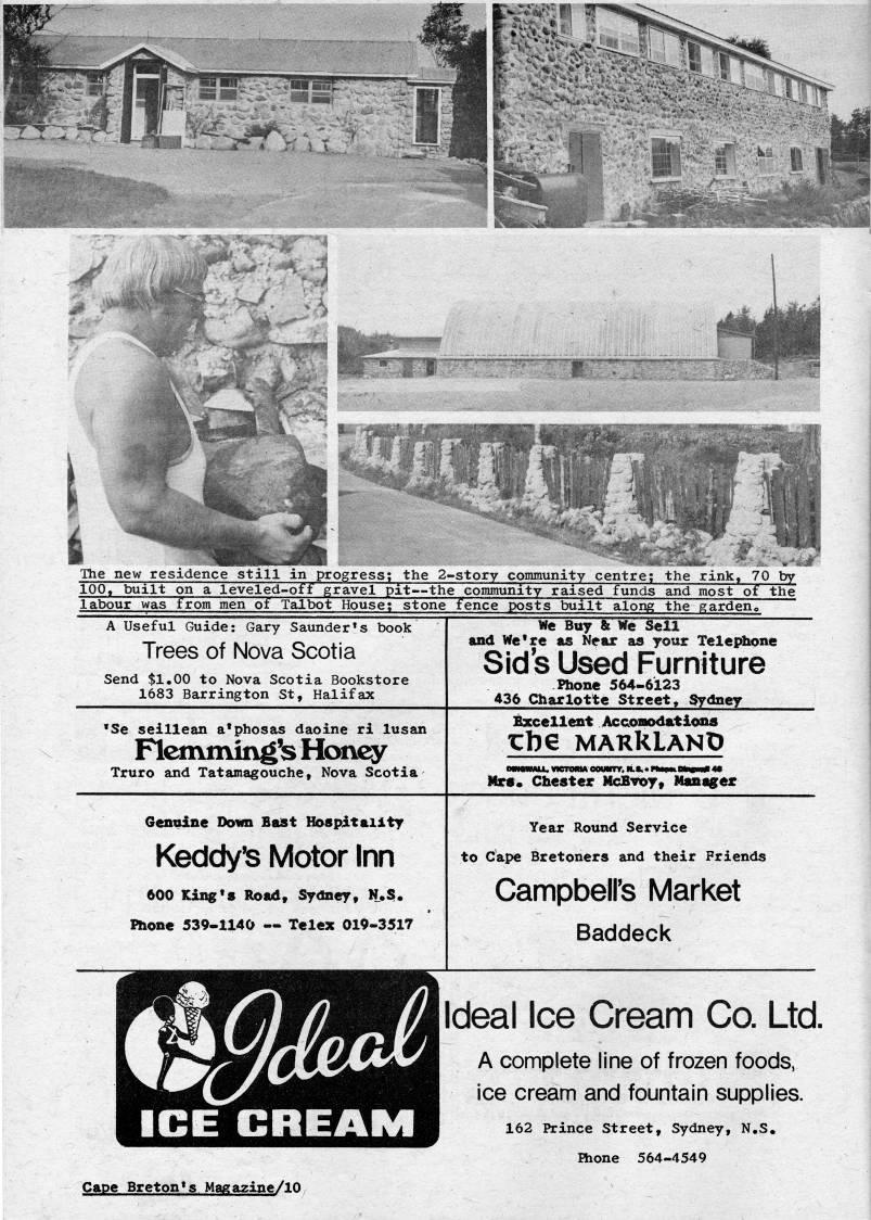 Published by Ronald Caplan on 1976/12/1 (401 reads)'??r"~' i The new residence still in progress; the 2-story community centre; the rink, 70 by 100, built on a leveled-off gravel pit • the community raised funds and most of the labour was from men of Talbot House; stone fence posts built along the garden. A Useful Guide: Gary Saunder's book Trees of Nova Scotia Send $1.00 to Nova Scotia Bookstore 1683 Barrington St' Halifax We Buy & We Sell and We're as Near as your Telephone Sid s Used Furniture Phone 564-6123 436 Charlotte Street, Sydney 'Se seillean a'phosas daoine ri lusan Flemnving's Honey Truro and Tatamagouche, Nova Scotia Bxcellent Accomodations Xhe MARklANO BwiwiAU, vicroww ooumv. w.??.? Himih vumtm* ' Mrs* Chester NcBvoTt Manager Genuine Down Bast Hospitality Keddy' Motor Inn 600 King's Road, Sydney, N.S. Fhone 539-1140 • Telex 019-3517 Year Round Service to Cape Bretoners and their Friends Campbeirs Market Baddeck Ideal Ice Cream Co. Ltd. A complete line of frozen foods, ice cream and fountain supplies. 162 Prince Street, Sydney, N.S. Hione 564-4549 Cape Breton's Magazine/lO