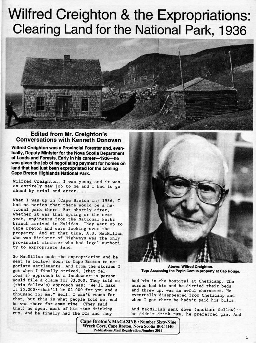 Wilfred Creighton & the Expropriations: Clearing Land for the National Park, 1936 Edited from Mr. Creighton's Conversations with Kenneth Donovan Wilfred Creighton was a Provincial Forester and, even? tually, Deputy Minister for the Nova Scotia Department of Lands and Forests. Early in his career • 1936 • he was given the job of negotiating payment for homes on land that had just been expropriated for the coming Cape Breton Highlands National Park. Wilfred Creighton: I was young and it was an entirely new job to me and I had to go ahead by trial and error.... When I was up in (Cape Breton in) 1936, I had no notion that there would be a na? tional park there. But shortly after, whether it was that spring or the next year, engineers from the National Parks branch arrived in Halifax. They went up to Cape Breton and were looking over the property. And at that time, A.S. MacMillan who was Minister of Highways was the only provincial minister who had legal authori? ty to expropriate land. So MacMillan made the expropriation and he sent (a fellow) down to Cape Breton to ne? gotiate settlements. And from the stories I got when I finally arrived, (that fel? lows 's) approach to a landowner--a person would file a claim for $3,000. They told me (this fellow's) approach was: "We'll make it $5,000--that'11 be $4,000 for you and a thousand for me." Well, I can't vouch for that, but this is what people told me. And he was there for some time. (They said that) he spent most of his time drinking rum. And he finally had the DTs and they Above: Wilfred Creighton. Top: Assessing the Pepin Camus property at Cap Rouge. had him in the hospital at Cheticamp. The nurses had him and he dirtied their beds and threw up, was an awful character. He eventually disappeared from Cheticamp and when I got there he hadn't paid his bills. And MacMillan sent down (another fellow)-- he didn't drink rum, he preferred gin. And Cape Breton's MAGAZINE • Number Sixty-Nine Wreck Cove, Cape Breton, Nova Scotia BOC IHO Publications MaU Registration Number 3014