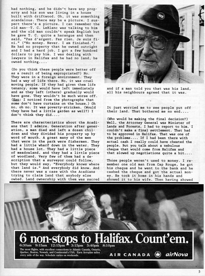 had nothing, and he didn't have any prop? erty and his son was living in a house built with driftwood. Oh, it was something scandalous. There may be a picture. I sus? pect there's a picture. I can remember the old man--T. C. LeBlanc was talking to him and the old man couldn't speak English but he gave T. C. quite a harangue and then said, "Pas d'argent. Pas rien. Je suis fi- ni." ("No money. Never. I am finished.") He had no property that he owned outright and I had a hard job. I got a few hundred dollars to pay him. I was dealing with lawyers in Halifax and he had no land, he owned nothing.... (Do you think these people were better off as a result of being expropriated?) No. They were in a foreign environment. They had a way of life there. No, it was cruel moving people. If they had given them life tenancy, some would have left immediately and as they left (others) gradually would have gone. They wouldn't be much worse off. (Ken: I noticed from the photographs that some don't have curtains on the house.) Oh no, oh no. It was poverty-stricken. (Would they have had a little garden as well?) I don't think they did.... There are characteristics about the Acadi? ans that I admire. Generation after gener? ation, a man died and left a dozen chil? dren and they divided his property up by word of mouth. A great many of the men that were in the park were fishermen. They had a little wharf down in the water. They had a house lot. They had a little piece of meadowland, and they had a little piece of woodland. Very few of them had a de? scription that a surveyor could follow, but they would say, "Everybody knows where that land is." And everybody did know. And there never was a case with the Acadians trying to claim land that anybody else owned. Land ownership with them was sacred and if a man told you that was his land, all his neighbours agreed that it was. It just worried me to see people put off their land. That bothered me no end.... (Who would be making the final decision?) Well, the Attorney General was Minister of Lands and Forests, I had to report to him. I couldn't make a final settlement. That had to be approved in Halifax. That was one of the problems.... If I had been there with actual cash I really could have cheated the people. But you talk about a nebulous cheque that would come from Halifax and that slowed up negotiations quite a bit.... Those people weren't used to money. I re? member one old man from Cap Rouge, he got his cheque and he went to the bank and he cashed the cheque and got the actual mon? ey. He took it home in his hands and showed it to his wife. Then having showed