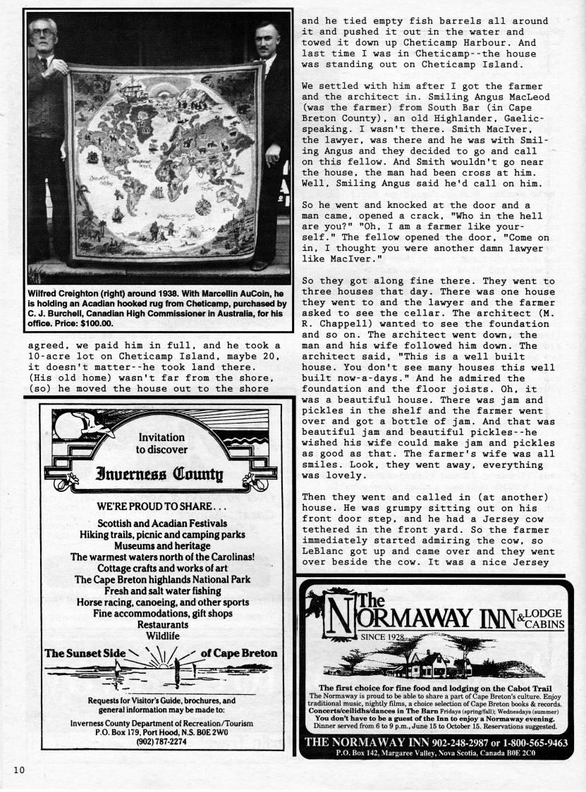 Wilfred Creighton (right) around 1938. With Marcellin AuCoin, he is holding an Acadian hooked rug from Cheticamp, purchased by C. J. Burchell, Canadian High Commissioner in Australia, for his office. Price: $100.00. agreed, we paid him in full, and he took a 10-acre lot on Cheticamp Island, maybe 20, it doesn't matter--he took land there. (His old home) wasn't far from the shore, (so) he moved the house out to the shore WERE PROUD TO SHARE... Scottish and Acadian Festivals Hiking trails, picnic and camping parks Museums and heritage The warmest waters north of the Carolinas! Cottage crafts and works of art The Cape Breton highlands National Park Fresh and salt water fishing Horse racing, canoeing, and other sports Fine accommodations, gift shops Restaurants Wildlife The Sunset Side of Cape Breton "f- Requests for Visitor's Guide, brochures, and general information may be made to: Inverness County Department of Recreation/Tourism P.O. Box 179, Port Hood, N.S. BOE 2W0 (902)787-2274 and he tied empty fish barrels all around it and pushed it out in the water and towed it down up Cheticamp Harbour. And last time I was in Cheticamp--the house was standing out on Cheticamp Island. We settled with him after I got the farmer and the architect in. Smiling Angus MacLeod (was the farmer) from South Bar (in Cape Breton County), an old Highlander, Gaelic- speaking. I wasn't there. Smith Maclver, the lawyer, was there and he was with Smil? ing Angus and they decided to go and call on this fellow. And Smith wouldn't go near the house, the man had been cross at him. Well, Smiling Angus said he'd call on him. So he went and knocked at the door and a man came, opened a crack, "Who in the hell are you?" "Oh, I am a farmer like your? self." The fellow opened the door, "Come on in, I thought you were another damn lawyer like Maclver." So they got along fine there. They went to three houses that day. There was one house they went to and the lawyer and the farmer asked to see the cellar. The architect (M. R. Chappell) wanted to see the foundation and so on. The architect went down, the man and his wife followed him down. The architect said, "This is a well built house. You don't see many houses this well built now-a-days." And he admired the foundation and the floor joists. Oh, it was a beautiful house. There was jam and pickles in the shelf and the farmer went over and got a bottle of jam. And that was beautiful jam and beautiful pickles--he wished his wife could make jam and pickles as good as that. The farmer's wife was all smiles. Look, they went away, everything was lovely. Then they went and called in (at another) house. He was grumpy sitting out on his front door step, and he had a Jersey cow tethered in the front yard. So the farmer immediately started admiring the cow, so LeBlanc got up and came over and they went over beside the cow. It was a nice Jersey lORMAWAY INN'''N's SINCE 192&K;: The first choice for fine food and lodging on the Cabot Trail The Normaway is proud to be able to share a part of Cape Breton's culture. Enjoy traditional music, nightly films, a choice selection of Cape Breton books & records. Concerts/ceilidhs/dances in The Bam Fridays (spring/fall); Wednesdays (summer) You don't have to be a guest of the Inn to enjoy a Normaway evening. Dinner served from 6 to 9 p.m., June 15 to October 15. Reservations suggested. THE NORMAWAY INN 902-248-2987 or 1-800-565-9463 P.O.Boxl42,Mar2ai