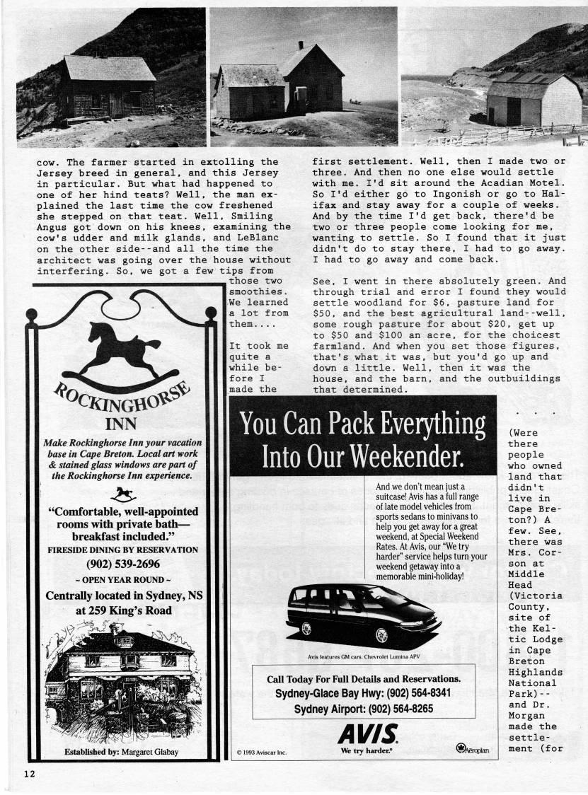 cow. The farmer started in extolling the Jersey breed in general, and this Jersey in particular. But what had happened to one of her hind teats? Well, the man ex? plained the last time the cow freshened she stepped on that teat. Well, Smiling Angus got down on his knees, examining the cow's udder and milk glands, and LeBlanc on the other side--and all the time the architect was going over the house without interfering. So, we got a few tips from • those two I smoothies. We learned a lot from them.... It took me quite a while be? fore I made the INN Make Rockinghorse Inn your vacation base in Cape Breton. Local art work & stained glass windows are part of the Rockinghorse Inn experience. "Comfortable, well-appointed rooms with private bath • breakfast included." FIRESIDE DINING BY RESERVATION (902) 539-2696 ~ OPEN YEAR ROUND ~ Centrally located in Sydney, NS at 259 King's Road first settlement. Well, then I made two or three. And then no one else would settle with me. I'd sit around the Acadian Motel. So I'd either go to Ingonish or go to Hal? ifax and stay away for a couple of weeks. And by the time I'd get back, there'd be two or three people come looking for me, wanting to settle. So I found that it just didn't do to stay there, I had to go away. I had to go away and come back. See, I went in there absolutely green. And through trial and error I found they would settle woodland for $6, pasture land for $50, and the best agricultural land--well, some rough pasture for about $20, get up to $50 and $100 an acre, for the choicest farmland. And when you set those figures, that's what it was, but you'd go up and down a little. Well, then it was the house, and the barn, and the outbuildings that determined. You Can Pack Everything Into Our Weekender. And we don't mean just a suitcase! Avis has a full range of late model vehicles from sports sedans to minivans to help you get away for a great weekend, at Special Weekend Rates. At Avis, our "We try harder" service helps turn your weekend getaway into a memorable mini-holiday! Chevrolet Lumina APV Call Today For Full Details and Reservations. Sydney-Glace Bay Hwy: (902) 564-8341 Sydney Airport: (902) 564-8265 ?? 1993 Aviscar Inc. AV/S We try harder.* (Were there people who owned land that didn't live in Cape Bre? ton?) A few. See, there was Mrs. Cor? son at Middle Head (Victoria County, site of the Kel? tic Lodge in Cape Breton Highlands National Park)-- and Dr. Morgan made the settle? ment (for