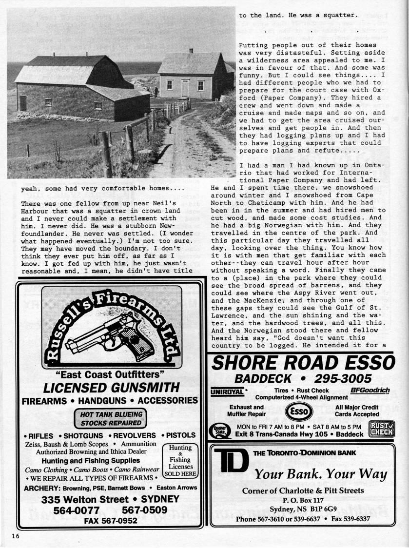 to the land. He was a squatter. yeah, some had very comfortable homes.... There was one fellow from up near Neil's Harbour that was a squatter in crown land and I never could make a settlement with him. I never did. He was a stubborn New? foundlander. He never was settled. (I wonder what happened eventually.) I'm not too sure. They may have moved the boundary. I don't think they ever put him off, as far as I know. I got fed up with him, he just wasn't reasonable and, I mean, he didn't have title ''East Coast Outfitters" LICENSED GUNSMITH FIREARMS • HANDGUNS • ACCESSORIES HOT TANK BLUEING STOCKS REPAIRED • RIFLES • SHOTGUNS • REVOLVERS • PISTOLS Zeiss, Baush & Lomb Scopes • Ammunition Authorized Browning and Ithica Dealer Hunting and Fishing Supplies Camo Clothing • Camo Boots • Camo Rainwear • WE REPAIR ALL TYPES OF FIREARMS • ARCHERY: Browning, PSE, Barnett Bows • Easton Arrows 335 Welton Street • SYDNEY 564-0077 567-0509 FAX 567-0952 Putting people out of their homes was very distasteful. Setting aside a wilderness area appealed to me. I was in favour of that. And some was funny. But I could see things.... I had different people who we had to prepare for the court case with Ox? ford (Paper Company). They hired a crew and went down and made a cruise and made maps and so on, and we had to get the area cruised our? selves and get people in. And then they had logging plans up and I had to have logging experts that could prepare plans and refute I had a man I had known up in Onta? rio that had worked for Interna? tional Paper Company and had left. He and I spent time there, we snowshoed around winter and I snowshoed from Cape North to Cheticamp with him. And he had been in in the summer and had hired men to cut wood, and made some cost studies. And he had a big Norwegian with him. And they travelled in the centre of the park. And this particular day they travelled all day, looking over the thing. You know how it is with men that get familiar with each other--they can travel hour after hour without speaking a word. Finally they came to a (place) in the park where they could see the broad spread of barrens, and they could see where the Aspy River went out, and the MacKenzie, and through one of these gaps they could see the Gulf of St. Lawrence, and the sun shining and the wa? ter, and the hardwood trees, and all this. And the Norwegian stood there and fellow heard him say, "God doesn't want this country to be logged. He intended it for a SHORE ROAD ESSO BADDECK • 29S-300S UNIRDYAL * Tires • RustCliecIc BFCoodrich ""??""' Computerized 4-Wlieel Alignment Exhaust and (ti''' ''' ''i?"" Credit Muffler Repair |g550|) cards Accepted MON to FRI 7 AM to 8 PM • SAT 8 AM to 5 PM fES'' Exit 8 Trans-Canada Hwy 105 • Baddeck I''iJ/lSul r' NN THE TbROMTO-DOMINION BANK 10 Your Bank. Your Way Corner of Charlotte & Pitt Streets P. O. Box 117 Sydney, NS B1P6G9 Phone 567-3610 or 539-6637 • Fax 539-6337 16
