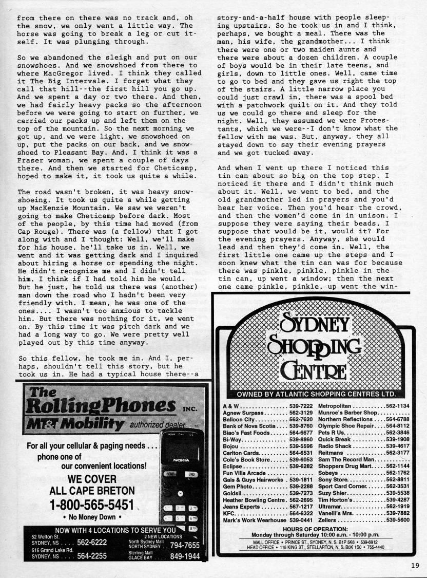 from there on there was no track and, oh the snow, we only went a little way. The horse was going to break a leg or cut it? self. It was plunging through. So we abandoned the sleigh and put on our snowshoes. And we snowshoed from there to where MacGregor lived. I think they called it The Big Intervale. I forget what they call that hill--the first hill you go up. And we spent a day or two there. And then, we had fairly heavy packs so the afternoon before we were going to start on further, we carried our packs up and left them on the top of the mountain. So the next morning we got up, and we were light, we snowshoed on up, put the packs on our back, and we snow? shoed to Pleasant Bay. And, I think it was a Fraser woman, we spent a couple of days there. And then we started for Cheticamp, hoped to make it, it took us quite a while. The road wasn't broken, it was heavy snow- shoeing. It took us quite a while getting up MacKenzie Mountain. We saw we weren't going to make Cheticamp before dark. Most of the people, by this time had moved (from Cap Rouge). There was (a fellow) that I got along with and I thought: Well, we'll make for his house, he'll take us in. Well, we went and it was getting dark and I inquired about hiring a horse or spending the night. He didn't recognize me and I didn't tell him. I think if I had told him he would. But he just, he told us there was (another) man down the road who I hadn't been very friendly with. I mean, he was one of the ones.... I wasn't too anxious to tackle him. But there was nothing for it, we went on. By this time it was pitch dark and we had a long way to go. We were pretty well played out by this time anyway. So this fellow, he took me in. And I, per? haps, shouldn't tell this story, but he took us in. He had a typical house there--a The SUMinMPIwn0$ mc 1??'JKkmB' mOm'm For all your cellular & paging needs. phone one of our convenient locations! WE COVER ALL CAPE BRETON 1-800-565-5451 • No Money Down • NOW WITH 4 LOCATIONS TO SERVE YOU story-and-a-half house with people sleep? ing upstairs. So he took us in and I think, perhaps, we bought a meal. There was the man, his wife, the grandmother... I think there were one or two maiden aunts and there were about a dozen children. A couple of boys would be in their late teens, and girls, down to little ones. Well, came time to go to bed and they gave us right the top of the stairs. A little narrow place you could just crawl in, there was a spool bed with a patchwork quilt on it. And they told us we could go there and sleep for the night. Well, they assumed we were Protes? tants, which we were--I don't know what the fellow with me was. But, anyway, they all stayed down to say their evening prayers and we got tucked away. And when I went up there I noticed this tin can about so big on the top step. I noticed it there and I didn't think much about it. Well, we went to bed, and the old grandmother led in prayers and you'd hear her voice. Then you'd hear the crowd, and then the women'd come in in unison. I suppose they were saying their beads, I suppose that would be it, would it? For the evening prayers. Anyway, she would lead and then they'd come in. Well, the first little one came up the steps and I soon knew what the tin can was for because there was pinkie, pinkie, pinkie in the tin can, up went a window; then the next one came pinkie, pinkie, up went the win- 794-7655 " 849-1944 A&W; Agnew Surpass Balloon City Bank of Nova Scotia Biao's Fast Foods Bi-Way Bojou Carlton Cards Cole's Book Store Eclipse Fun Villa Arcade Gals & Guys Hairworks . Gem Photo Goldsil Heather Bowling Centre. Jeans Experts KFC Mark's Work Wearhouse 539-7222 Metropolitan 562-1134 562-3129 Munroe's Barber Shop 562-7620 Northern Reflections 564-6788 539-8760 Olympic Shoe Repair 564-8112 564-6677 Pets R Us 562-3846 Quick Break 539-1908 Radio Shack 539-4617 564-6531 Reitmans 562-3177 539-6053 Sam The Record Man 539-6282 Shoppers Drug Mart 562-1144 Sobeys 562-1762 539-1811 Sony Store. 562-8811 539-2288 Sport Card Corner. 562-3531 539-7273 Suzy Shier 539-5538 562-2695 Tim Morton's 539-4287 567-1217 Ultramar 562-1919 564-6322 Vanelli's Mrs 539-7882 539-0441 Zellers 539-5600 HOURS OF OPERATION: Monday through Saturday 10:00 a.m. -10:00 p.m. MALL OFFICE • PRINCE ST., SYDNEY, N. S. B1P 5K6 • 539'912 HEAD OFFICE ?? 115 KING ST.. STELLARTON, N. S.BOK 180 ?? 755-4440
