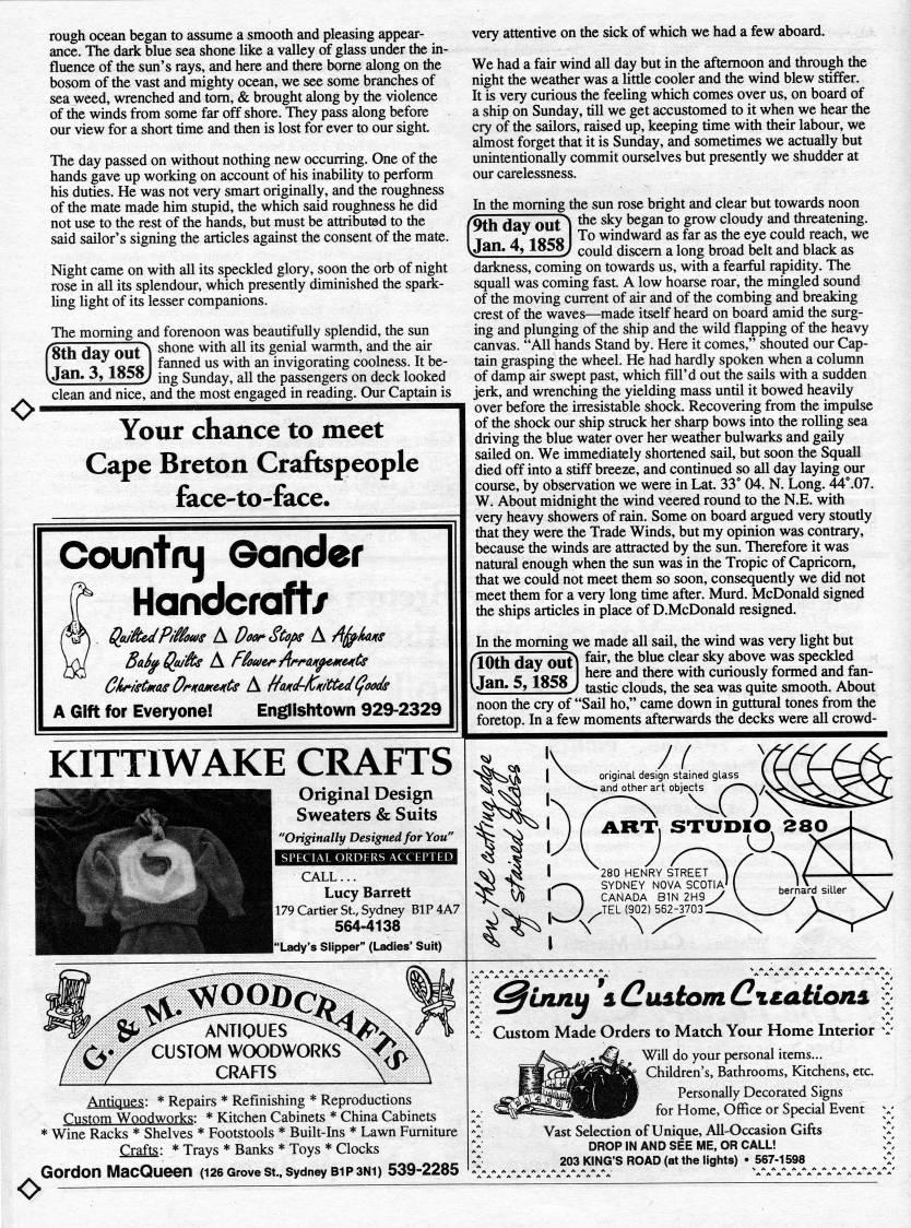 Published by Ronald Caplan on 1995/8/1 (271 reads)rough ocean began to assume a smooth and pleasing appear? ance. The dark blue sea shone like a valley of glass under the in? fluence of the sun's rays, and here and there borne along on the bosom of the vast and mighty ocean, we see some branches of sea weed, wrenched and tom, & brought along by the violence of the winds from some far off shore. They pass along before our view for a short time and then is lost for ever to our sight The day passed on without nothing new occurring. One of the hands gave up working on account of his inability to perform his duties. He was not very smart originally, and the roughness of the mate made him stupid, the which said roughness he did not use to the rest of the hands, but must be attributed to the said sailor's signing the articles against the consent of the mate. Night came on with all its speckled glory, soon the orb of night rose in all its splendour, which presently diminished the spark? ling light of its lesser companions. The morning and forenoon was beautifully splendid, the sun shone with all its genial warmth, and the air fanned us with an invigorating coolness. It be? ing Sunday, all the passengers on deck looked clean and nice, and the most engaged in reading. Our Captain is f 8th day out Ufan.3,1858 Your chance to meet Cape Breton Craftspeople face-to-face. Countnj Gander Handcraft/ lltutecfPfWms A Doc'StoffS A A'Uks Baif'Qa/iCs A Fioaief'Af'f'ait'eHts G'istmas Of'HCUKCKts A rfdHd-rCHitCed'fOods A Gift for Everyone! Englishtown 929-2329 KITTIWAKE CRAFTS Original Design Sweaters & Suits "Originally Designed for You" CALL... Lucy Barrett 179 Cartier St., Sydney BIP 4A7 564-4138 "Lady's Slipper" (Ladies' Suit) very attentive on the sick of which we had a few aboard. We had a fair wind all day but in the afternoon and through the night the weather was a little cooler and the wind blew stiffer. It is very curious the feeling which comes over us, on board of a ship on Sunday, till we get accustomed to it when we hear the cry of the sailors, raised up, keeping time with their labour, we almost forget that it is Sunday, and sometimes we actually but unintentionally commit ourselves but presently we shudder at our carelessness. In the morning the sun rose bright and clear but towards noon the sky began to grow cloudy and threatening. To windward as far as the eye could reach, we could discern a long broad belt and black as 9th day out 1 (Jan. 4,1858J darkness, coming on towards us, with a fearful rapidity. The squall was coming fast. A low hoarse roar, the mingled sound of the moving current of air and of the combing and breaking crest of the waves • made itself heard on board amid the surg? ing and plunging of the ship and the wild flapping of the heavy canvas. "All hands Stand by. Here it comes," shouted our Cap? tain grasping the wheel. He had hardly spoken when a column of damp air swept past, which fill'd out the sails with a sudden jerk, and wrenching the yielding mass until it bowed heavily over before the irresistable shock. Recovering from the impulse of the shock our ship struck her sharp bows into the rolling sea driving the blue water over her weather bulwarks and gaily sailed on. We immediately shortened sail, but soon the Squall died off into a stiff breeze, and continued so all day laying our course, by observation we were in Lat. 33? 04. N. Long. 44?.07. W. About midnight the wind veered round to the N.E. with very heavy showers of rain. Some on board argued very stoutly that they were the Trade Winds, but my opinion was contrary, because the winds are attracted by the sun. Therefore it was natural enough when the sun was in the Tropic of Capricorn, that we could not meet them so soon, consequently we did not meet them for a very long time after. Murd. McDonald signed the ships articles in place of D.McDonald resigned. In the morning we made all sail, the wind was very light but 'lOth day out' '''' '? ''"' ''''' '' above was speckled T ' 1 $i'$i ''' '' '''' ''* curiously formed and fan- jan. 5, lo'o J xsi''Q clouds, the sea was quite smooth. About noon the cry of "Sail ho," came down in guttural tones from the foretop. In a few moments afterwards the decks were all crowd- !' i>'' ANTIOUES''-