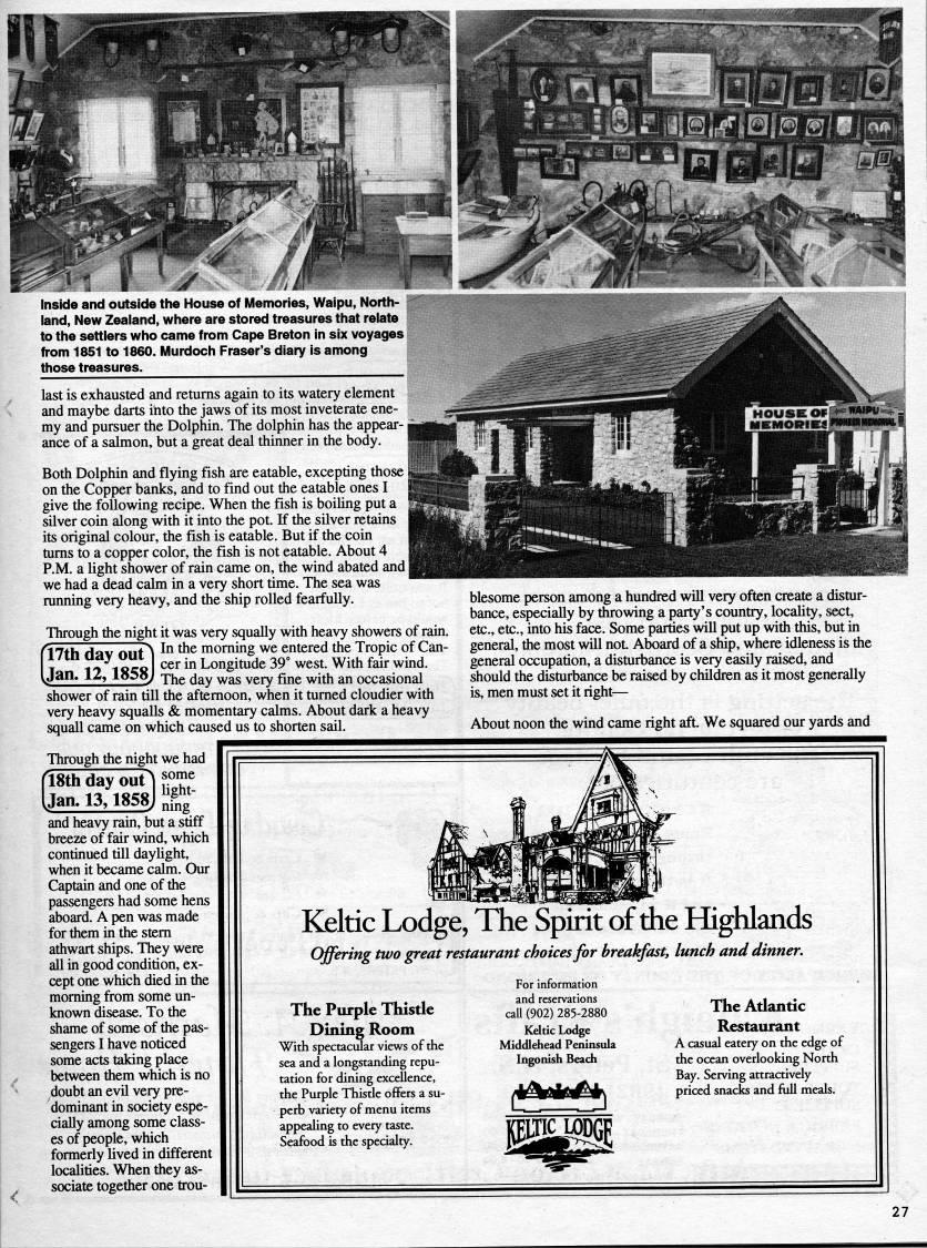 Published by Ronald Caplan on 1995/8/1 (311 reads)Inside and outside the House of Memories, Waipu, North? land, New Zealand, where are stored treasures that relate to the settlers who came from Cape Breton In six voyages from 1851 to 1860. Murdoch Fraser's diary Is among those treasures. last is exhausted and returns again to its watery element and maybe darts into the jaws of its most inveterate ene? my and pursuer the Dolphin. The dolphin has the appear- Bjigng' ance of a salmon, but a great deal thinner in the body. 'WJii Both Dolphin and flying fish are eatable, excepting those on the Copper banks, and to find out the eatable ones I give the following recipe. When the fish is boiling put a silver coin along with it into the pot. If the silver retains its original colour, the fish is eatable. But if the coin turns to a copper color, the fish is not eatable. About 4 P.M. a light shower of rain came on, the wind abated and we had a dead calm in a very short time. The sea was running very heavy, and the ship rolled fearfully. Through the night it was very squally with heavy showers of rain. (17th dav OUt' '' '' morning we entered the Tropic of Can- T 1 '7 18'8 ''' '' Longitude 39? west. With fair wind. Jan. IZ, io5oJ jYiQ ''y '' yg' f-jjjg 'j'jj 'jj occasional shower of rain till the afternoon, when it turned cloudier with very heavy squalls & momentary calms. About dark a heavy squall came on which caused us to shorten sail. Through the night we had blesome person among a hundred will very often create a distur? bance, especially by throwing a party's country, locality, sect, etc., etc., into his face. Some parties wiU put up with this, but in general, the most will not. Aboard of a ship, where idleness is the general occupation, a disturbance is very easily raised, and should the disturbance be raised by children as it most generally is, men must set it right • About noon the wind came right aft. We squared our yards and 18th day out' ?.''f Uan. 13,1858J ''''" nmg and heavy rain, but a stiff breeze of fair wind, which continued till daylight, when it became calm. Our Captain and one of the passengers had some hens aboard. A pen was made for them in the stem athwart ships. They were all in good condition, ex? cept one which died in the morning from some un? known disease. To the shame of some of the pas? sengers I have noticed some acts taking place between them which is no doubt an evU very pre? dominant in society espe? cially among some class? es of people, which formerly lived in different localities. When they as? sociate together one trou- Keltic Lodge, The Spirit of the Highlands Offering two great restaurant choices for breakfast, lunch and dinner. The Purple Thistle Dining Room With spectacular views of the sea and a longstanding repu? tation for dining excellence, the Purple Thisde offers a su? perb variety of menu items appealing to every taste. Seafood is the specialty. For information and reservations call (902) 285-2880 Keltic Lot'e Middiehead Peninsula Ingonish Beach The Atlantic Restaurant A casual eatery on the edge of the ocean overlooking North Bay. Serving attractively priced snacks and full meals. KBIJjy'DGF. 27