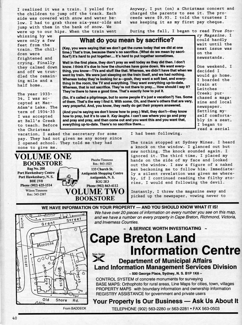 Published by Ronald Caplan on 1995/8/1 (195 reads)I realized it was a train. I yelled for the children to jump off the track. Each side was covered with snow and water be? low. I had to grab three six-year-olds and jump with them in the bank of snow. We were up to our hips. When the train went whizzing by we were only a few feet from the train. The chil? dren were frightened and crying. Finally they calmed down and off we trun? dled the remain? ing mile and a half home. Anyway, I put (on) a Christmas concert and charged the parents to see it. The pro? ceeds were $9.95. I told the trustees I was keeping it as my first pay cheque. During the fall, I began to read True Sto? ry Magazine. 1 could hardly wait until the next issue was on the newsstands. What do you mean by sacrifice? (Kay, you were saying that we don't get the cures today that we did at one time.) That's true, because there's no sacrifice. (What do we mean by sacri? fice?) It's hard to put together.... It's hard to put together sometimes. Well in the first place, they don't pray as well today as they did then. I don't know. I think it's due to how the churches have gone down. We want every? thing, you know • TVs and stuff like that. Whereas, we didn't have that when we went by train. We were just sleeping on the train itself, and we had nothing. Whereas today they're looking for a • gosh, they want a soft bed, and every? thing In the room, the TV and everything. They want everything up-to-date. Whereas, that is not sacrifice. They're not there to pray.... How should I say it? They're there to have a good time. That's exactly how to put it. The year 1933- 34, I was ac? cepted at Mac- Adam's Lake. The term of 1934-35 I was accepted at Ball's Creek to teach. Before the Christmas vacation, I asked the secretary for some pay. They had not given me any money since I opened school. They told me they had none to give me. (So, it's called a pilgrimage, but to some people it's just a vacation?) Yes. Some of them. That's the way I find it. With some. Oh, and there's others that are very, very prayerful. And, you know, they really do get their prayers answered. (And you're saying we don't know how to pray.) Well, they don't-'hey know how to pray, but it's to use it. Kay laughs. I can't see where you go and pray and pray and pray, and then come out and you want this and you want that, everything up-to-date. There's no sacrifice there.... One weekend, I decided I would go home. I boarded the train at Leitches Creek; pur? chased a maga? zine and local newspaper. Settling my? self comforta? bly in a seat, I began to read a serial I had been following. VOLUME ONE BOOKSTORE Bag No. 200 Port Hawkesbury Centre Port Hawkesbury, N. S. Phoebe Timmons Res.: 863-1825 BOE 2V0 Phone (902) 625-1514 Wilson Timmons Res.: 345-2387 133 Church St. Antigonish Shopping Centre Antigonish, N. S. B2G 2E3 Phone (902) 863-4112 VOLUME TWO BOOKSTORE The train stopped at Sydney Mines. I heard a knock on the window. I glanced out but saw nothing. The knock sounded again. I ignored it. The third time, I placed my hands on the side of my face and looked out the window. I saw a figure of a naked man beckoning me to follow him. Immediate? ly a silent revelation was given me where? by, if I continued reading the filthy sto? ries, I would end following the devil. Instantly, I threw the magazine away and picked up the newspaper, vowing never to WE HAVE INFORMATION ON YOUR PROPERTY • AND YOU SHOULD KNOW WHAT IT IS! We have over 20 pieces of information on every number you see on this map, and we have a number on every property in Cape Breton, Richmond, Victoria, and Inverness Counties. ~ A SERVICE WORTH INVESTIGATING ~ Cape Breton Land Information Centre '' Department of Municipal Affairs Land Information Management Services Division ~ 500 George Place, Sydney, N. S. B1P 1K6 ~ CONTROL SYSTEM of concrete monuments for surveying BASE MAPS: Orthophoto for rural areas, Line Maps for cities, town, villages PROPERTY MAPS with boundary information and ownership information REGISTRY ASSISTANCE for government and private users Your Property Is Our Business • Ask Us About It TELEPHONE (902) 563-2280 or 563-2281 • FAX 563-0503 From BADDECK