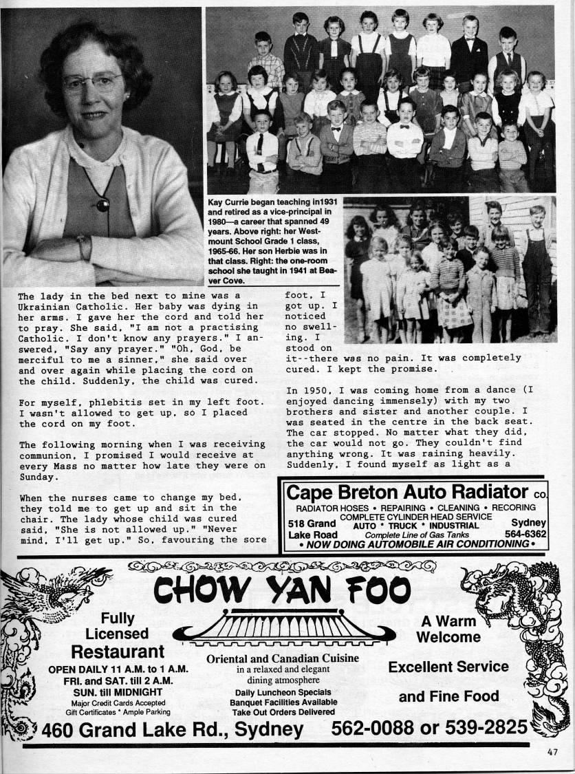 Published by Ronald Caplan on 1995/8/1 (222 reads)The lady in the bed next to mine was a Ukrainian Catholic. Her baby was dying in her arms. I gave her the cord and told her to pray. She said, "I am not a practising Catholic. I don't know any prayers." I an? swered, "Say any prayer." "Oh, God, be merciful to me a sinner," she said over and over again while placing the cord on the child. Suddenly, the child was cured. For myself, phlebitis set in my left foot. I wasn't allowed to get up, so I placed the cord on my foot. The following morning when I was receiving communion, I promised I would receive at every Mass no matter how late they were on Sunday. When the nurses came to change my bed, they told me to get up and sit in the chair. The lady whose child was cured said, "She is not allowed up." "Never mind, I'll get up." So, favouring the sore foot, I got up. noticed no swell? ing. I stood on it--there was no pain. It was completely cured. I kept the promise. In 1950, I was coming home from a dance (I enjoyed dancing immensely) with my two brothers and sister and another couple. I was seated in the centre in the back seat. The car stopped. No matter what they did, the car would not go. They couldn't find anything wrong. It was raining heavily. Suddenly, I found myself as light as a Cape Breton Auto Radiator co RADIATOR HOSES • REPAIRING • CLEANING • RECORING r-?' ' COMPLETE CYLINDER HEAD SERVICE _' 1 518 Grand auto • truck * industrial Sydney Lake Road Complete Line of Gas Tanks 564-6362 • NOW DOING AUTOMOBILE AIR CONDITIONING • C??OW VAN f 00 Restaurant A Warm Welcome OPEN DAILY 11 A.M. to 1 A.M. FRL and SAT. till 2 A.M. SUN. till MIDNIGHT vViV"" Major Credit Cards Accepted Gift Certificates * Ample Parking Oriental and Canadian Cuisine in a relaxed and elegant dining atmosphere Dally Luncheon Specials Banquet Facilities Available Take Out Orders Delivered Excellent Service and Fine Food ' 460 Grand Lake Rd., Sydney 562-0088 or 539-2825