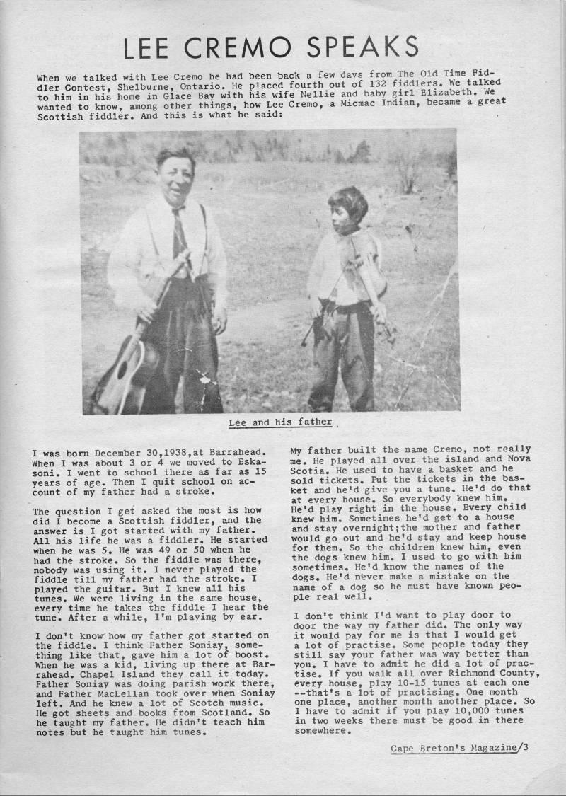 He placed fourth out of 132 fiddlers. We talked to him in his home in Glace Bay with his wife Nellie and baby girl Elizabeth, We wanted to know, among other things, how Lee Cremo, a Micmac Indian, became a great Scottish fiddler. And this is what he said: 'es and his I was born December 30,1938, at Barrahead. When I was about 3 or 4 we moved to Eskasoni, I went to school there as far as 15 years of age. Then I quit school on account of my father had a stroke. The question I get asked the most is how did I become a Scottish fiddler, and the answer is I got started with my father. All his life he was a fiddler. He started when he was 5, He was 49 or 50 when he had the stroke. So the fiddle was there, nobody was using it. I never played the fiddle till my father had the stroke. I played the guitar. But I knew all his tunes. We were living in the same house, every time he takes the fiddle I hear the tune. After a while, I'm playing by ear. I don't know how my father got started on the fiddle. I think Father Soniay, some? thing like that, gave him a lot of boost. When he was a kid, living up there at Bar? rahead, Chapel Island they call it tqday. Father Soniay was doing parish work there, and Father MacLellan took over when Soniay left. And he knew a lot of Scotch music. He got sheets and books from Scotland. So he taught my father. He didn't teach him notes but he taught him tunes. My father built the name Cremo, not really me. He played all over the island and Nova Scotia. He used to have a basket and he sold tickets. Put the tickets in the bas? ket and he'd give you a tune. He'd do that at every house. So everybody knew him. He'd play right in the house. Every child knew him. Sometimes he'd get to a house and stay overnight; the mother and father would go out and he'd stay and keep house for them. So the children knew him, even the dogs knew him. I used to go with him sometimes. He'd know the names of the dogs. He'd nfever make a mistake on the name of a dog so he must have known peo? ple real well. I don't think I'd want to play door to door the way ray father did. The only way it would pay for me is that I would get a lot of practise. Some people today they still say your father was way better than you. I have to admit he did a lot of practise. If you walk all over Richmond County, every house, pl:iy 10-15 tunes at each one • that's a lot of practising. One month one place, another month another place. So I have to admit if you play 10,000 tunes in two weeks there must be good in there somewhere. Cape Breton*s Maga2ine/3
