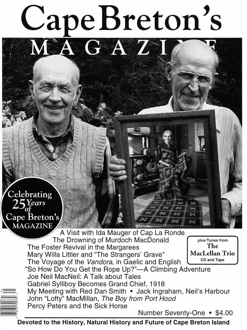 • With Ida Mauger of Cap La Ronde • The Drowning of Murdoch MacDonald • The Foster Revival in the Margarees • Mary Willa Littler and "The Strangers' Grave" • Voyage of the Vandora tp St. Pierre in Gaelic from MacTalla 1900, translated into English by Kay MacDonald • "So How Do You Get The Rope Up"? Rock Climbing in Northern Cape Breton • Joe Neil MacNeil: A Talk about Tales • Gabriel Sylliboy Becomes Grand Chief, 1918 • My Meeting with Red Dan Smith • Jack Ingraham, Neil's Harbour • "Lofty" MacMillan: A Taste of His Life From His New Autobiography The Boy from Port Hood • Percy Peters and the Sick Horse • Jack Ingraham, Neil's Harbour • Tunes from "The MacLellan Trio"!
