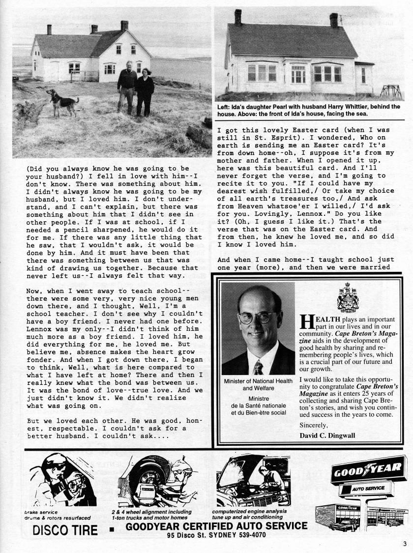 Published by Ronald Caplan on 1996/12/1 (421 reads)(Did you always know he was going to be your husband?) I fell in love with him--I don't know. There was something about him. I didn't always know he was going to be my husband, but I loved him. I don't under? stand, and I can't explain, but there was something about him that I didn't see in other people. If I was at school, if I needed a pencil sharpened, he would do it for me. If there was any little thing that he saw, that I wouldn't ask, it would be done by him. And it must have been that there was something between us that was kind of drawing us together. Because that never left us--I always felt that way. Now, when I went away to teach school-- there were some very, very nice young men down there, and I thought. Well, I'm a school teacher. I don't see why I couldn't have a boy friend. I never had one before. Lennox was my only--I didn't think of him much more as a boy friend. I loved him, he did everything for me, he loved me. But believe me, absence makes the heart grow fonder. And when I got down there, I began to think. Well, what is here compared to what I have left at home? There and then I really knew what the bond was between us. It was the bond of love--true love. And we just didn't know it. We didn't realize what was going on. But we loved each other. He was good, hon? est, respectable. I couldn't ask for a better husband. I couldn't ask.... Left: Ida's daughter Pearl with husband Harry Whittier, behind the house. Above: the front of Ida's house, facing the sea. I got this lovely Easter card (when I was still in St. Esprit). I wondered. Who on earth is sending me an Easter card? It's from down home--oh, I suppose it's from my mother and father. When I opened it up, here was this beautiful card. And I'll never forget the verse, and I'm going to recite it to you. "If I could have my dearest wish fulfilled,/ Or take my choice of all earth's treasures too,/ And ask from Heaven whatsoe'er I willed,/ I'd ask for you. Lovingly, Lennox." Do you like it? (Oh, I guess I like it.) That's the verse that was on the Easter card. And from then, he knew he loved me, and so did I know I loved him. And when I came home--I taught school just one year (more), and then we were married Minister of National Health and Welfare Ministre de la Sante nationale et du Bien-etre social HEALTH plays an important part in our lives and in our community. Cape Breton's Maga? zine aids in the development of good health by sharing and re? membering people's lives, which is a crucial part of our future and our growth. I would like to take this opportu? nity to congratulate Cape Breton's Magazine as it enters 25 years of collecting and sharing Cape Bre? ton's stories, and wish you contin? ued success in the years to come. Sincerely, David C. Dingwall 600l??/y?'*l t/rakf! service arurrts & rotors resurfaced DISCO TIRE 2&4 wheel alignment including 1-ton trucks and motor homes computerized engine analysis tune up and air conditioning GOODYEAR CERTIFIED AUTO SERVICE 95 Disco St. SYDNEY 539-4070